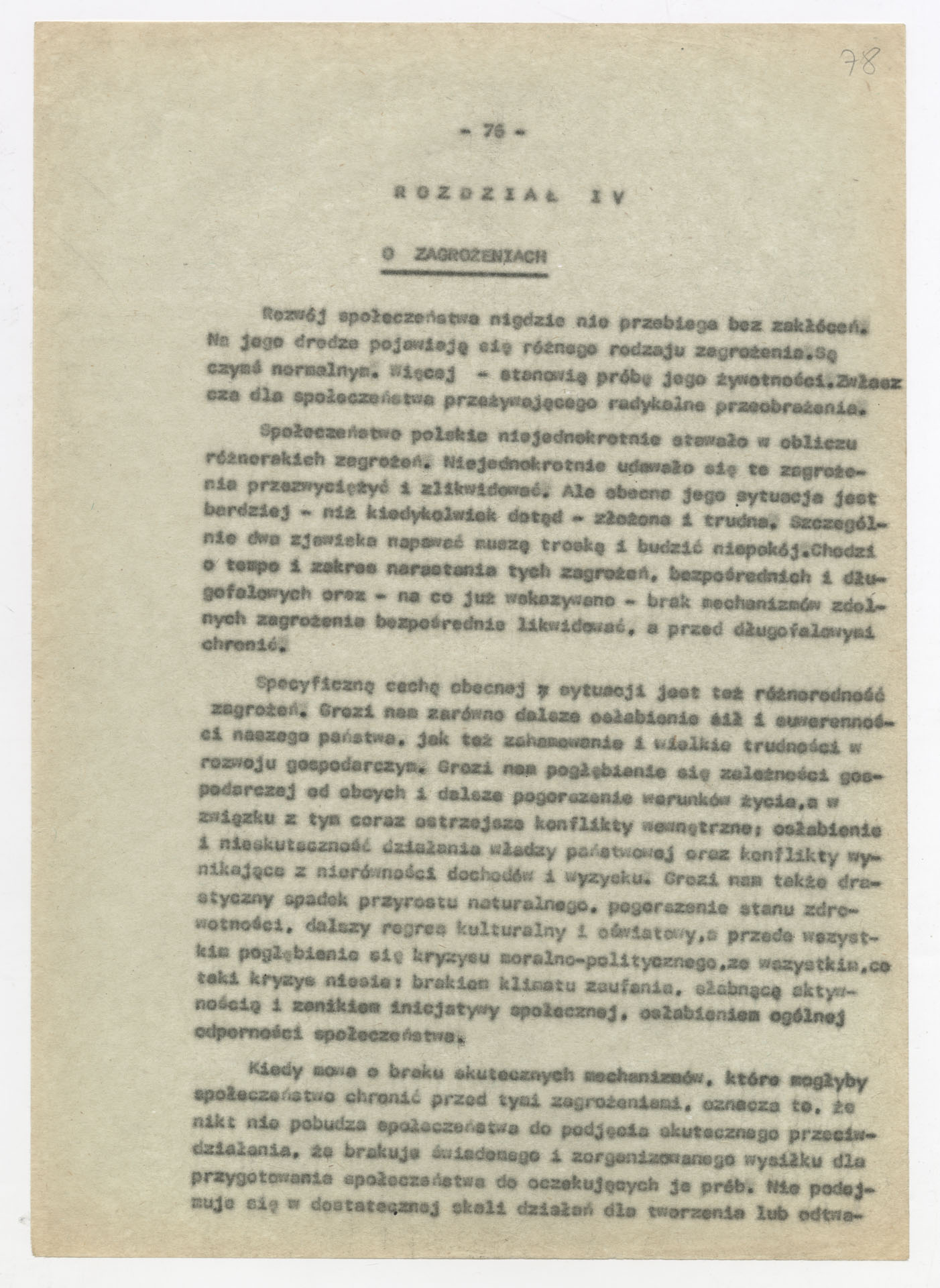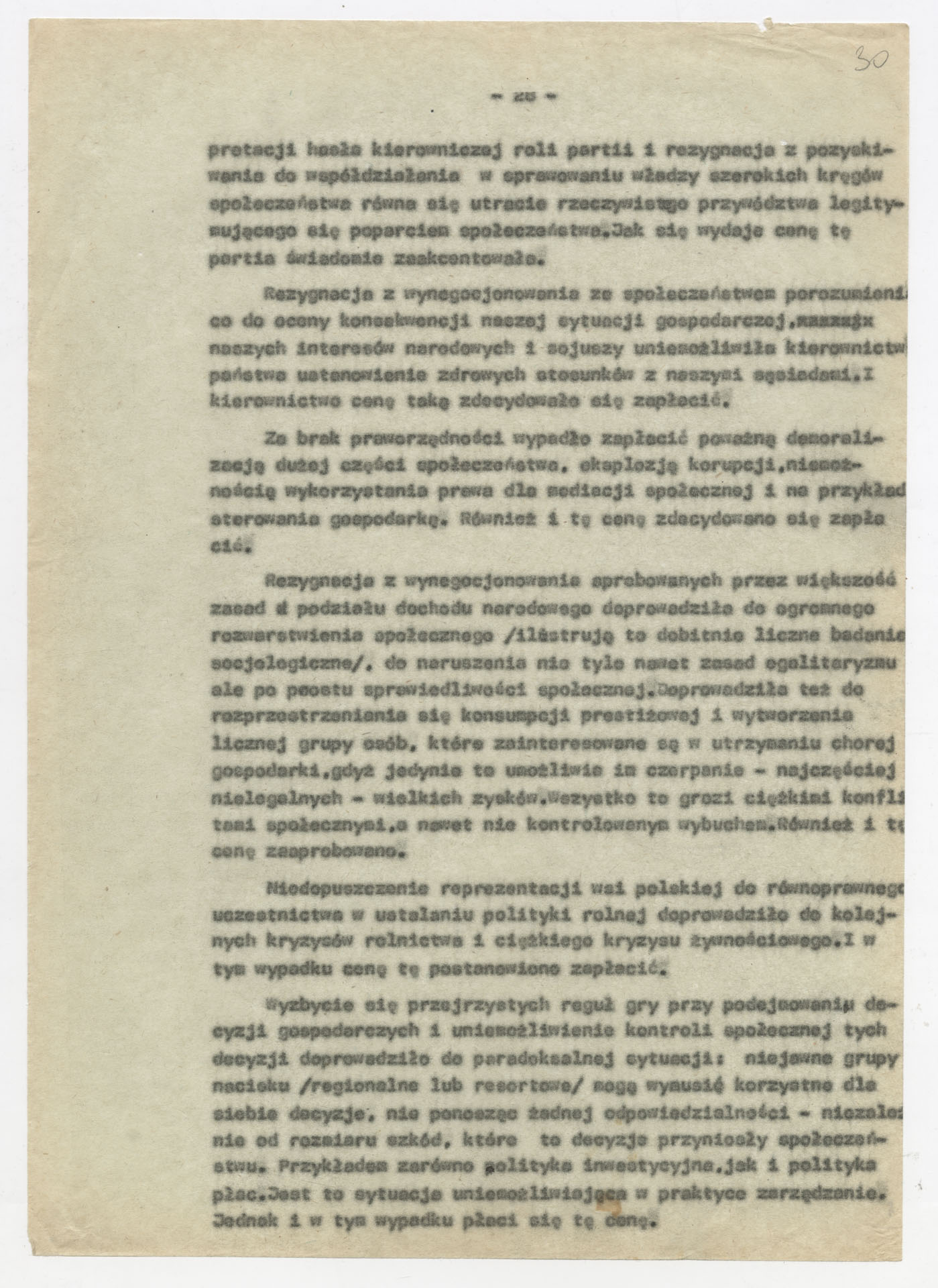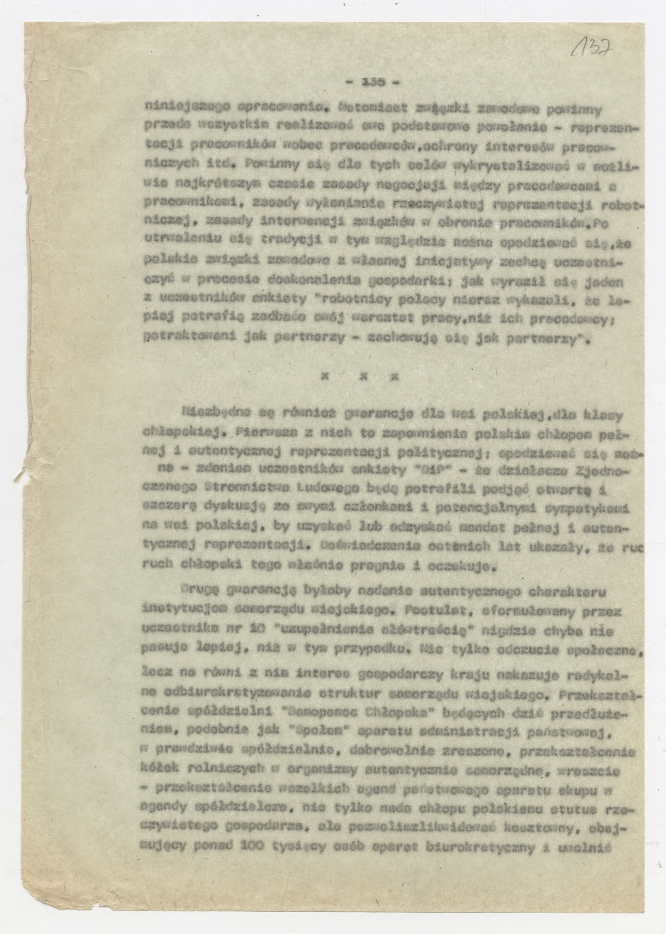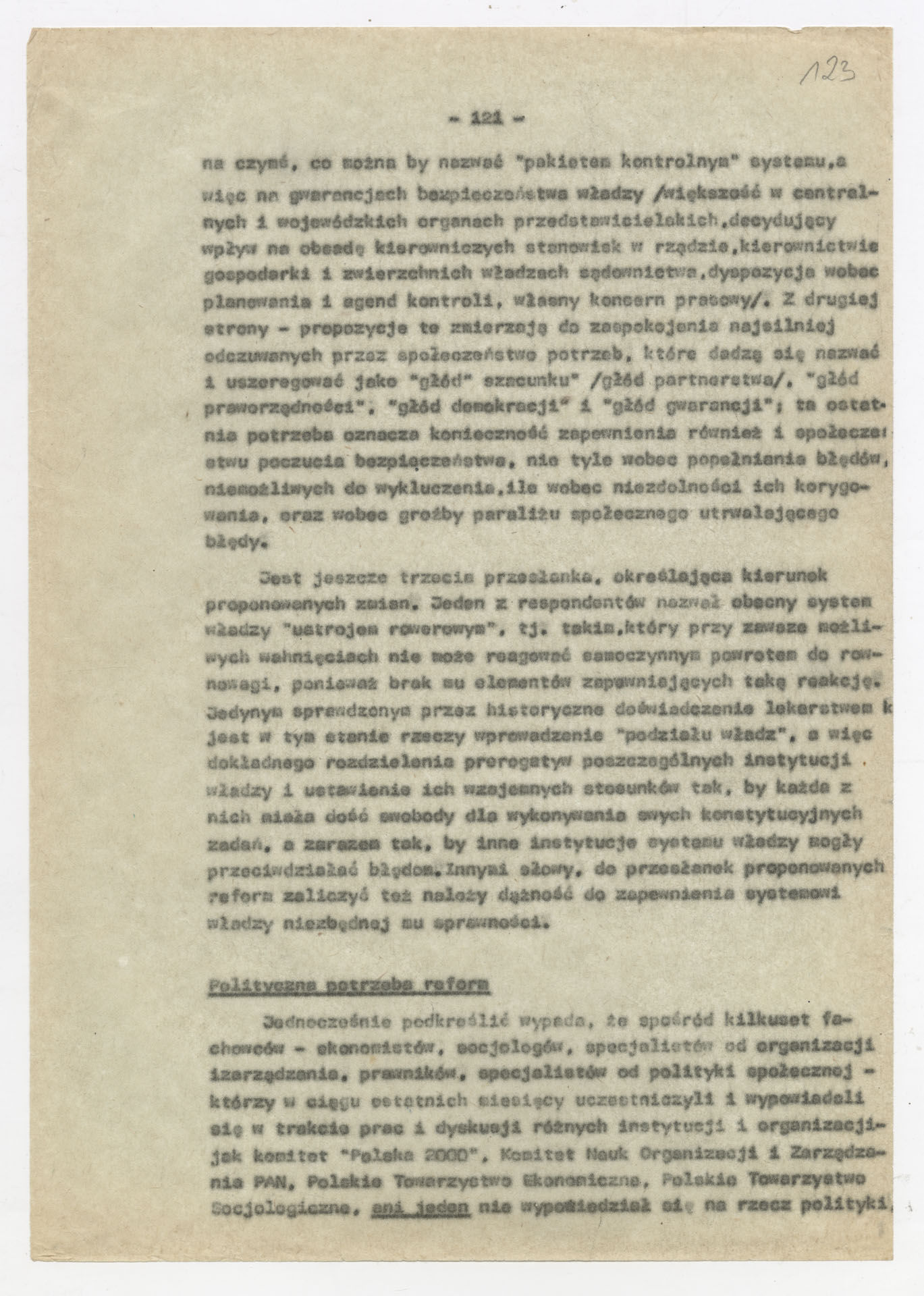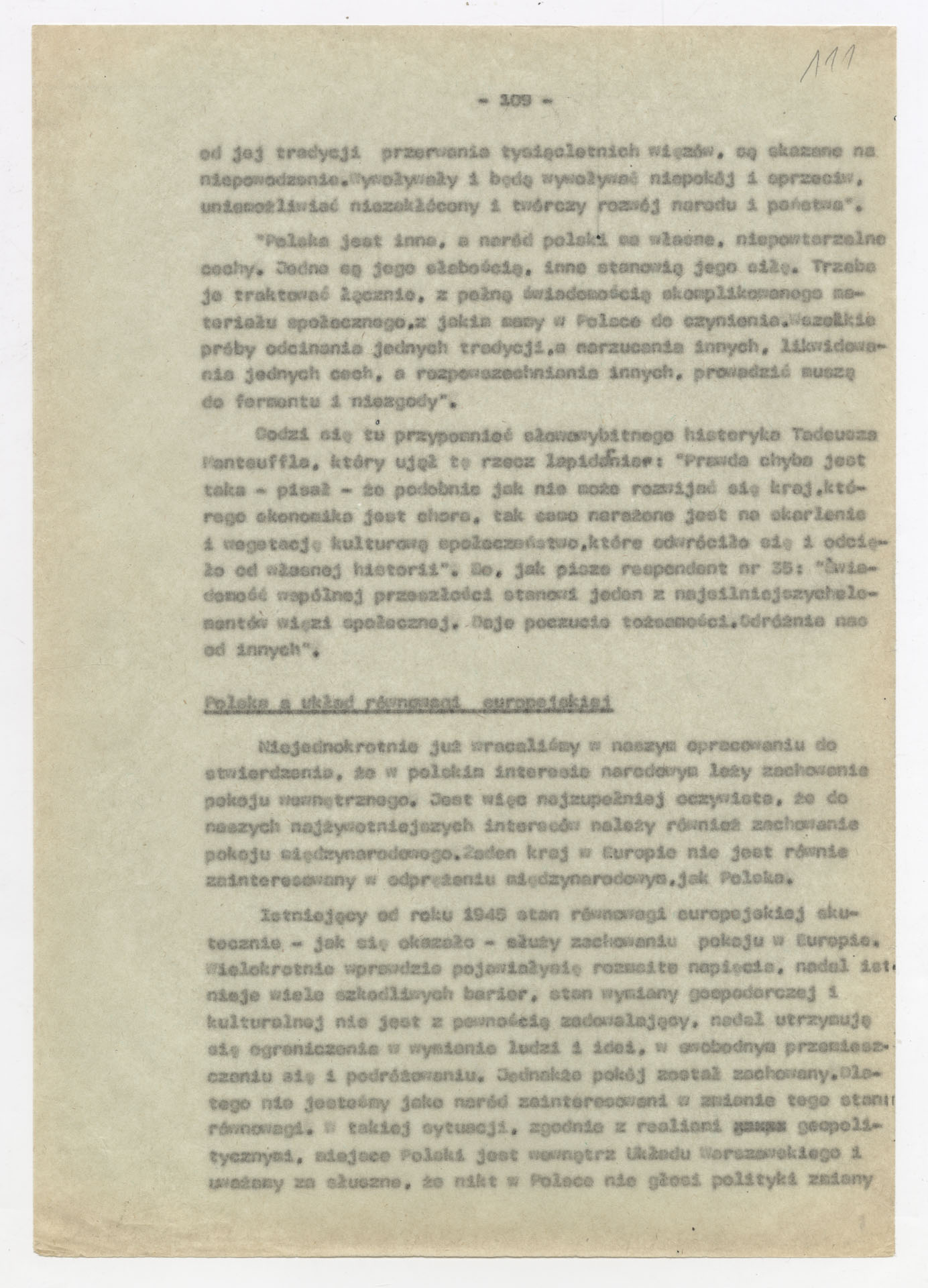 Maszynopis z opracowaniem wyników ankiety środowiskowej dotyczącej sytuacji społeczno-politycznej i kulturalnej w Polsce, związanej z pracami konwersatorium “Doświadczenie i przyszłość”. Tekst ma postać eseju analitycznego, podzielonego na części poświęcone diagnozie kryzysu gospodarczego, mechanizmom władzy, relacjom państwo-partia-społeczeństwo oraz kondycji środowisk twórczych i inteligenckich. Autorzy omawiają przyczyny narastającej frustracji i bierności, wskazują na niespójność oficjalnej polityki kulturalnej, centralizm decyzyjny i rozbieżność między deklaracjami a praktyką. W dalszych fragmentach formułują postulaty zmian: zwiększenia udziału obywateli w podejmowaniu decyzji, otwarcia debaty publicznej, odejścia od propagandowego języka i stworzenia realnych warunków rozwoju kultury. Dokument ma charakter roboczej ekspertyzy programowej, przygotowanej jako baza do dalszych dyskusji i działań.