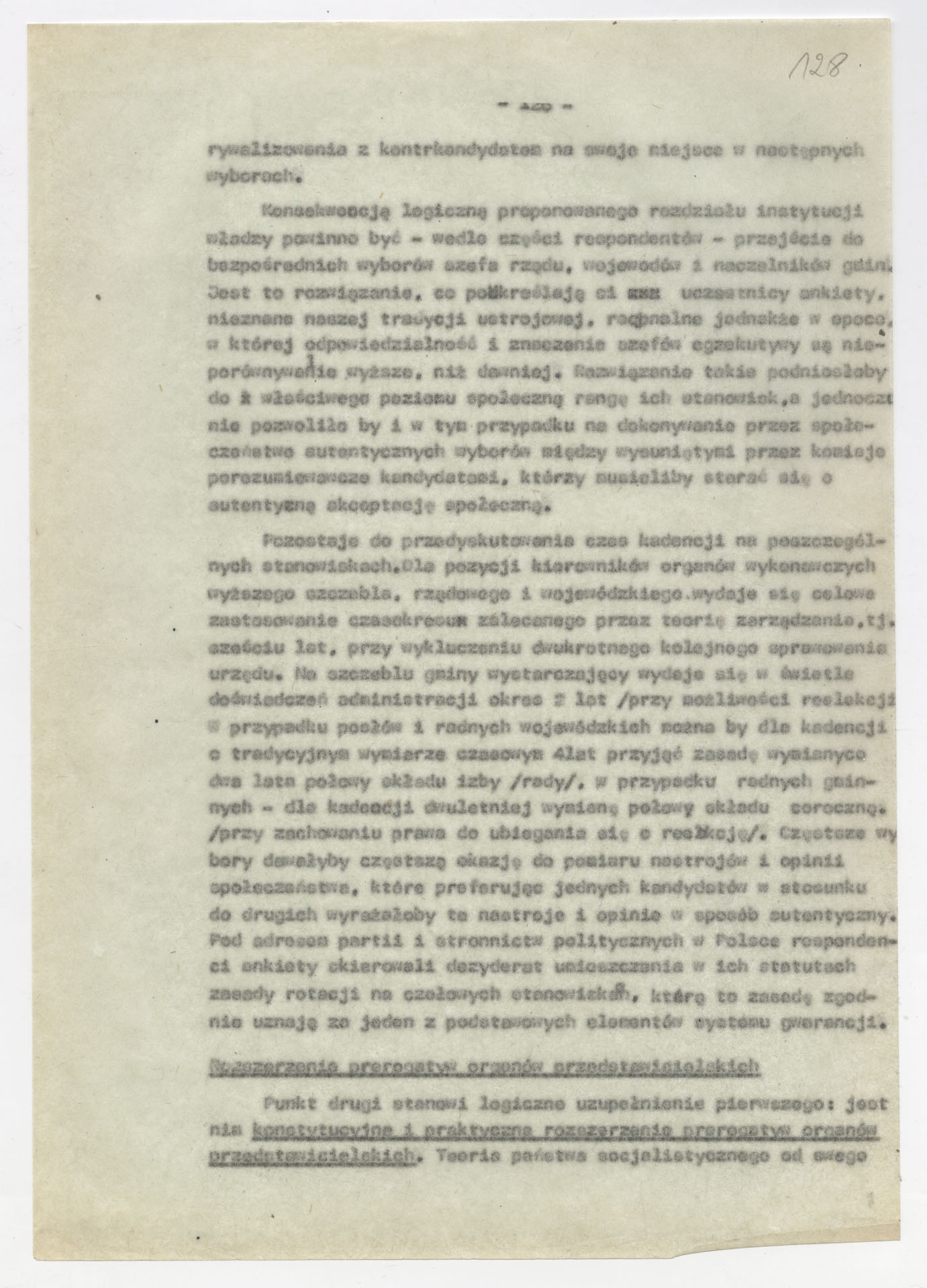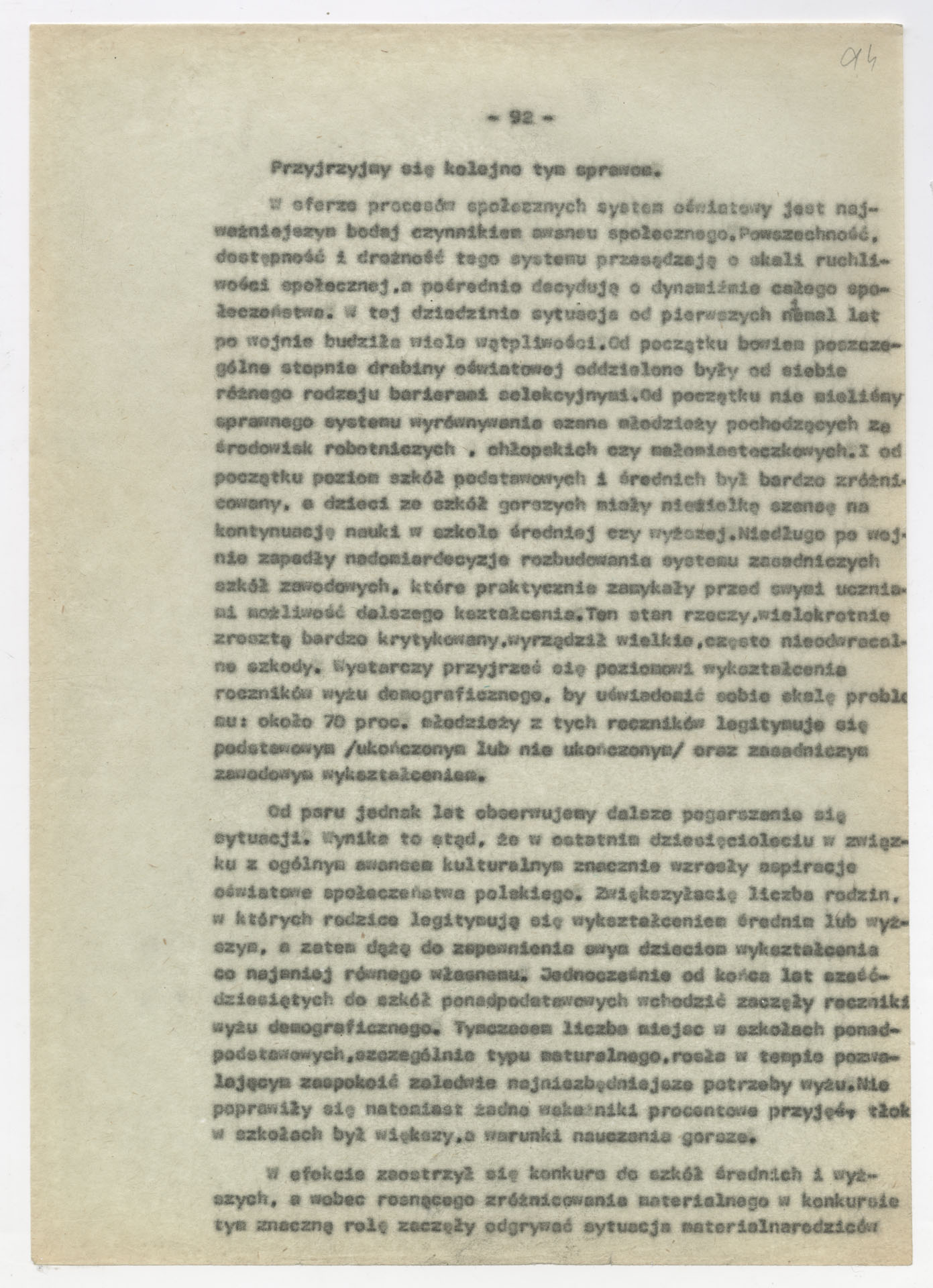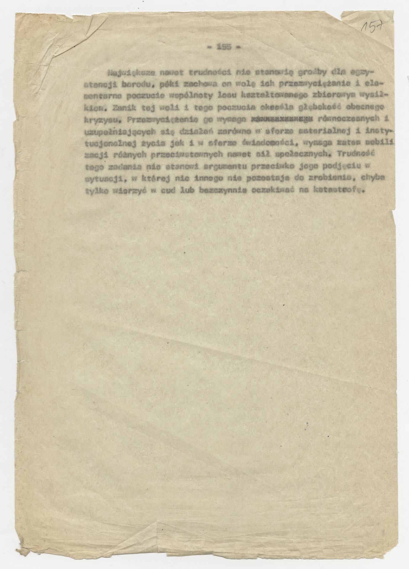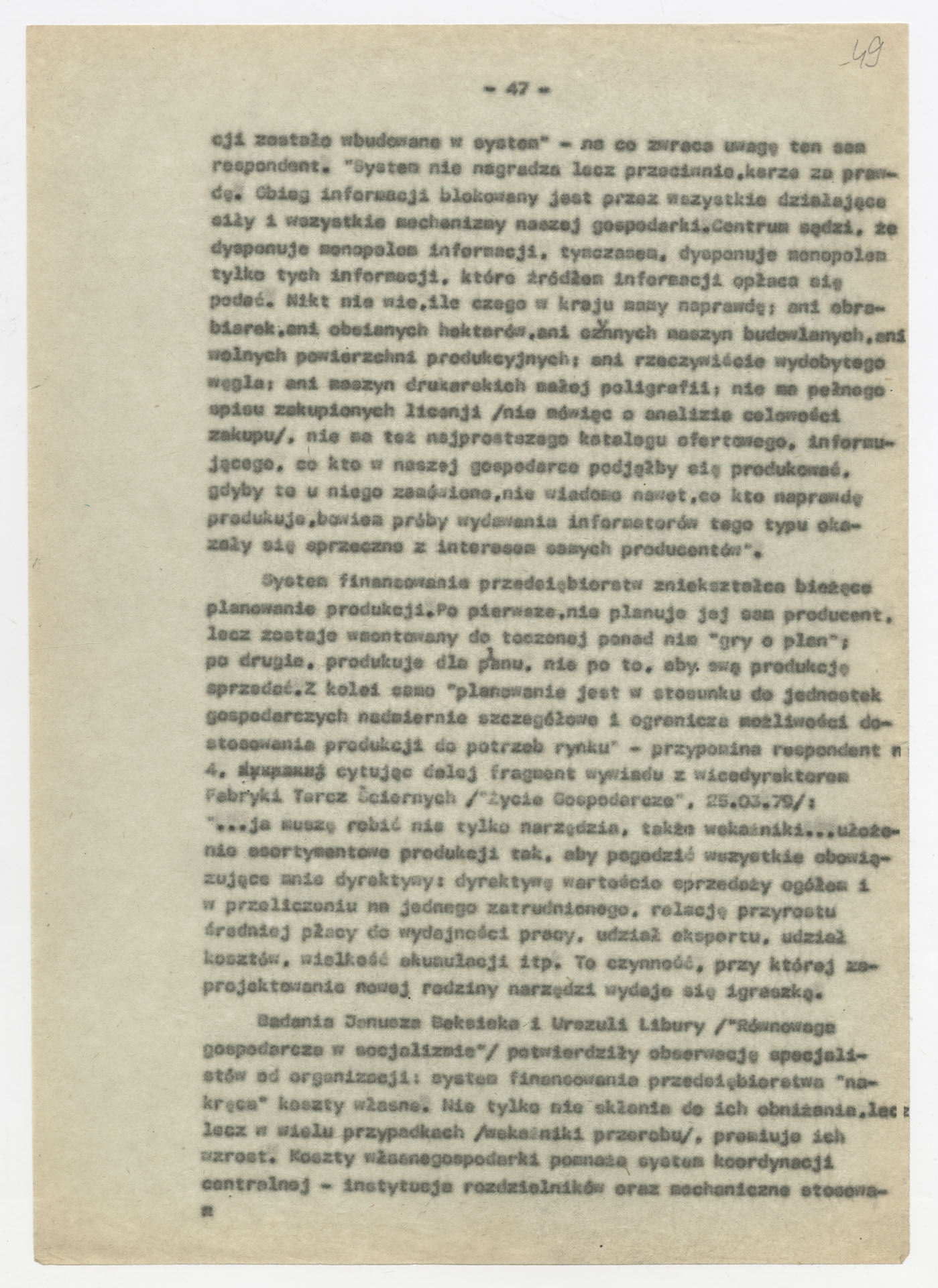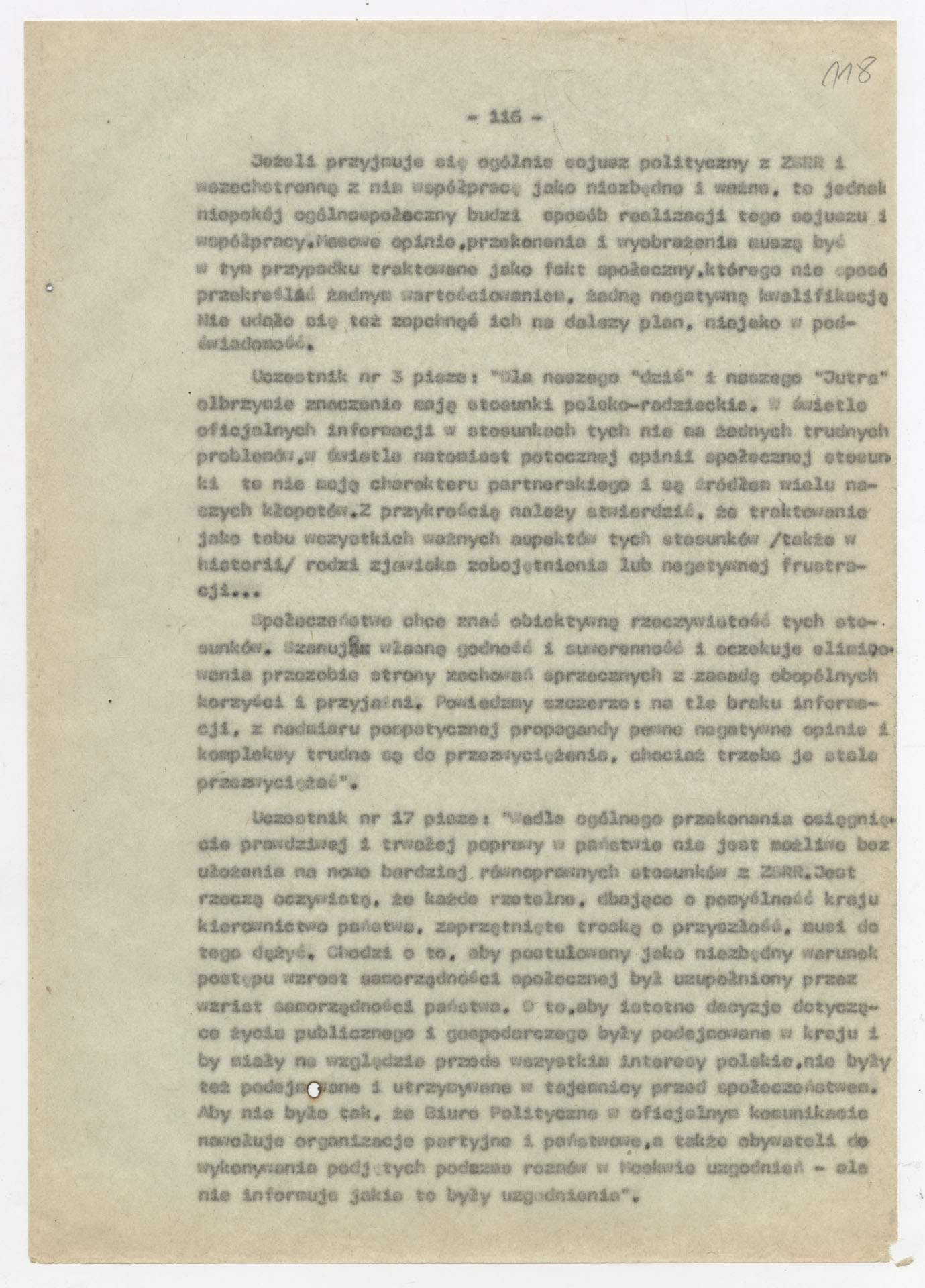 Maszynopis z opracowaniem wyników ankiety środowiskowej dotyczącej sytuacji społeczno-politycznej i kulturalnej w Polsce, związanej z pracami konwersatorium “Doświadczenie i przyszłość”. Tekst ma postać eseju analitycznego, podzielonego na części poświęcone diagnozie kryzysu gospodarczego, mechanizmom władzy, relacjom państwo-partia-społeczeństwo oraz kondycji środowisk twórczych i inteligenckich. Autorzy omawiają przyczyny narastającej frustracji i bierności, wskazują na niespójność oficjalnej polityki kulturalnej, centralizm decyzyjny i rozbieżność między deklaracjami a praktyką. W dalszych fragmentach formułują postulaty zmian: zwiększenia udziału obywateli w podejmowaniu decyzji, otwarcia debaty publicznej, odejścia od propagandowego języka i stworzenia realnych warunków rozwoju kultury. Dokument ma charakter roboczej ekspertyzy programowej, przygotowanej jako baza do dalszych dyskusji i działań.