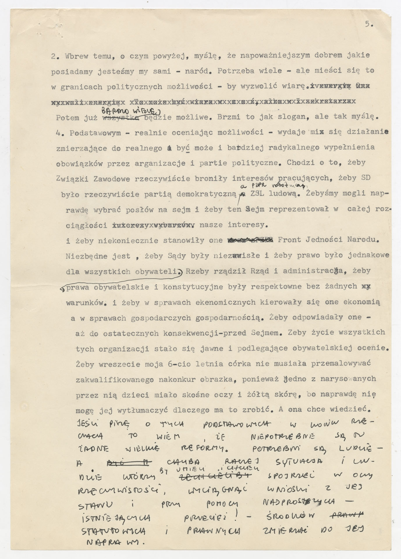 Maszynopis z odpowiedziami Krzysztofa Kieślowskiego na ankietę konwersatorium “Doświadczenie i Przyszłość”, dotyczącą sytuacji społeczno-politycznej i kulturalnej w Polsce. Tekst ma postać eseju, w którym autor analizuje m.in. społeczną apatię, bezideowość młodego pokolenia, nierówność i przywileje związane z władzą, skompromitowaną propagandę, brak odpowiedzialności decydentów oraz zaniedbania środowisk twórczych. W dalszej części formułuje postulaty zmian: wzmocnienia realnej roli organizacji społecznych i politycznych, jawności życia publicznego, przestrzegania praw obywatelskich oraz odnowy kultury. Maszynopis ma charakter osobistej diagnozy i programu naprawy, miejscami uzupełnionej odręcznymi dopiskami autora.