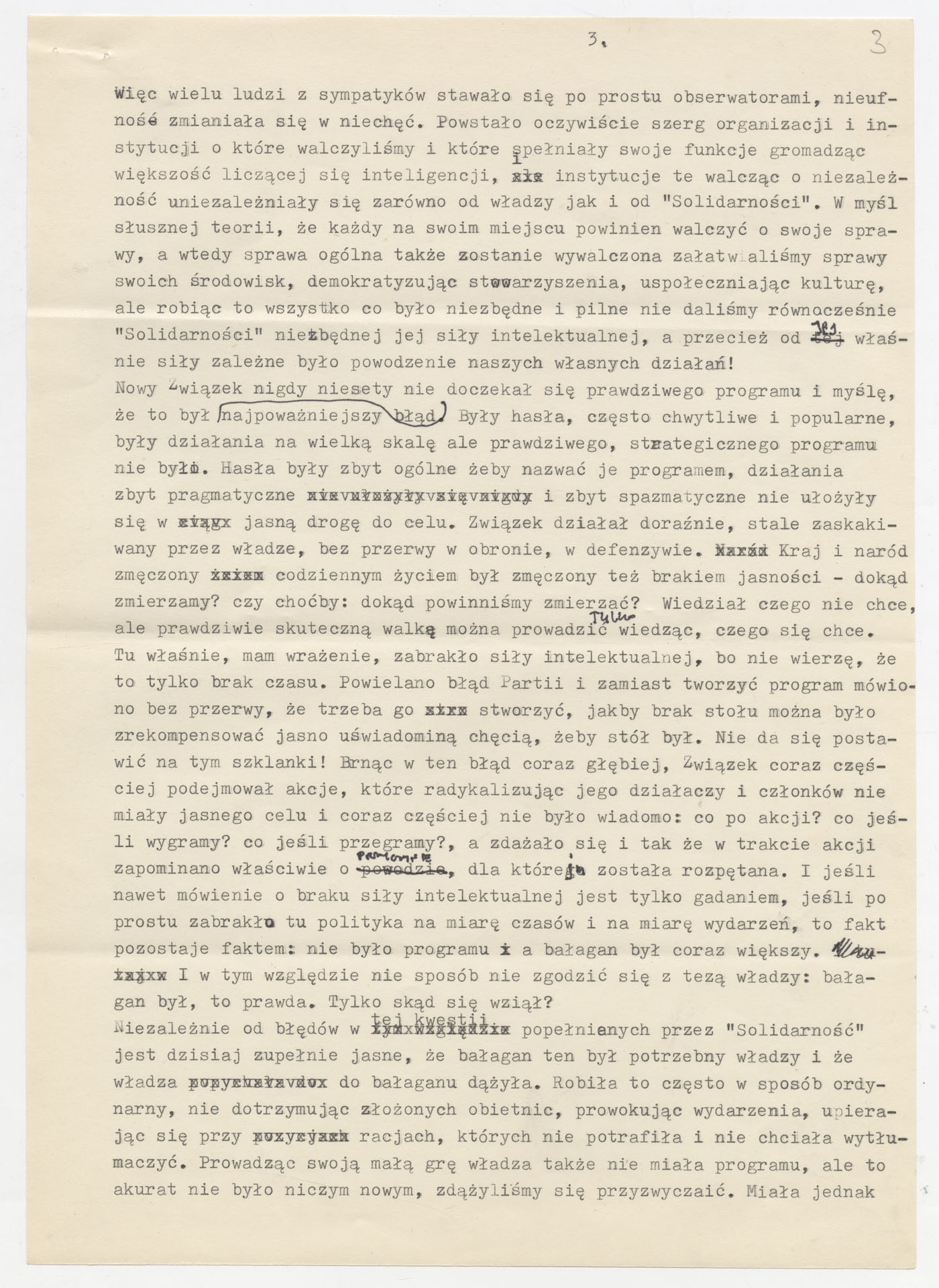 Maszynopis z esejem Krzysztofa Kieślowskiego powstałego w ramach konwersatorium “Doświadczenie i Przyszłość” po wprowadzeniu stanu wojennego (1982). Autor analizuje przyczyny sytuacji politycznej po 13 grudnia, pytając, czy można było jej zapobiec. Krytycznie opisuje postawę inteligencji wobec “Solidarności”, brak programu związku, “bałagan” wykorzystywany przez władzę oraz narastający kryzys zaufania do instytucji państwa. Ocena działań władz ma silny wymiar moralny (zdrada robotników, którzy wynieśli je do władzy). W zakończeniu autor tekstu rozważa możliwe formy biernego oporu, zachowanie godności i potencjału społecznego oraz potrzebę badań i analiz przyszłości. Maszynopis ma postać ciągłego tekstu z nielicznymi odręcznymi poprawkami.