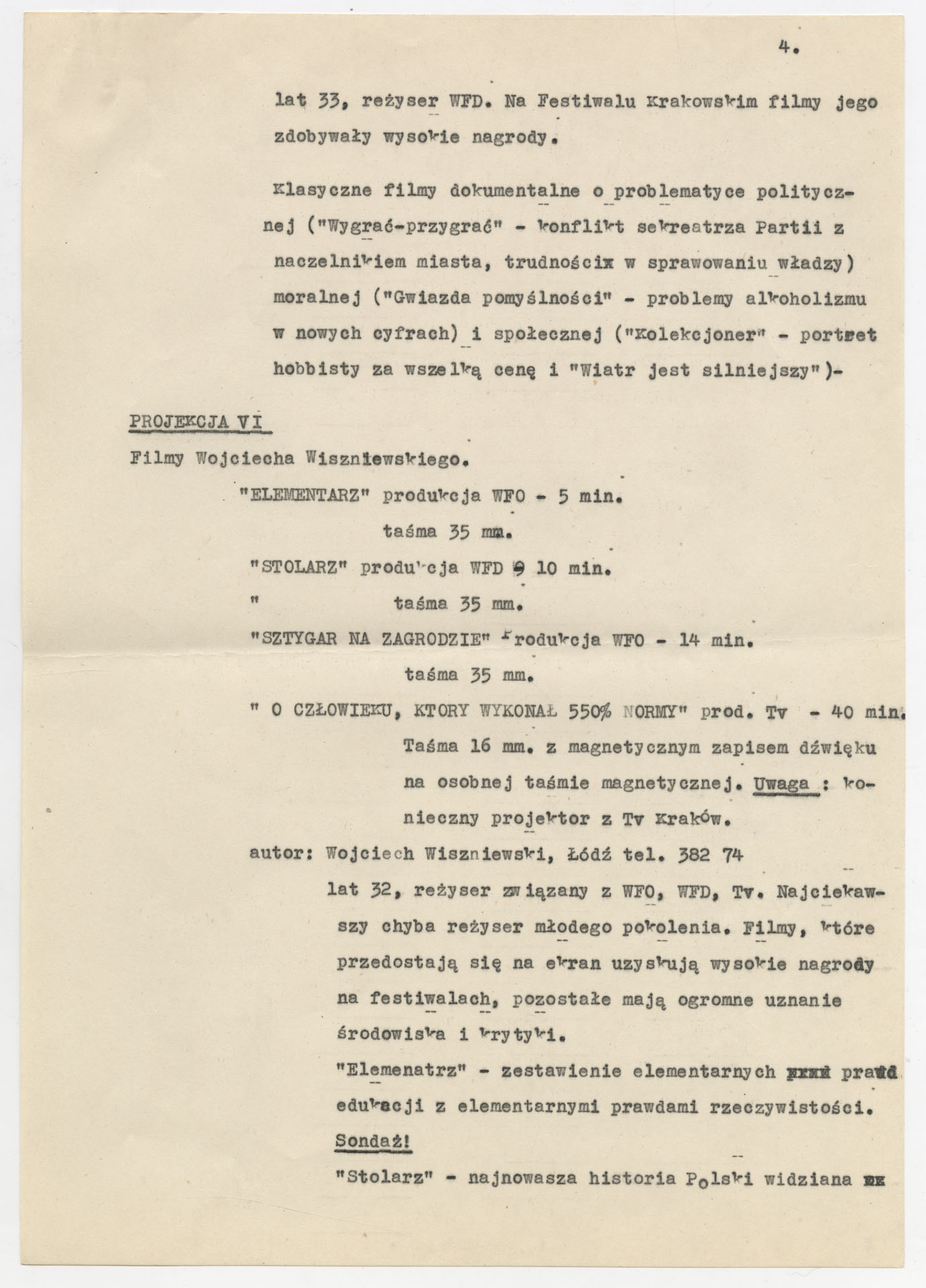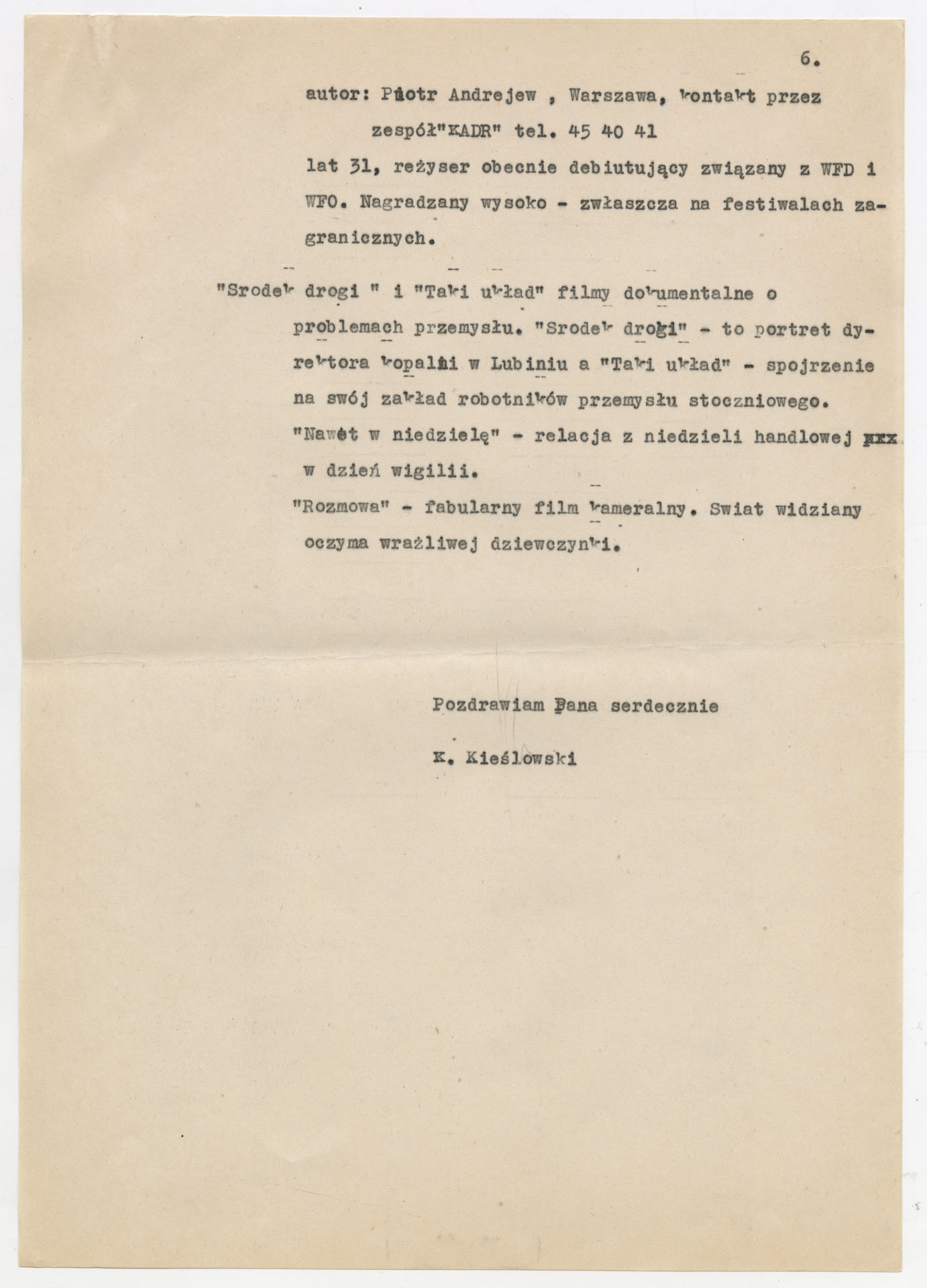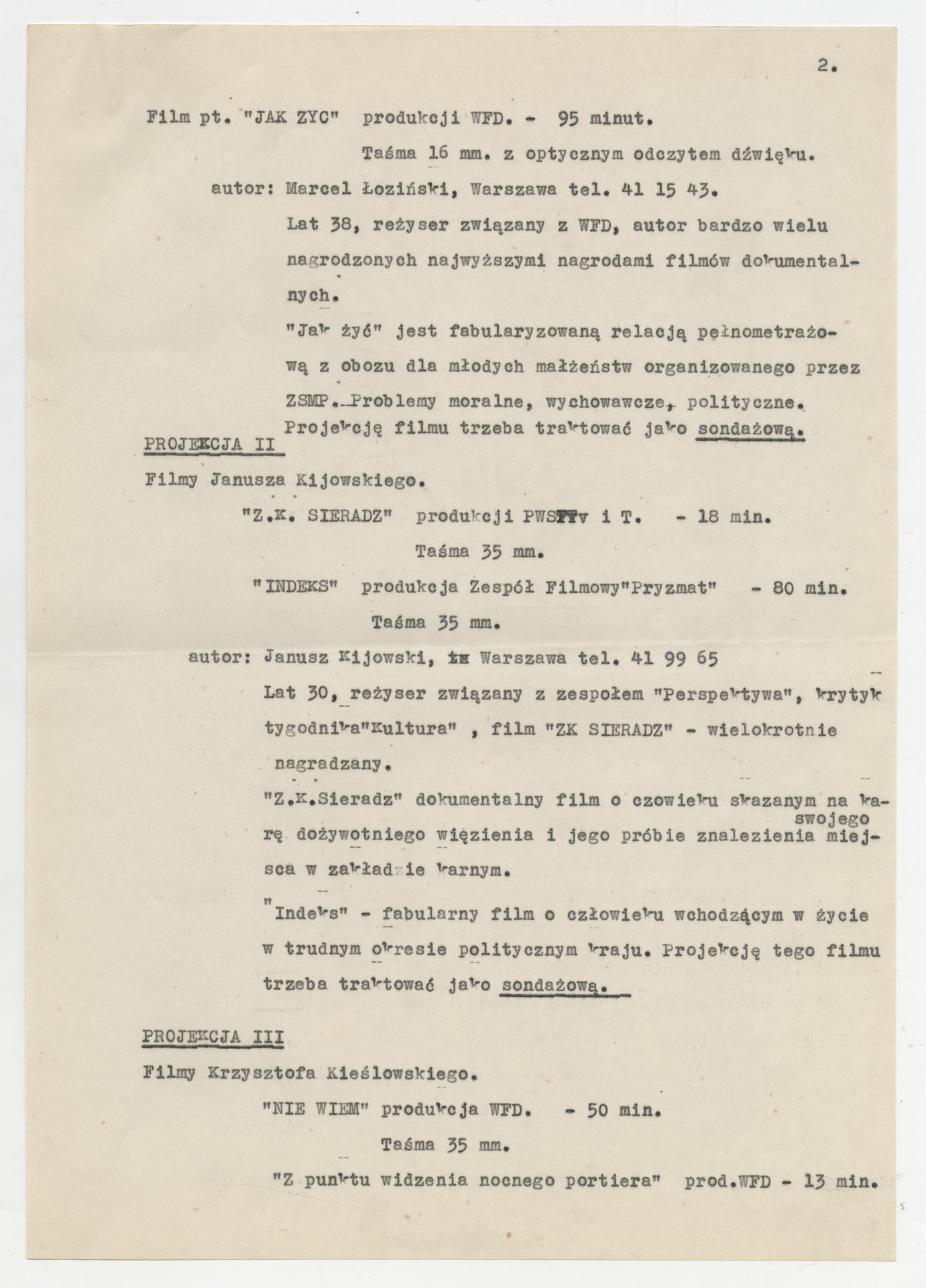 Kopia maszynopisu z listem Krzysztofa Kieślowskiego do dyrektora Klubu Twórców i Działaczy Kultury “Kuźnica” z propozycją cyklu ośmiu projekcji filmowych na sezon 1978-1979. Dokument zawiera szczegółowy program pokazów filmów dokumentalnych i fabularnych m.in. Marcela Łozińskiego, Janusza Kijowskiego, Krzysztofa Kieślowskiego, Piotra Szulkina, Tadeusza Pałki, Wojciecha Wiszniewskiego, Marka Piwowskiego, Piotra Andrejewa. Przy każdej projekcji podano tytuły filmów, wytwórnie (WFD, WFO, PWSFTviT, TVP), parametry techniczne (taśma 16 mm / 35 mm, czas trwania) oraz krótkie opisy problematyki (sprawy polityczne, moralne, społeczne) i noty o reżyserach z numerami telefonów kontaktowych. Maszynopis ma postać uporządkowanego pisma organizacyjno-programowego, bez odręcznych poprawek.
