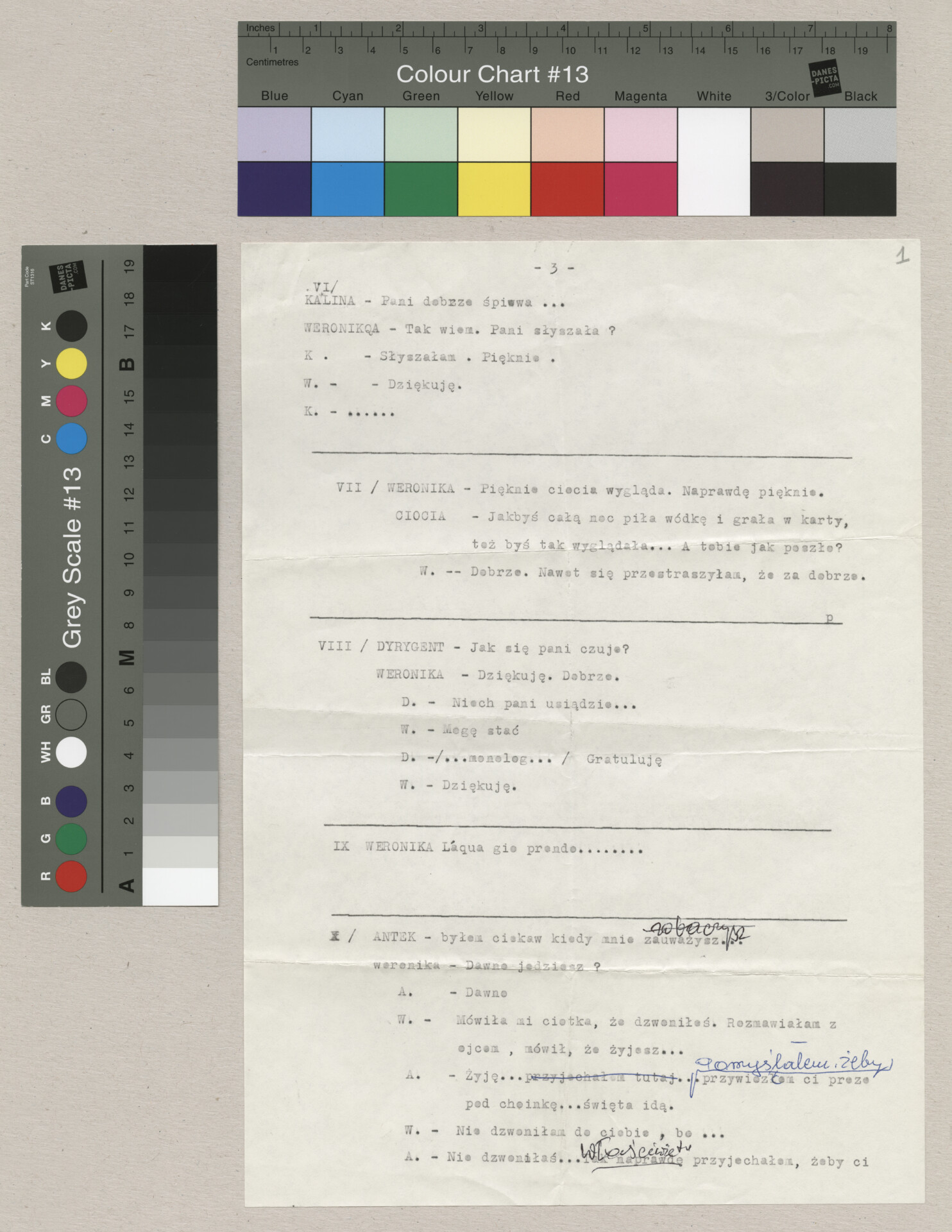 Maszynopis listy dialogowej do filmu Krzysztofa Kieślowskiego “Podwójne życie Weroniki” (1991) – pierwszego zagranicznego filmu reżysera. W momencie pracy nad filmem posługiwano się tytułem “Chórzystka”. Autorami scenariusza są Krzysztof Piesiewicz i Krzysztof Kieślowski, którzy przedstawiają opowieść o dwóch identycznych kobietach, Polce i Francuzce (obie role grane przez Irène Jacob), które w niewytłumaczalny sposób odczuwają swoją wzajemną obecność. Luźne strony dokumentu, nieoprawione. Kserokopia nie obejmuje całości stron – brakuje fragmentów tekstu. Dokument zawiera odręczne notatki autora.