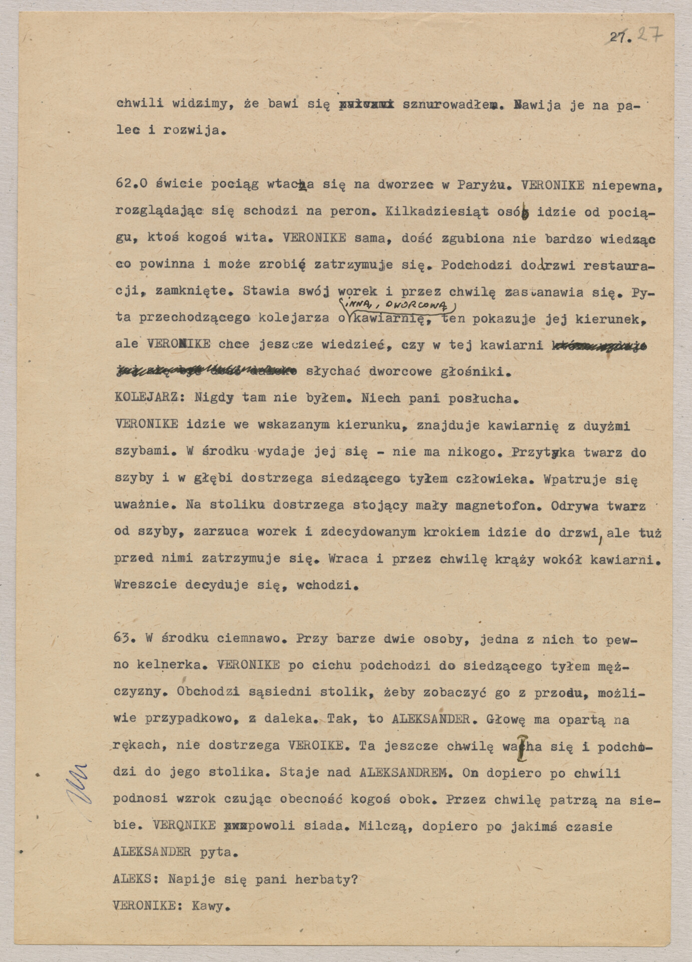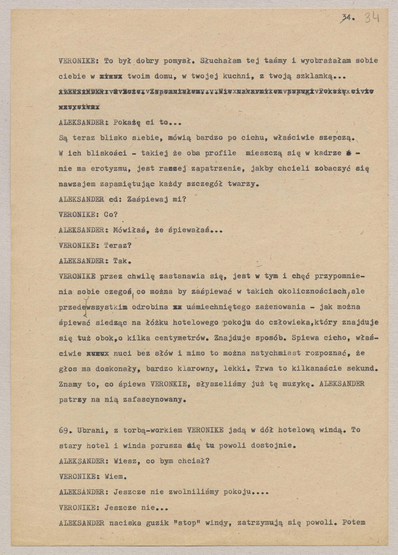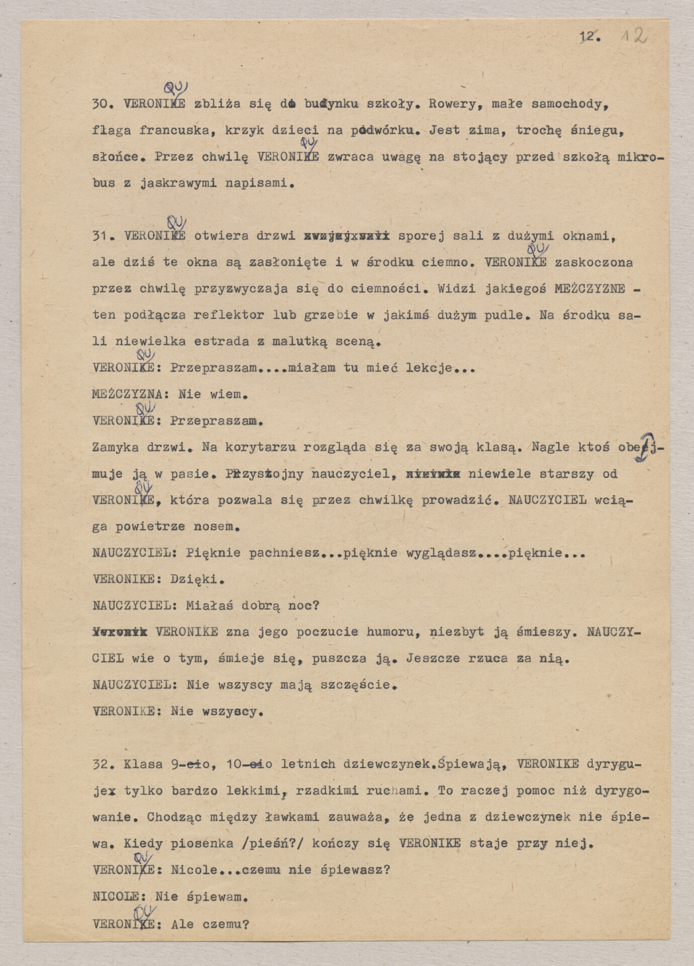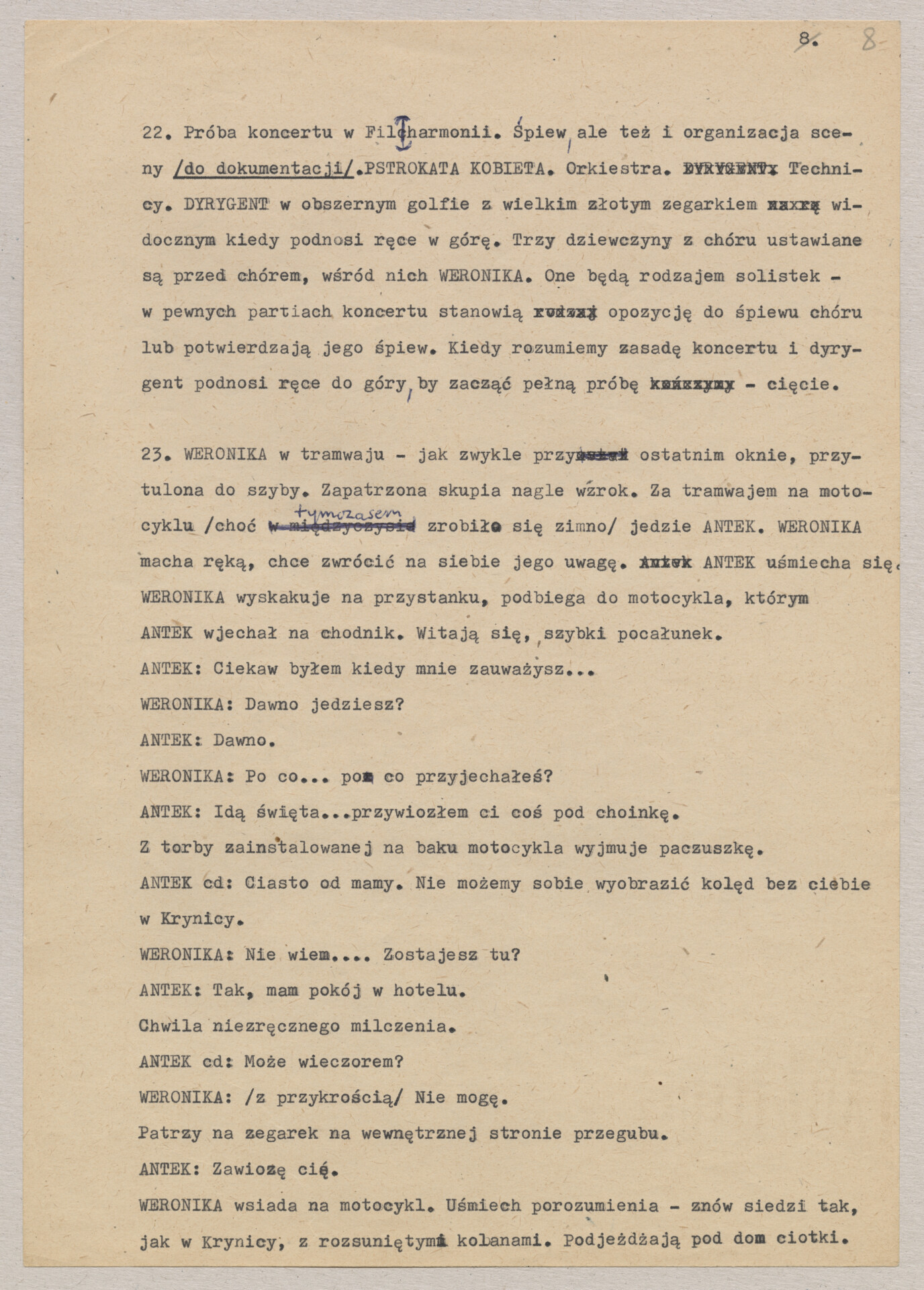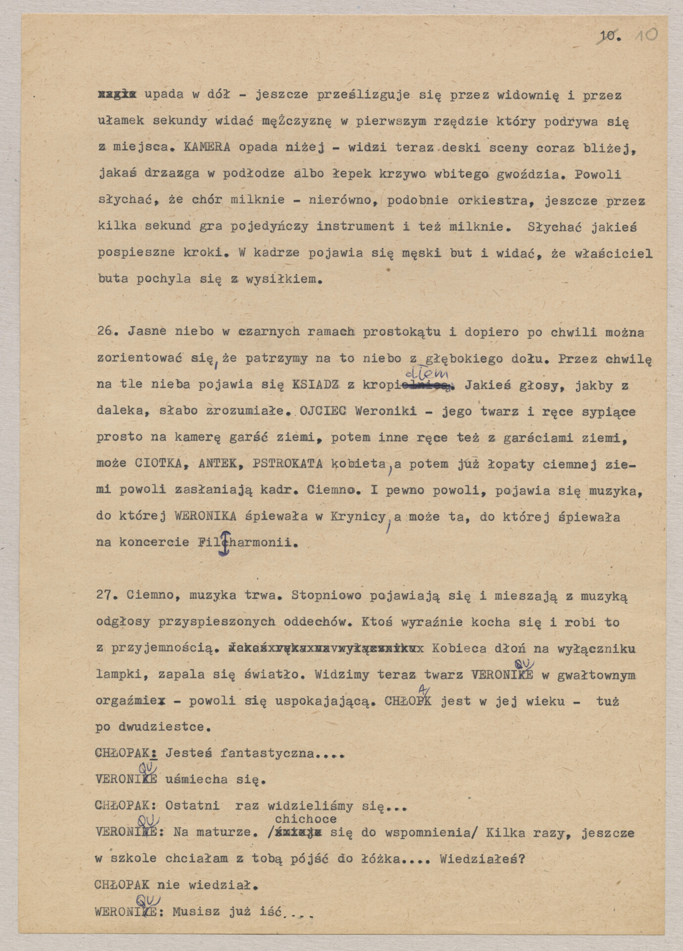 Maszynopis treatmentu do filmu Krzysztofa Kieślowskiego “Podwójne życie Weroniki” (1991) – pierwszego zagranicznego filmu reżysera. W momencie pracy nad filmem posługiwano się tytułem “Chórzystka”. Autorami scenariusza są Krzysztof Piesiewicz i Krzysztof Kieślowski, którzy przedstawiają opowieść o dwóch identycznych kobietach, Polce i Francuzce (obie role grane przez Irène Jacob), które w niewytłumaczalny sposób odczuwają swoją wzajemną obecność. Dokument zawiera odręczne notatki autora.