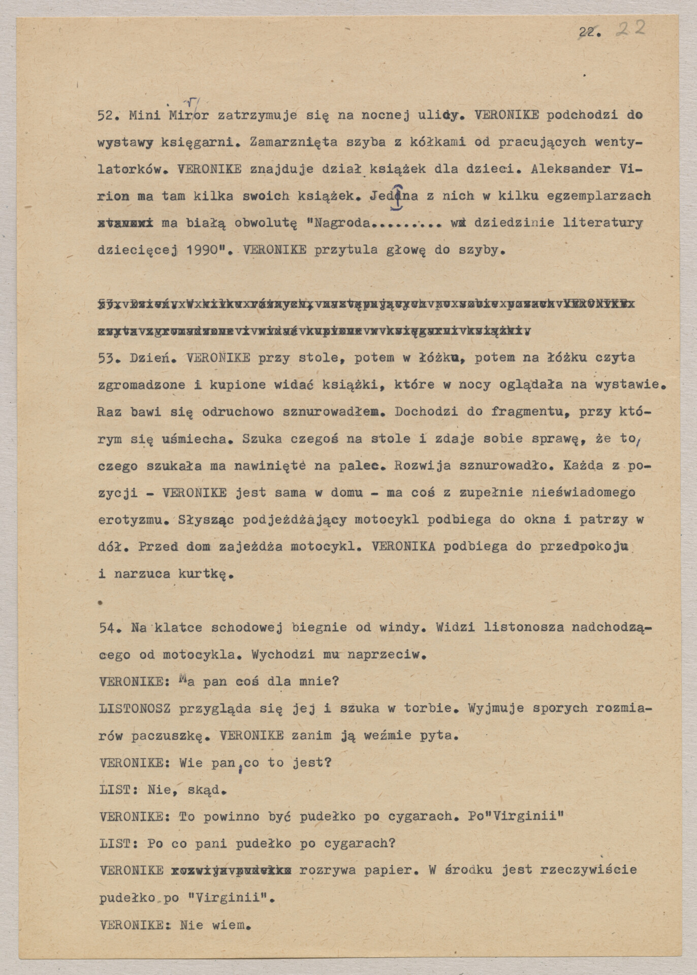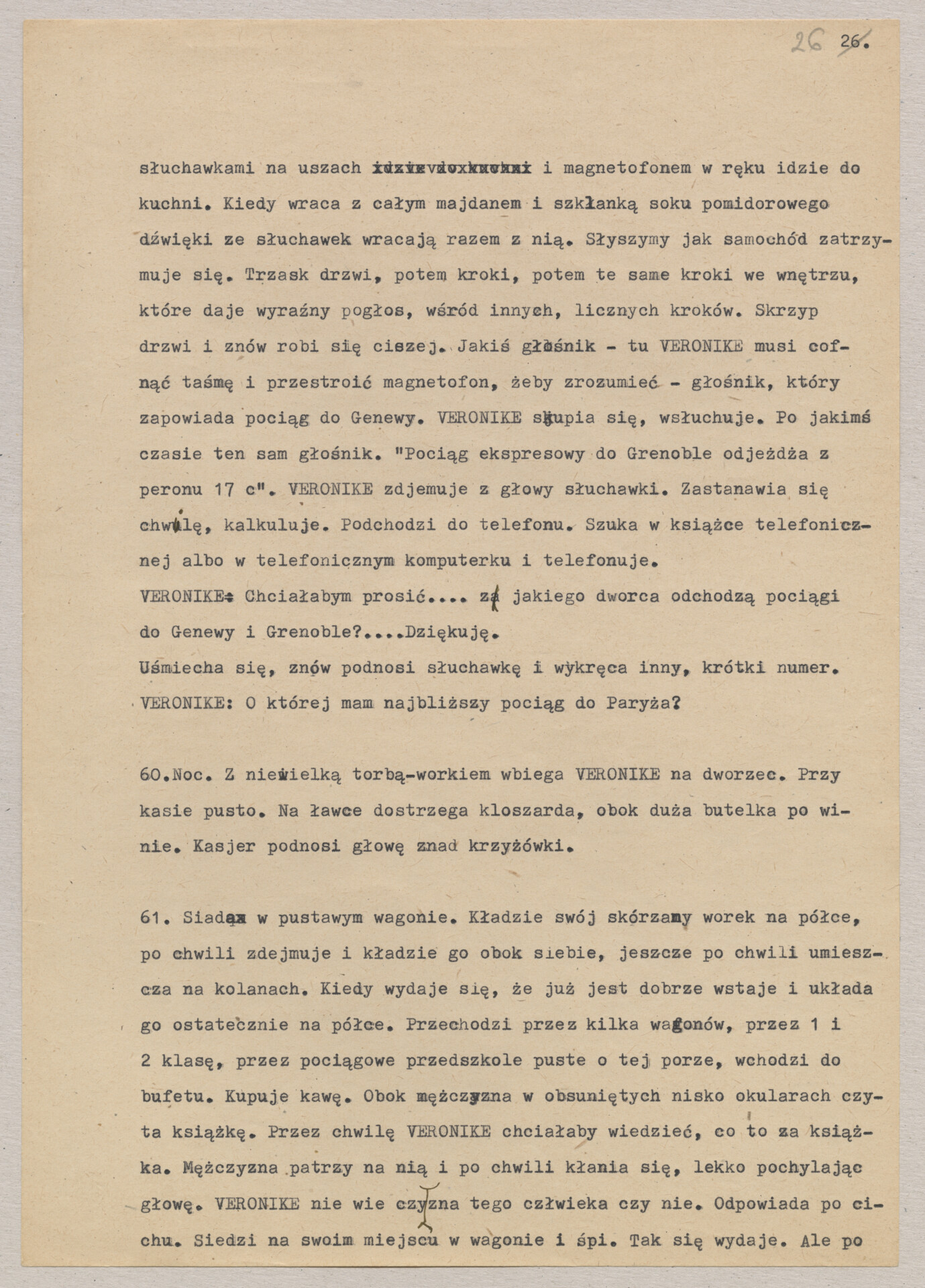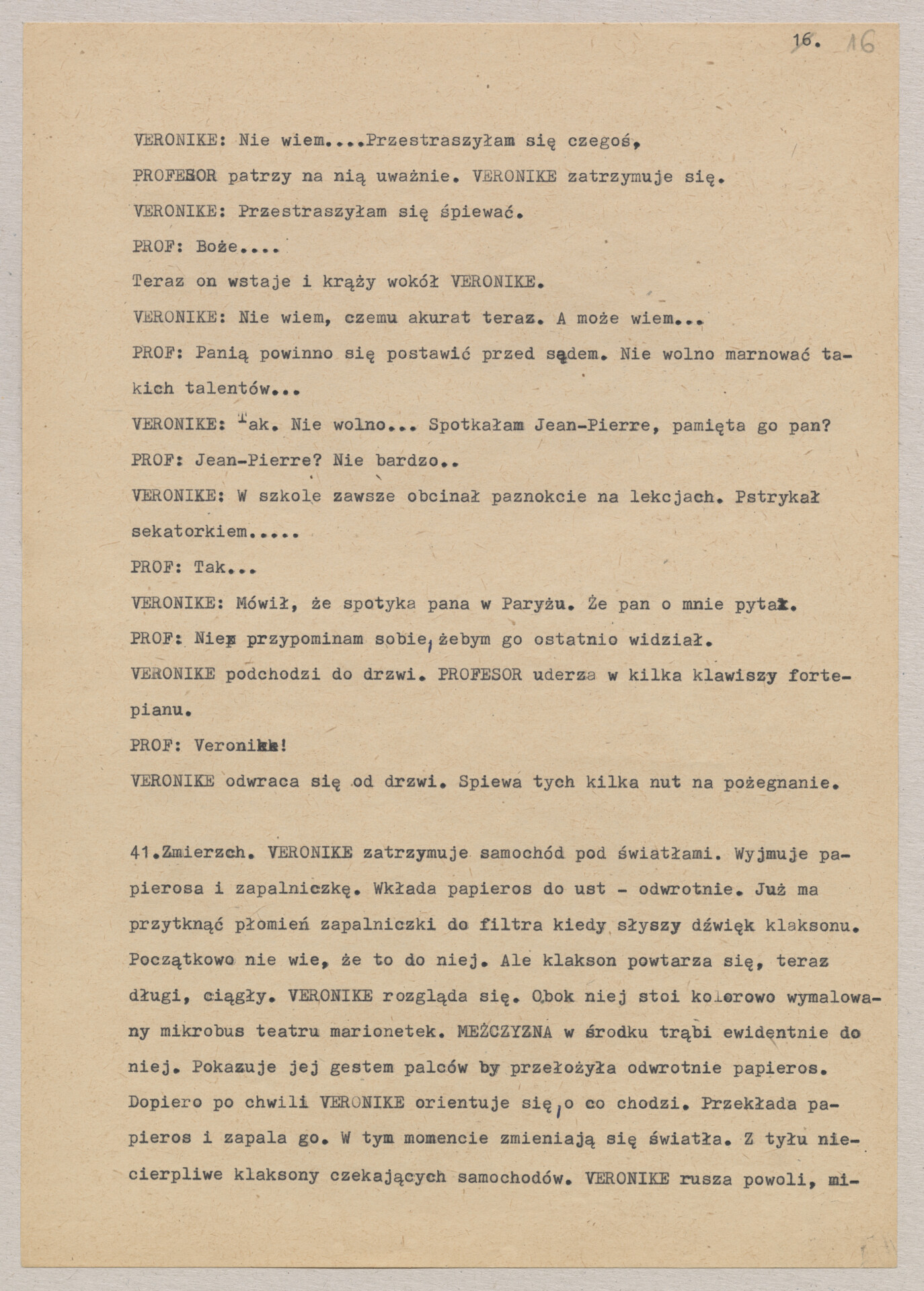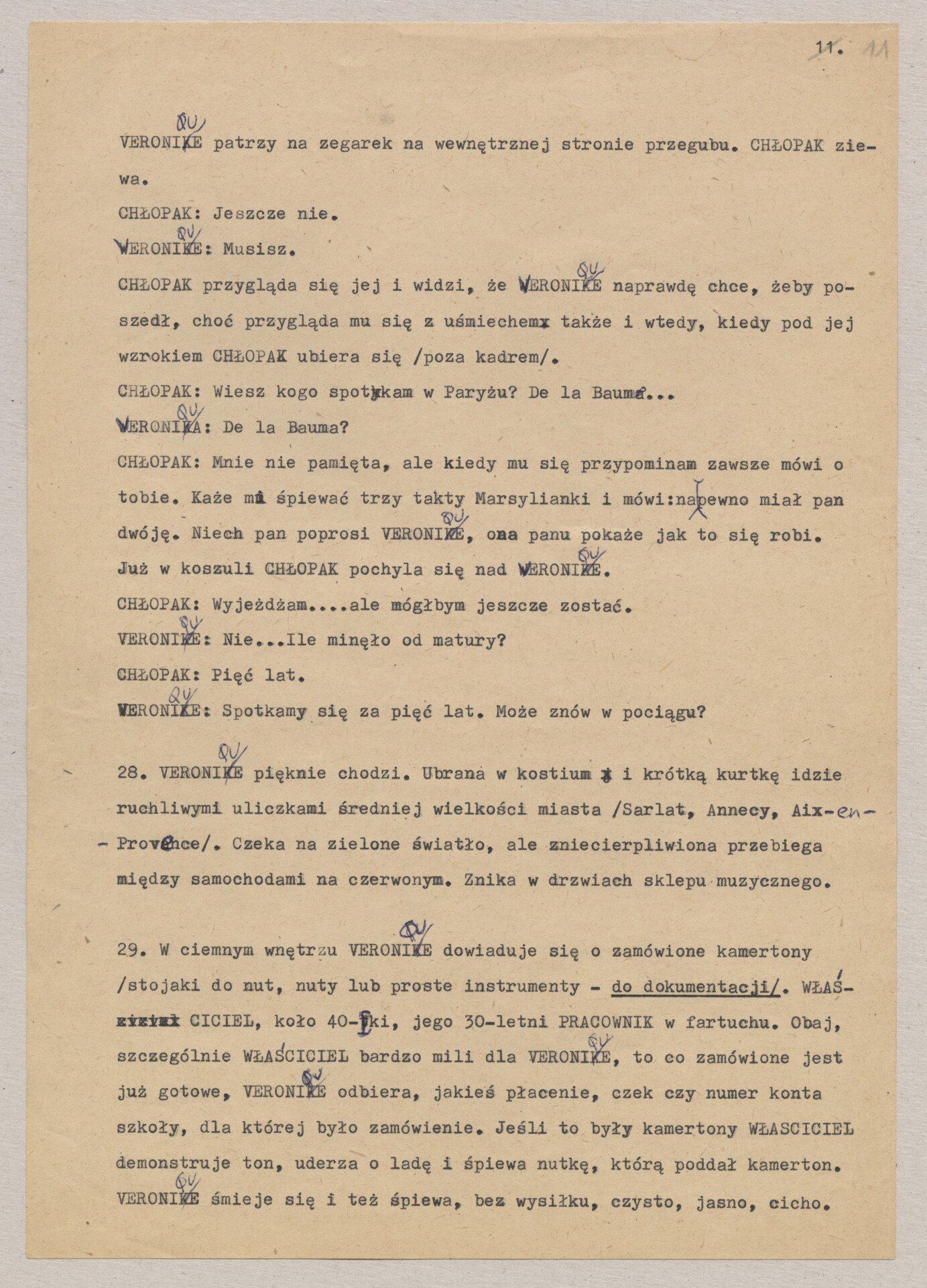 Maszynopis treatmentu do filmu Krzysztofa Kieślowskiego “Podwójne życie Weroniki” (1991) – pierwszego zagranicznego filmu reżysera. W momencie pracy nad filmem posługiwano się tytułem “Chórzystka”. Autorami scenariusza są Krzysztof Piesiewicz i Krzysztof Kieślowski, którzy przedstawiają opowieść o dwóch identycznych kobietach, Polce i Francuzce (obie role grane przez Irène Jacob), które w niewytłumaczalny sposób odczuwają swoją wzajemną obecność. Dokument zawiera odręczne notatki autora.