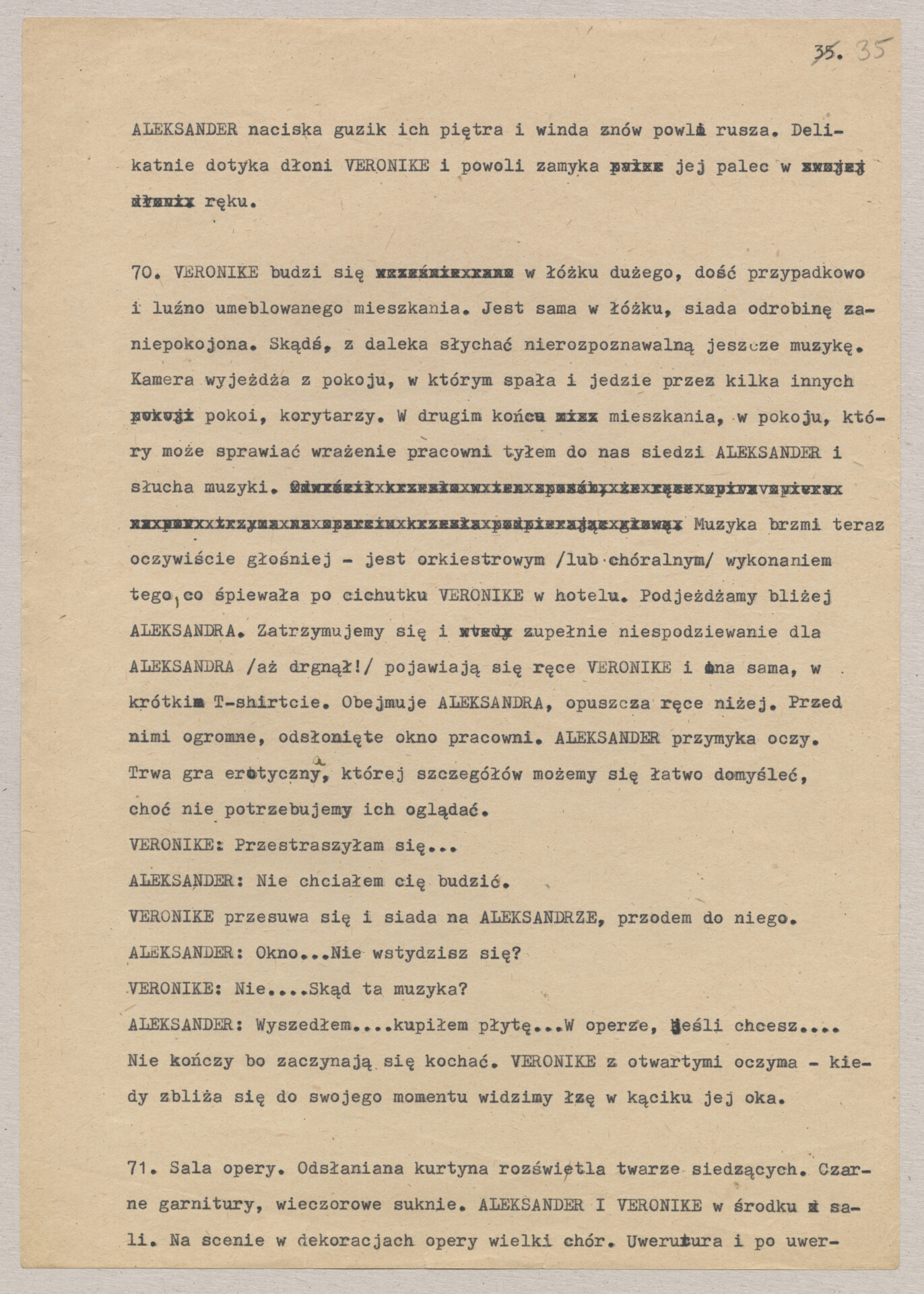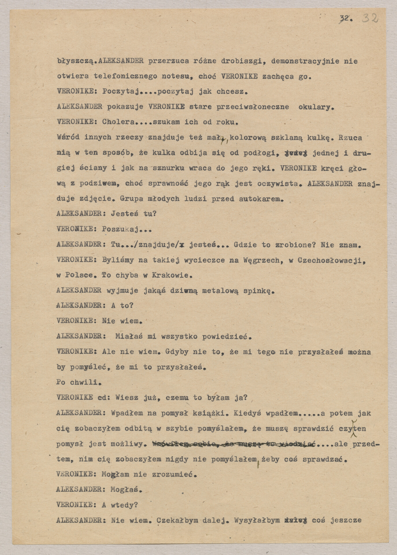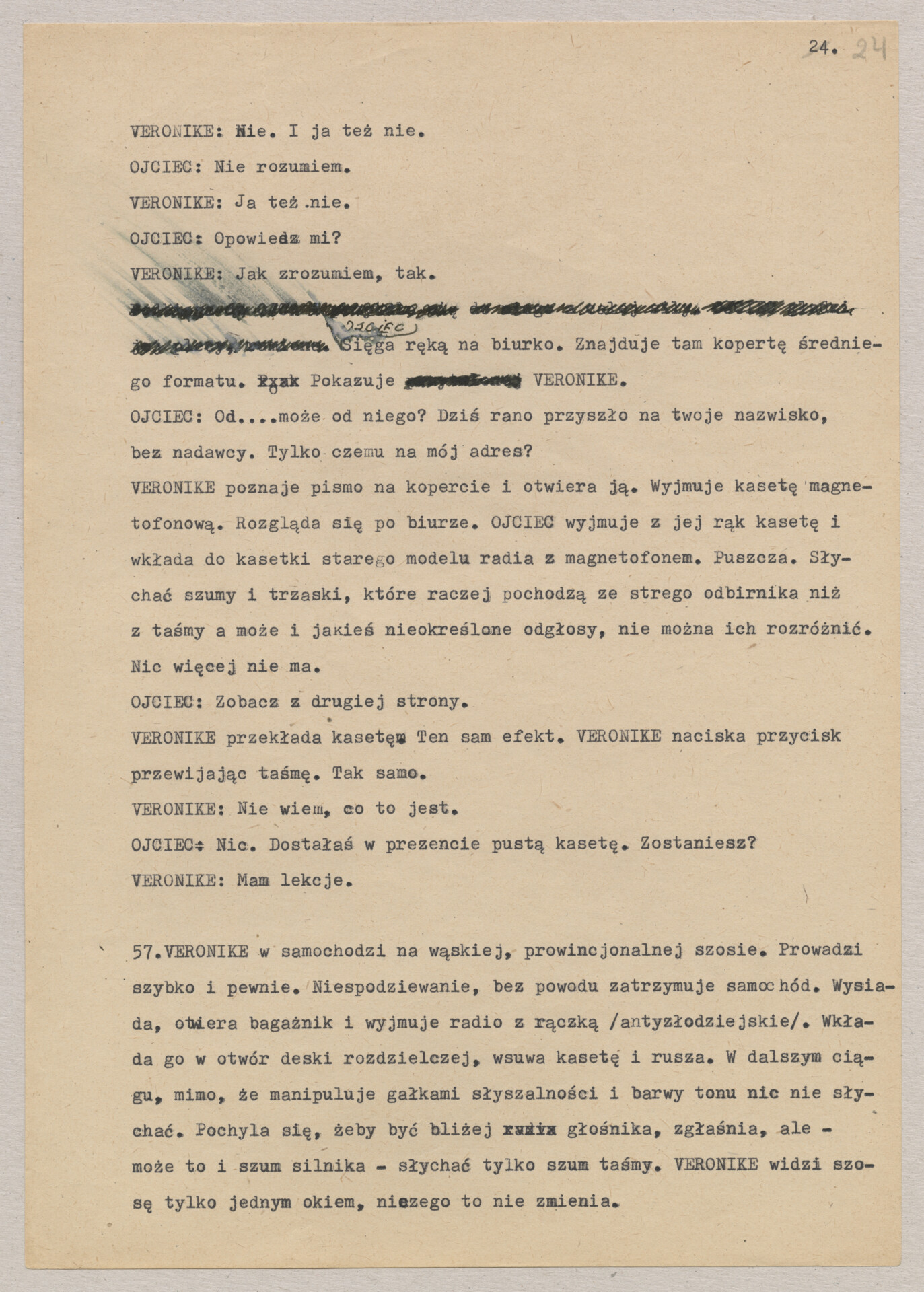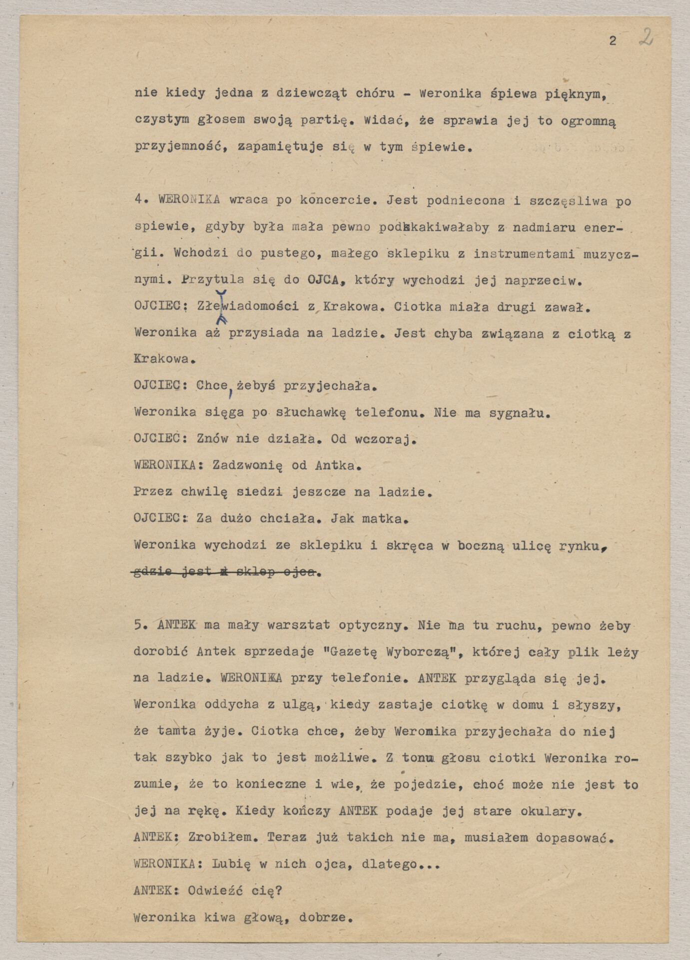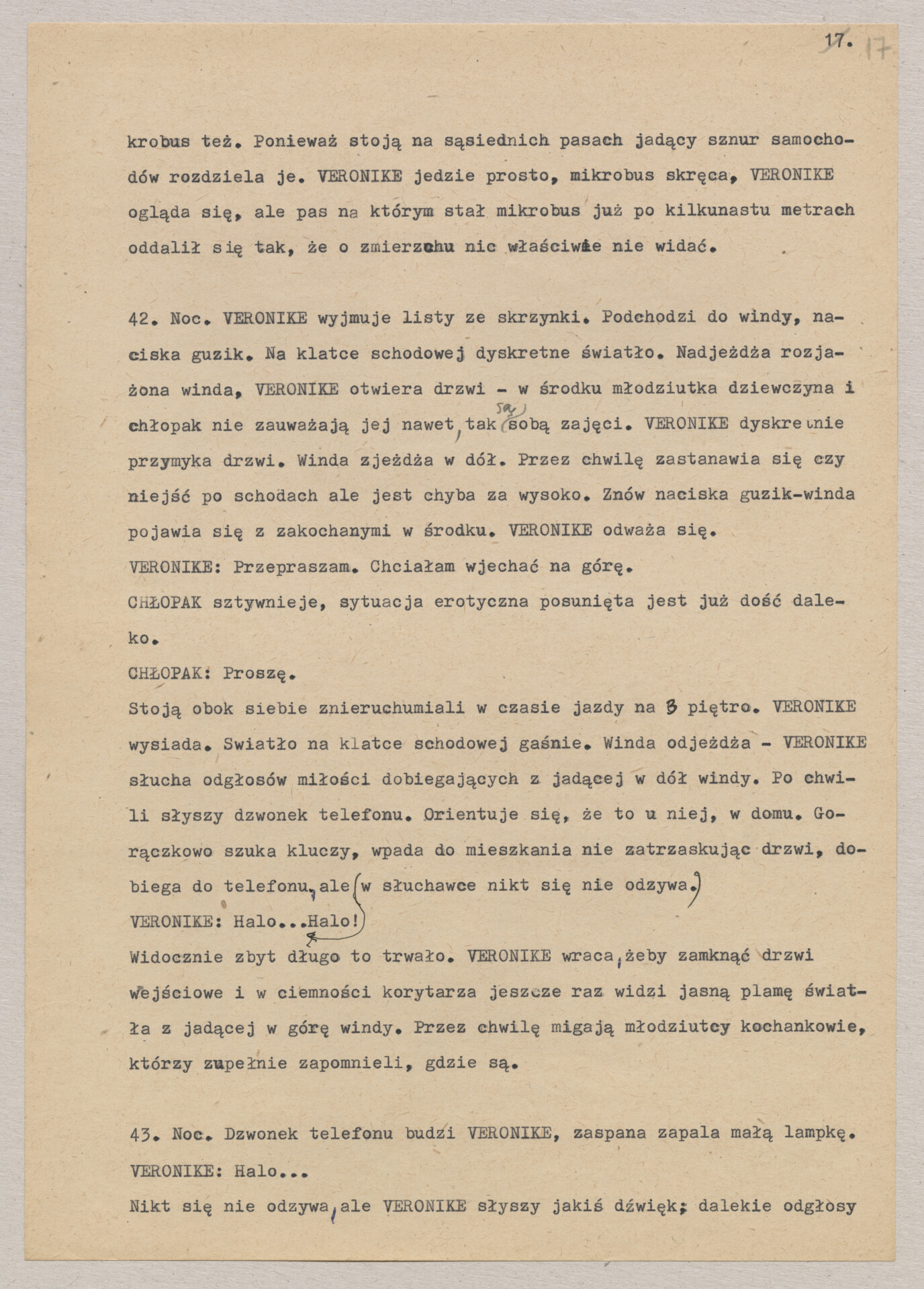 Maszynopis treatmentu do filmu Krzysztofa Kieślowskiego “Podwójne życie Weroniki” (1991) – pierwszego zagranicznego filmu reżysera. W momencie pracy nad filmem posługiwano się tytułem “Chórzystka”. Autorami scenariusza są Krzysztof Piesiewicz i Krzysztof Kieślowski, którzy przedstawiają opowieść o dwóch identycznych kobietach, Polce i Francuzce (obie role grane przez Irène Jacob), które w niewytłumaczalny sposób odczuwają swoją wzajemną obecność. Dokument zawiera odręczne notatki autora.