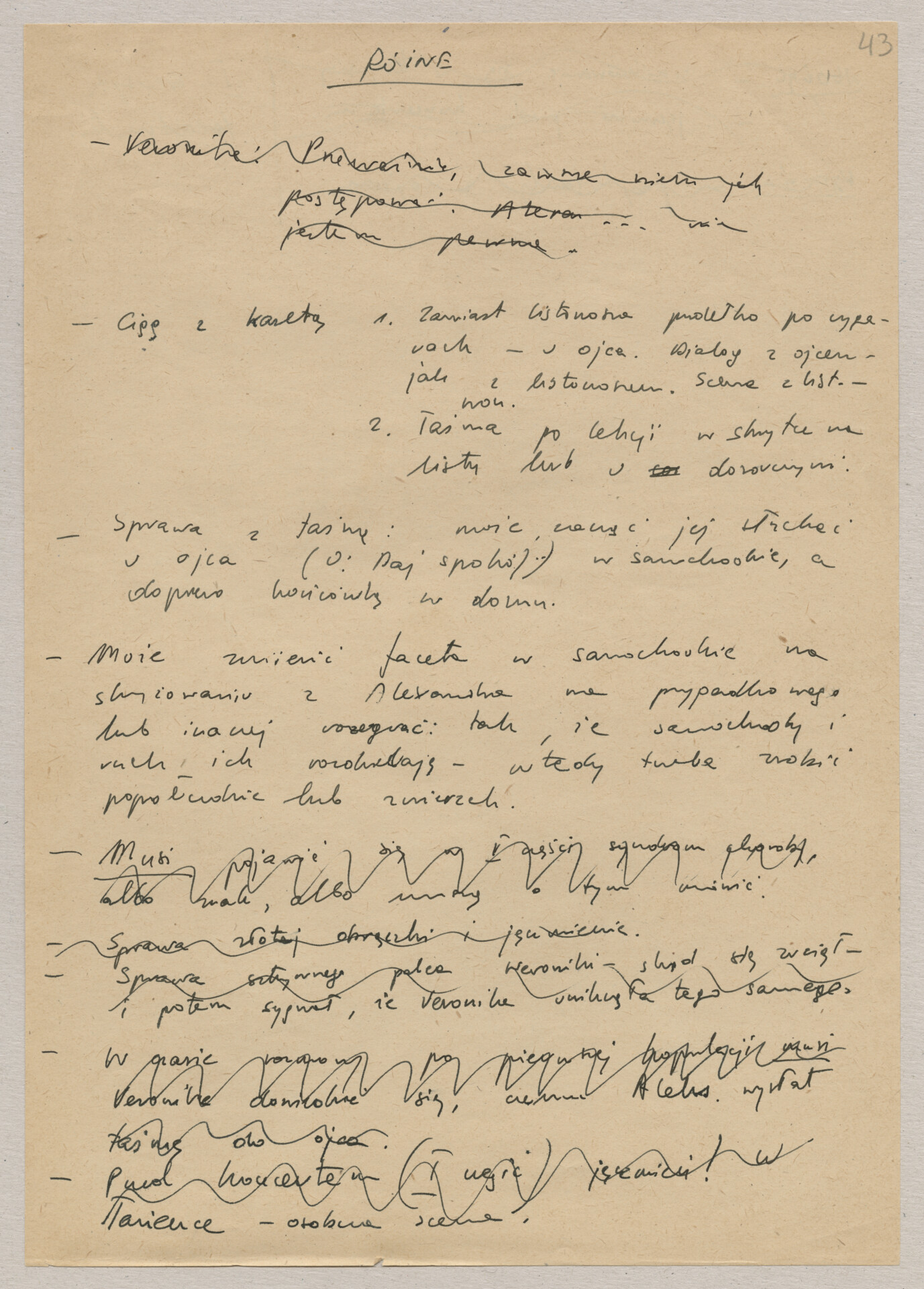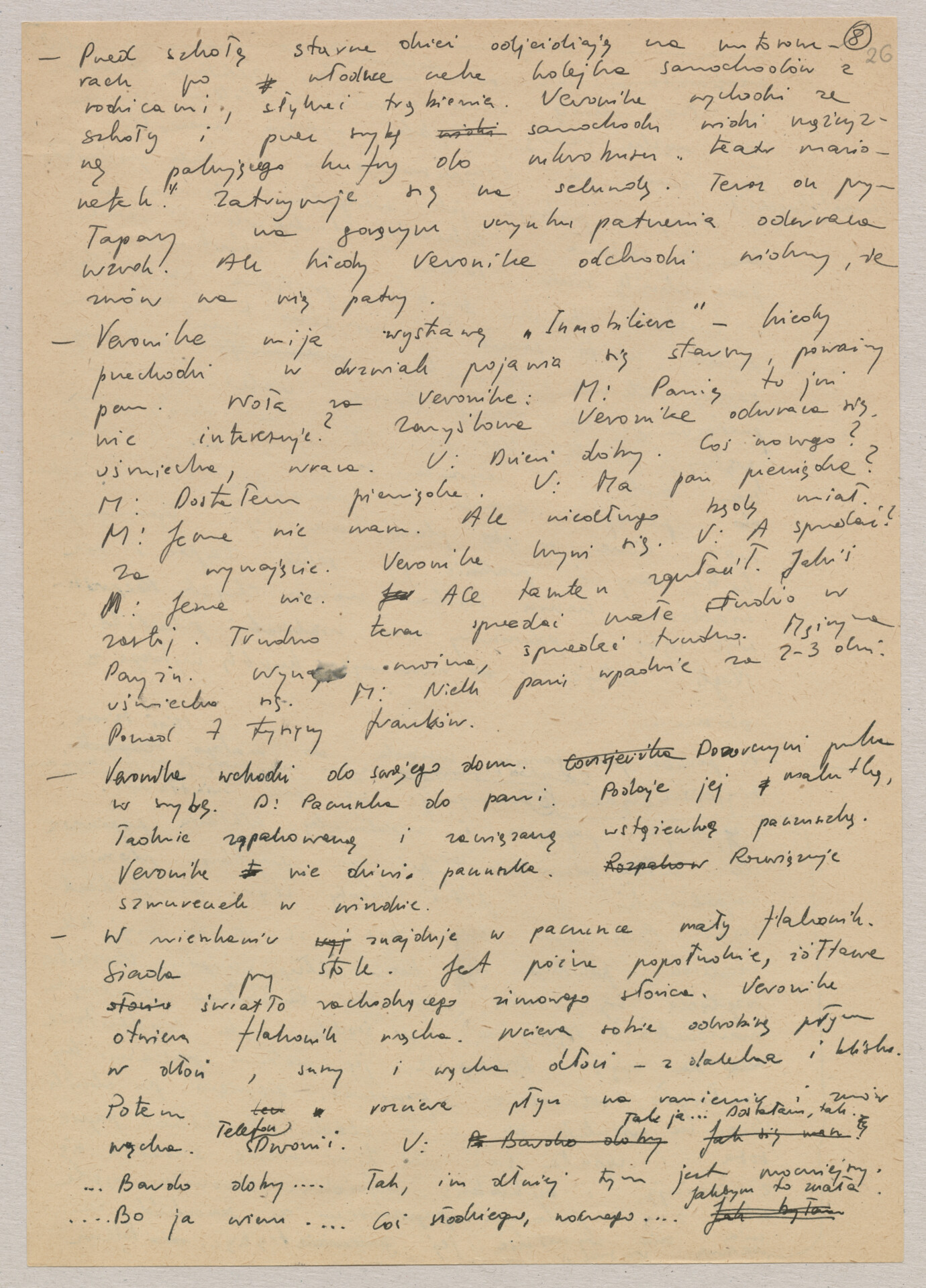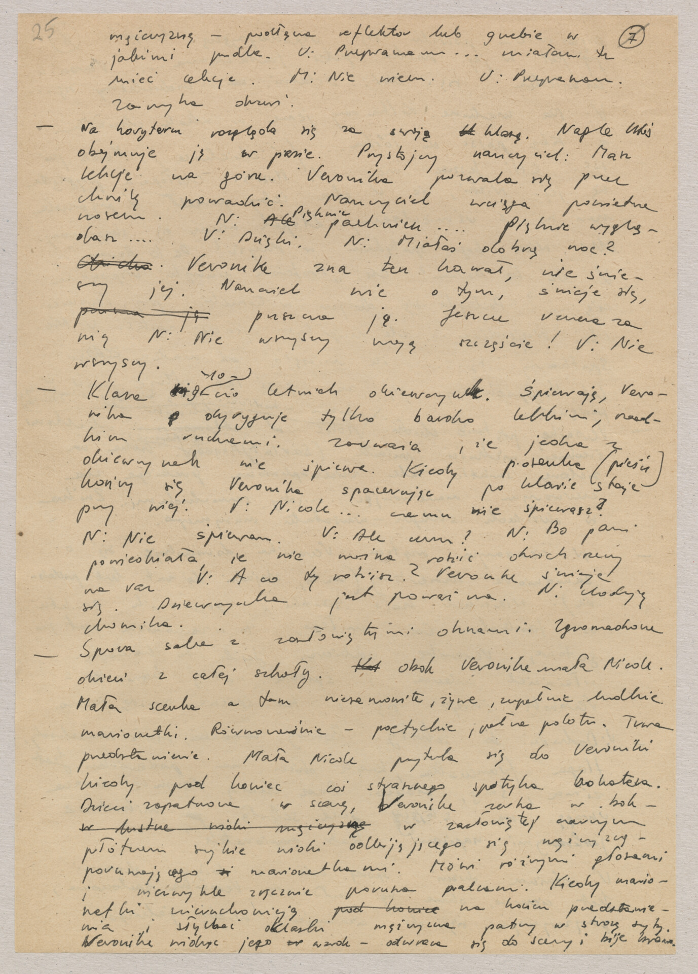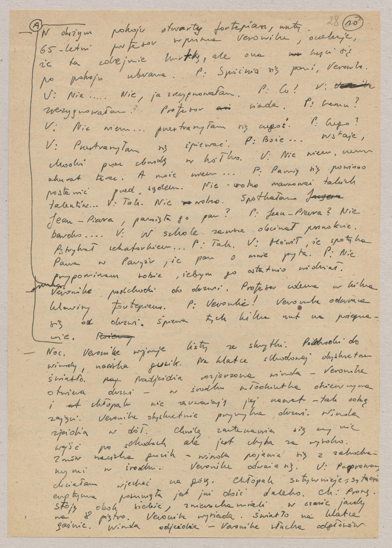 Rękopis scenariusza i notatek do filmu Krzysztofa Kieślowskiego “Podwójne życie Weroniki” (1991) – pierwszego zagranicznego filmu reżysera. W momencie pracy nad filmem posługiwano się tytułem “Chórzystka”. Autorami scenariusza są Krzysztof Piesiewicz i Krzysztof Kieślowski, którzy przedstawiają opowieść o dwóch identycznych kobietach, Polce i Francuzce (obie role grane przez Irène Jacob), które w niewytłumaczalny sposób odczuwają swoją wzajemną obecność. Strony od 1. do 15. stanowią uzupełnienia stron scenariusza. Strony od 16. do 17. zatytułowane są “Poprawki po pierwszym czytaniu pierwszej wersji scenariusza”. Strony od 18. do 42. stanowią uzupełnienie poszczególnych scen. Strony od 43. do 44. zatytułowane są “Różne”. Strona 45. zatytułowana jest “O głosie, o śpiewaniu”.