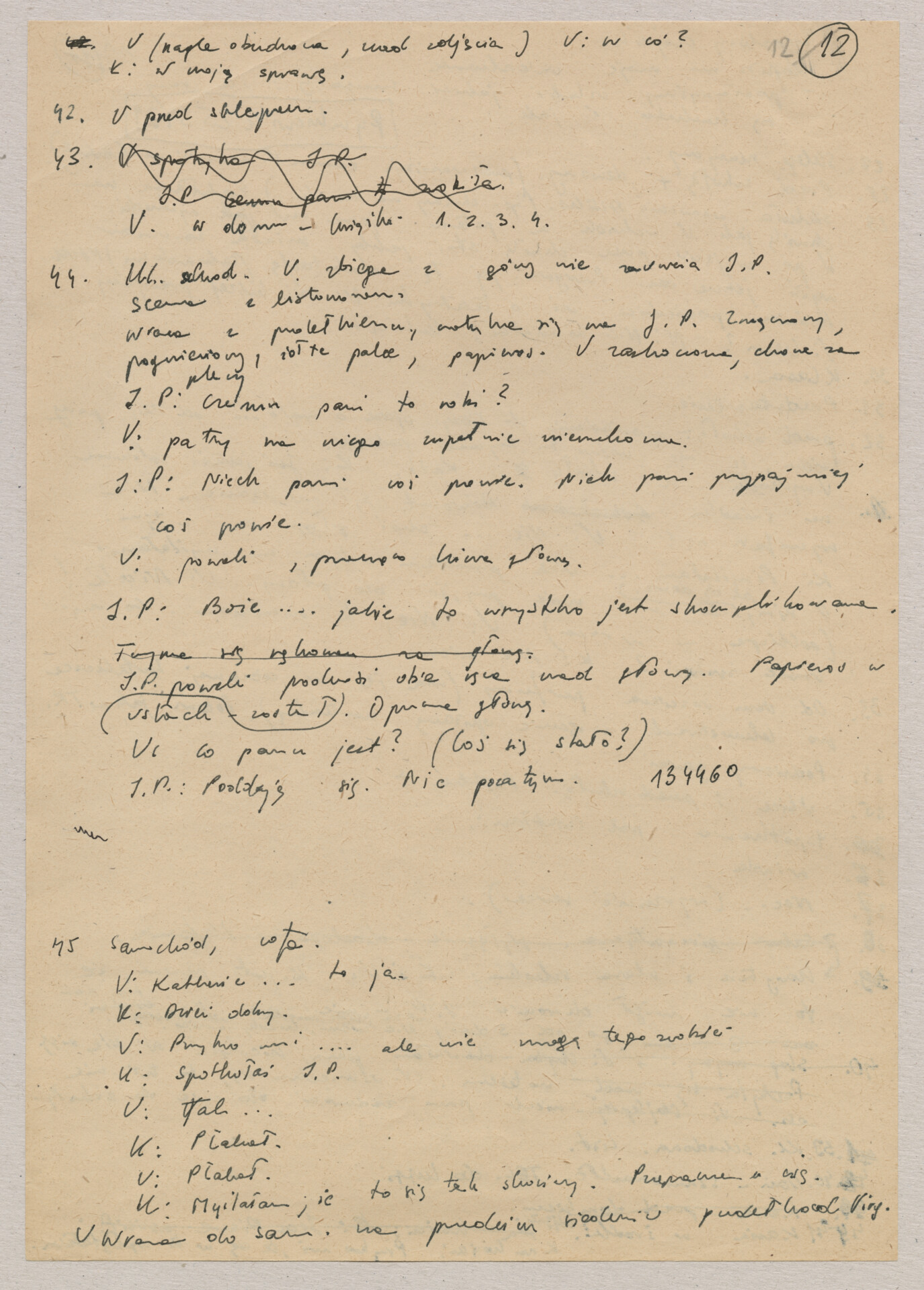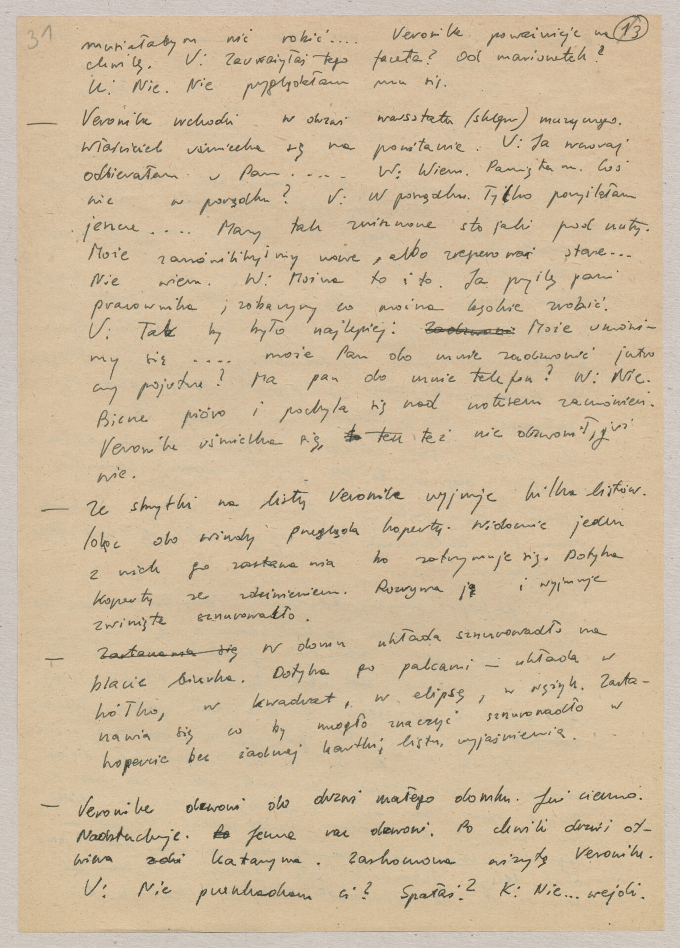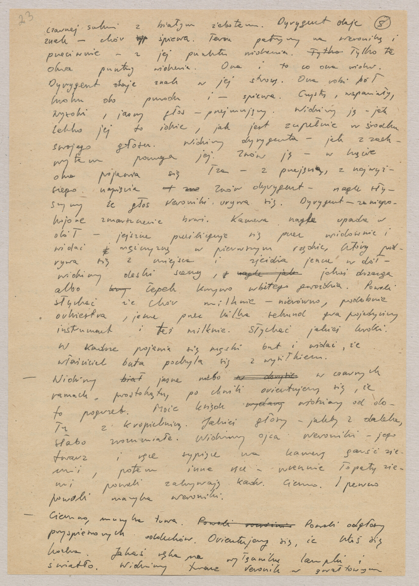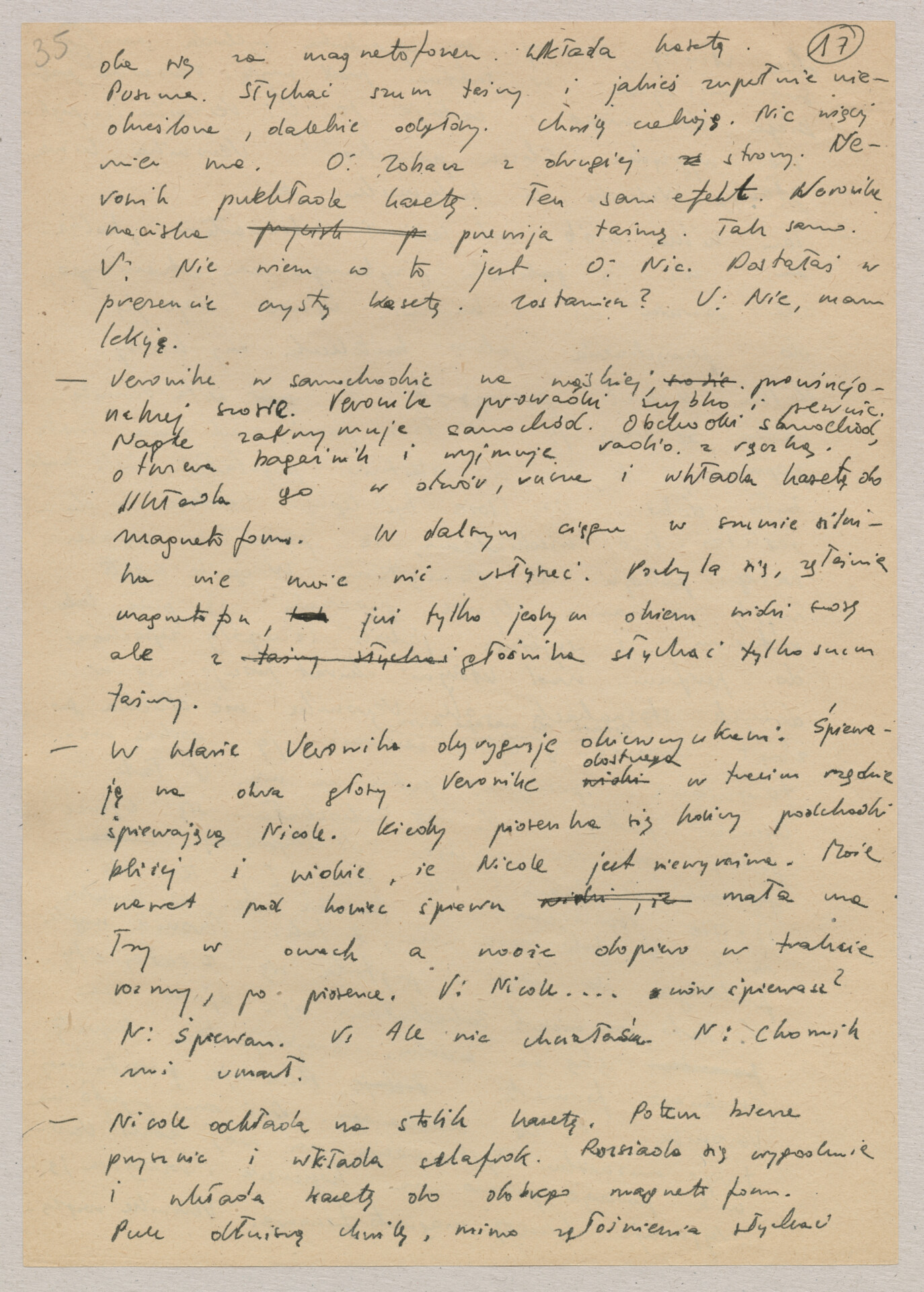Rękopis scenariusza i notatek do filmu Krzysztofa Kieślowskiego “Podwójne życie Weroniki” (1991) – pierwszego zagranicznego filmu reżysera. W momencie pracy nad filmem posługiwano się tytułem “Chórzystka”. Autorami scenariusza są Krzysztof Piesiewicz i Krzysztof Kieślowski, którzy przedstawiają opowieść o dwóch identycznych kobietach, Polce i Francuzce (obie role grane przez Irène Jacob), które w niewytłumaczalny sposób odczuwają swoją wzajemną obecność. Strony od 1. do 15. stanowią uzupełnienia stron scenariusza. Strony od 16. do 17. zatytułowane są “Poprawki po pierwszym czytaniu pierwszej wersji scenariusza”. Strony od 18. do 42. stanowią uzupełnienie poszczególnych scen. Strony od 43. do 44. zatytułowane są “Różne”. Strona 45. zatytułowana jest “O głosie, o śpiewaniu”.