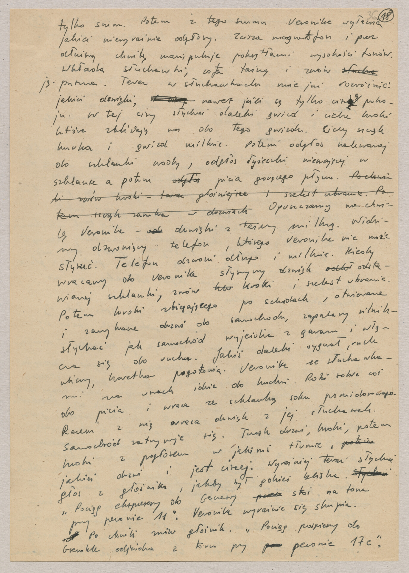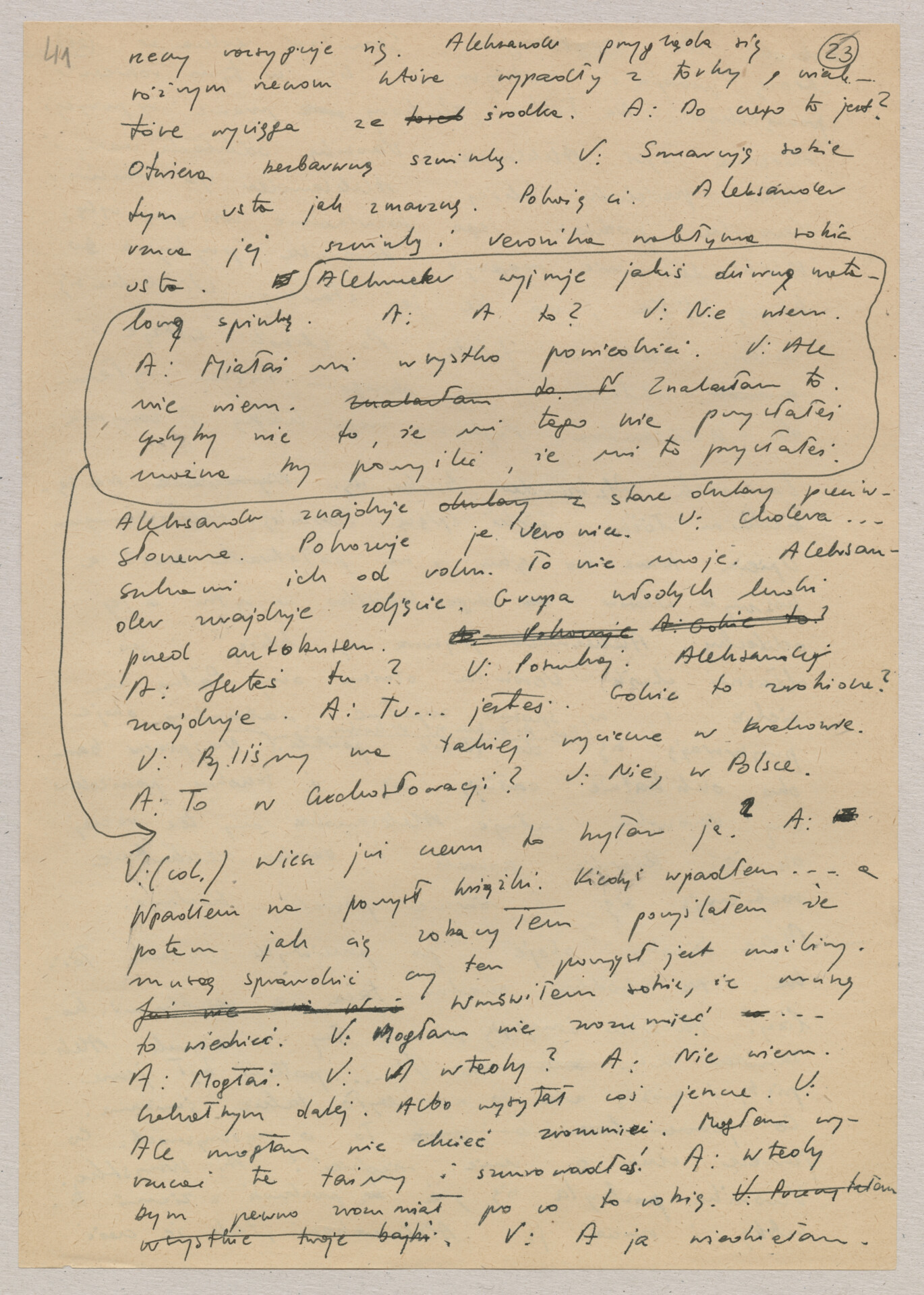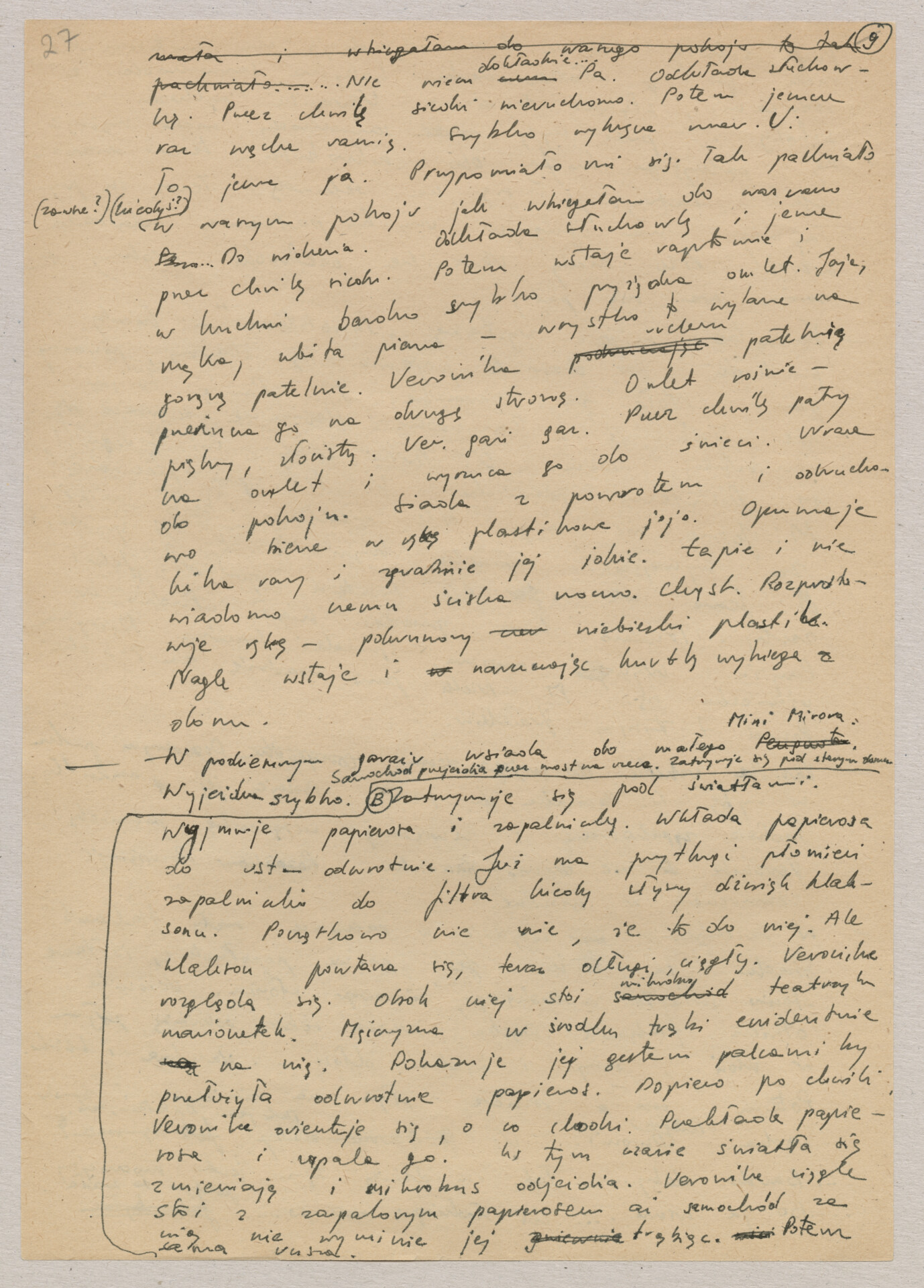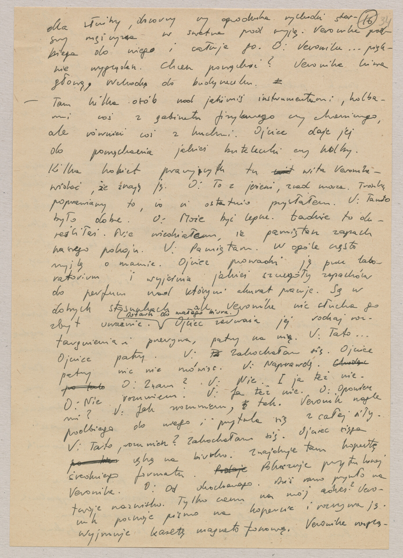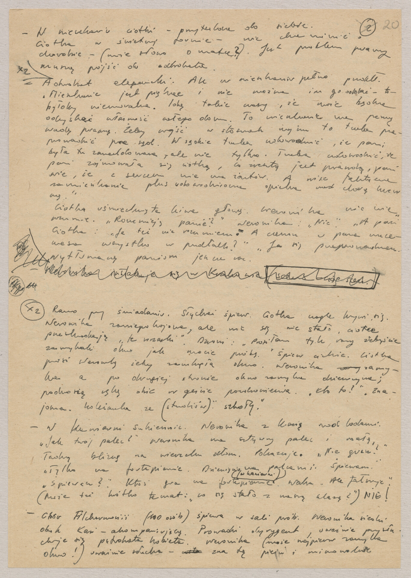 Rękopis scenariusza i notatek do filmu Krzysztofa Kieślowskiego “Podwójne życie Weroniki” (1991) – pierwszego zagranicznego filmu reżysera. W momencie pracy nad filmem posługiwano się tytułem “Chórzystka”. Autorami scenariusza są Krzysztof Piesiewicz i Krzysztof Kieślowski, którzy przedstawiają opowieść o dwóch identycznych kobietach, Polce i Francuzce (obie role grane przez Irène Jacob), które w niewytłumaczalny sposób odczuwają swoją wzajemną obecność. Strony od 1. do 15. stanowią uzupełnienia stron scenariusza. Strony od 16. do 17. zatytułowane są “Poprawki po pierwszym czytaniu pierwszej wersji scenariusza”. Strony od 18. do 42. stanowią uzupełnienie poszczególnych scen. Strony od 43. do 44. zatytułowane są “Różne”. Strona 45. zatytułowana jest “O głosie, o śpiewaniu”.