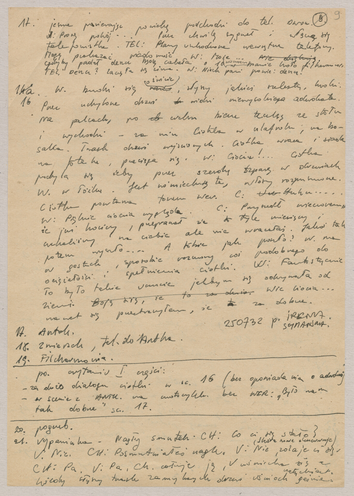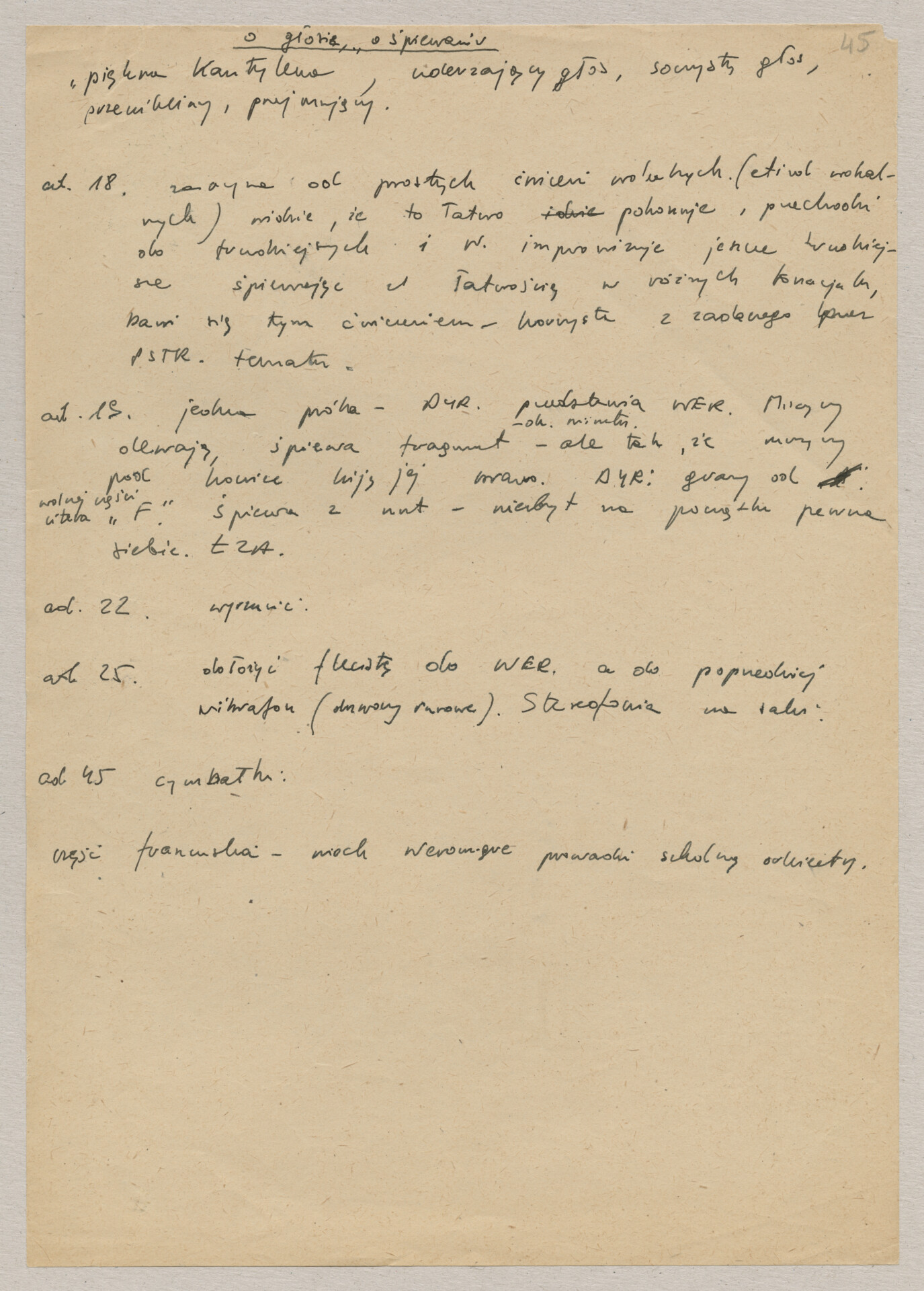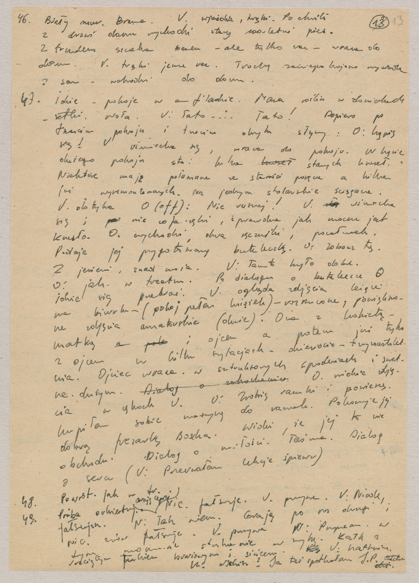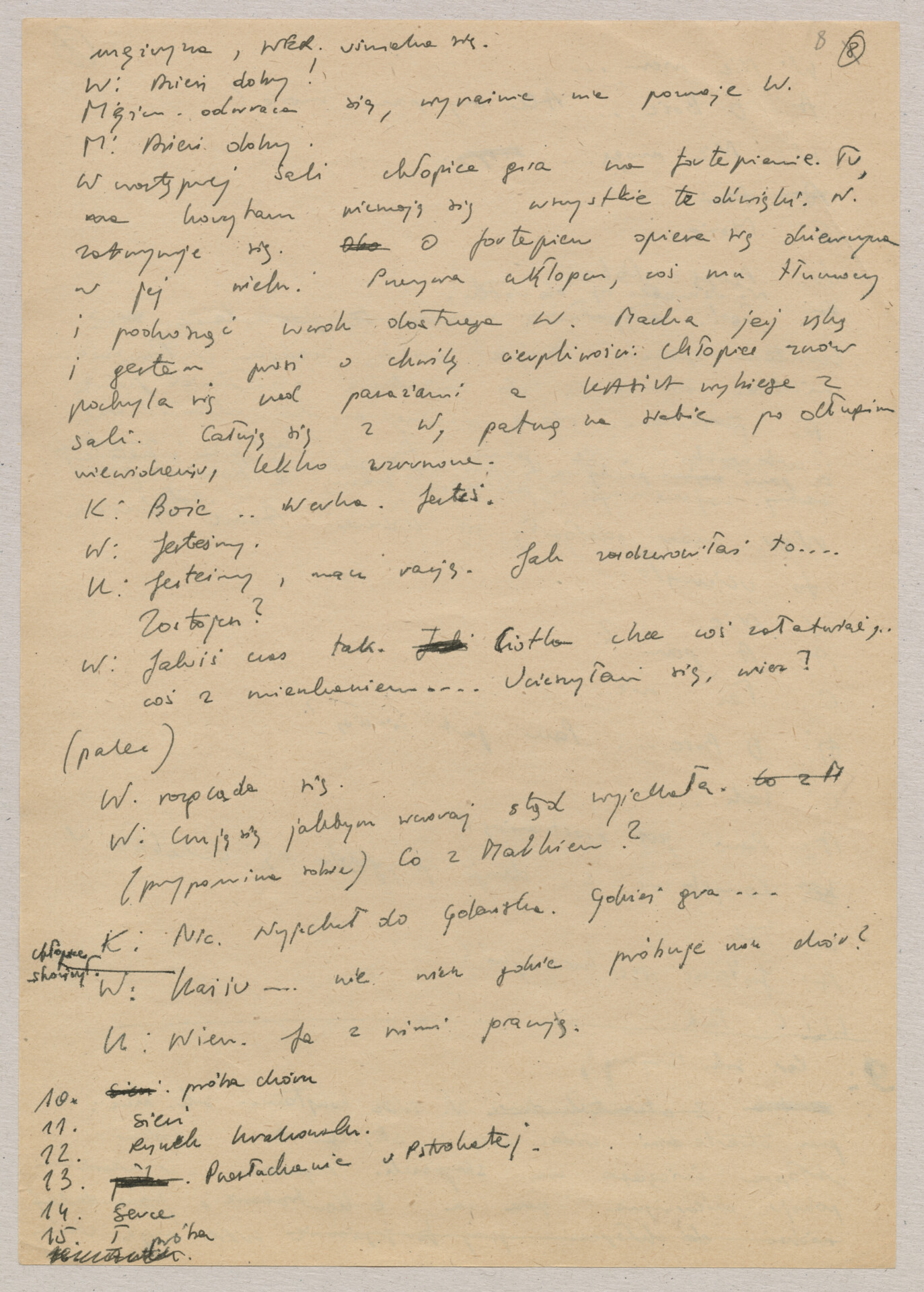 Rękopis scenariusza i notatek do filmu Krzysztofa Kieślowskiego “Podwójne życie Weroniki” (1991) – pierwszego zagranicznego filmu reżysera. W momencie pracy nad filmem posługiwano się tytułem “Chórzystka”. Autorami scenariusza są Krzysztof Piesiewicz i Krzysztof Kieślowski, którzy przedstawiają opowieść o dwóch identycznych kobietach, Polce i Francuzce (obie role grane przez Irène Jacob), które w niewytłumaczalny sposób odczuwają swoją wzajemną obecność. Strony od 1. do 15. stanowią uzupełnienia stron scenariusza. Strony od 16. do 17. zatytułowane są “Poprawki po pierwszym czytaniu pierwszej wersji scenariusza”. Strony od 18. do 42. stanowią uzupełnienie poszczególnych scen. Strony od 43. do 44. zatytułowane są “Różne”. Strona 45. zatytułowana jest “O głosie, o śpiewaniu”.