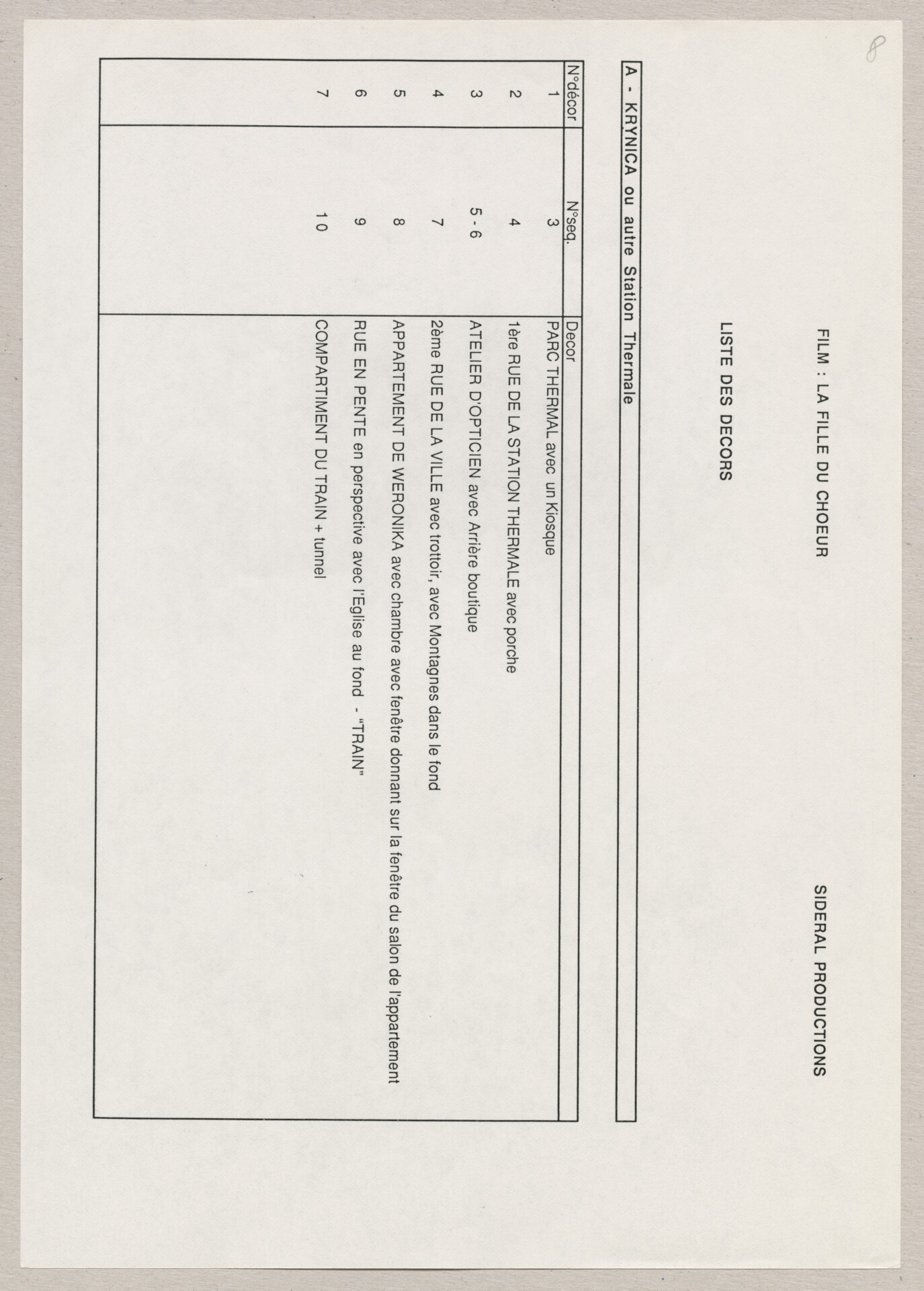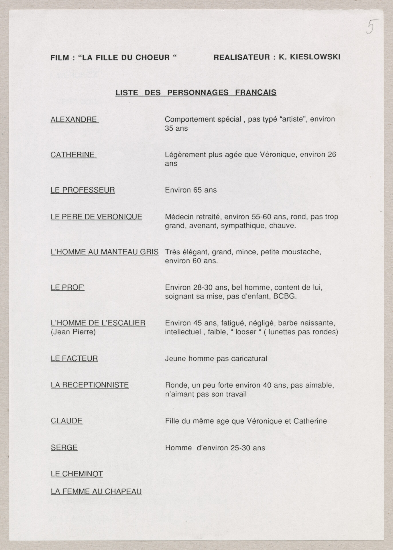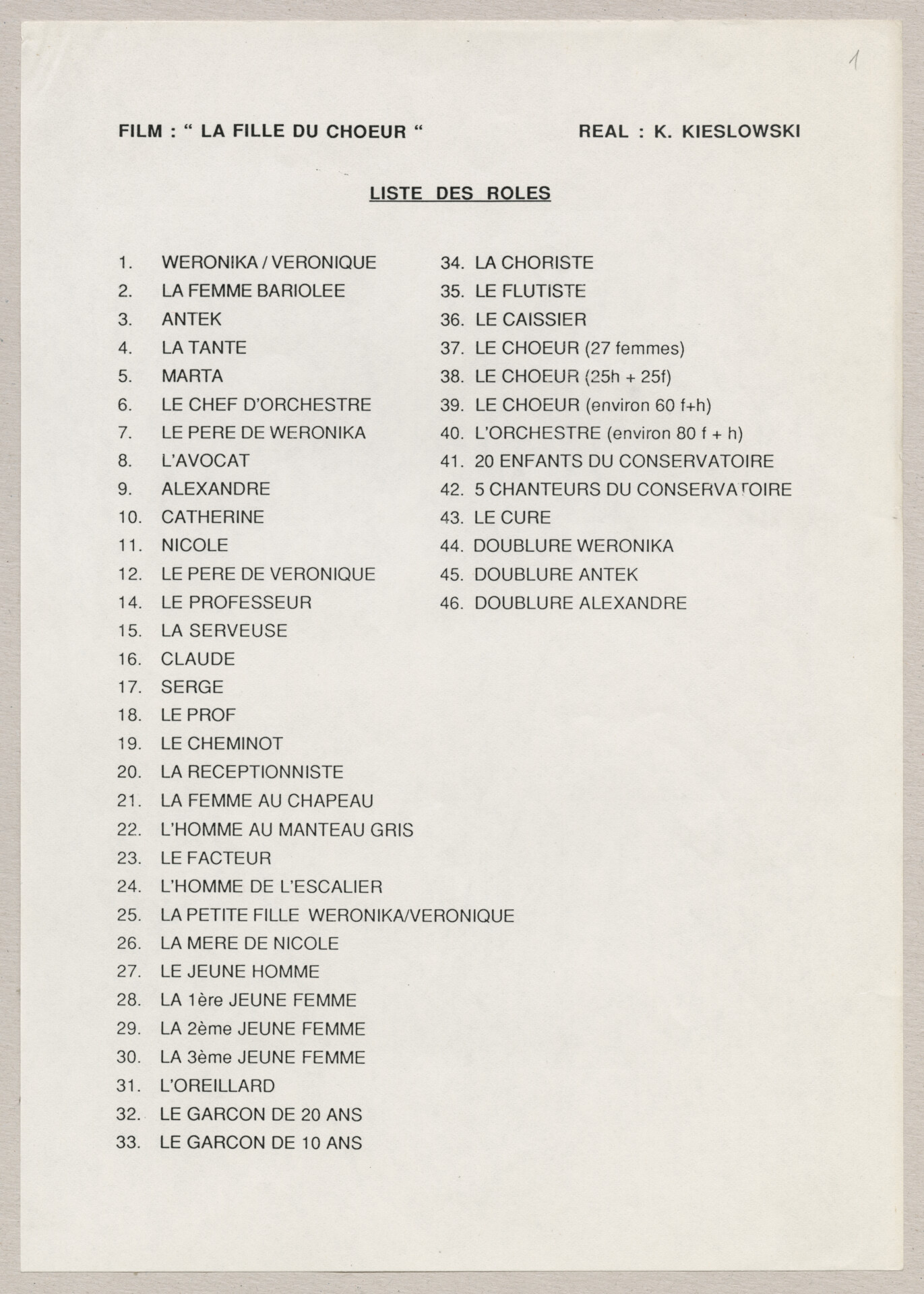 Wydruk komputerowy materiałów produkcyjnych do filmu Krzysztofa Kieślowskiego “Podwójne życie Weroniki” (1991) – pierwszego zagranicznego filmu reżysera. W momencie pracy nad filmem posługiwano się tytułem “Chórzystka”. Autorami scenariusza są Krzysztof Piesiewicz i Krzysztof Kieślowski, którzy przedstawiają opowieść o dwóch identycznych kobietach, Polce i Francuzce (obie role grane przez Irène Jacob), które w niewytłumaczalny sposób odczuwają swoją wzajemną obecność. Strona 1. to lista ról. Strona 2. to lista postaci. Strona 3. to lista pojazdów. Strona 4. to lista zwierząt. Strona 5. to lista bohaterów francuskich. Strony od 6. do 7. to lista ról i sekwencji. Strony od 8. do 12. to lista dekoracji. Dokument powiązany jest z dokumentami o sygnaturach: ATKK-POD-I-008, ATKK-POD-I-009, ATKK-POD-I-010, ATKK-POD-I-011, ATKK-POD-I-014.
