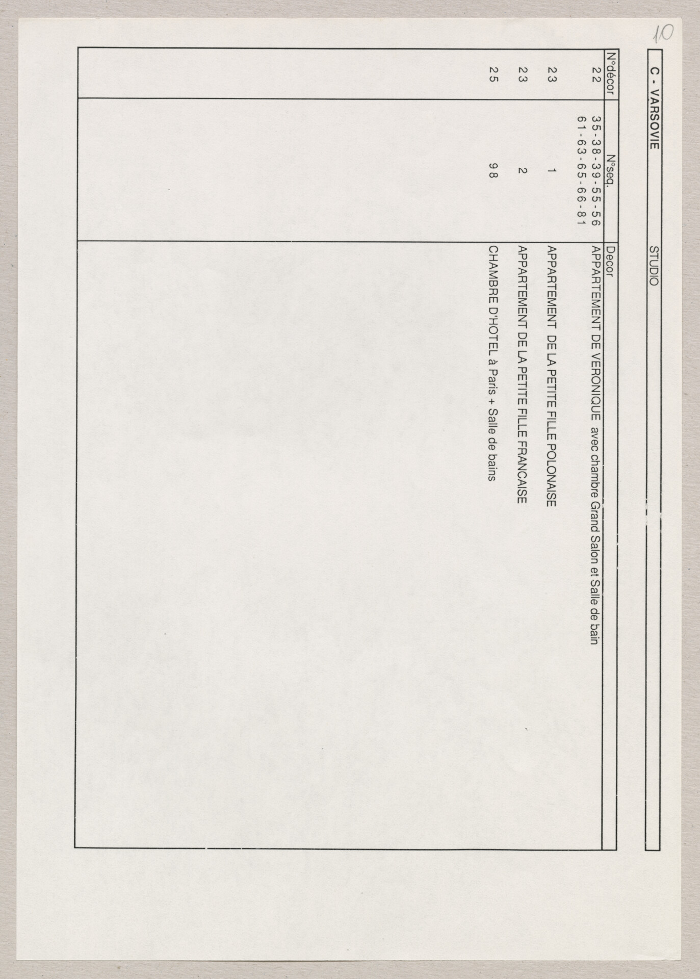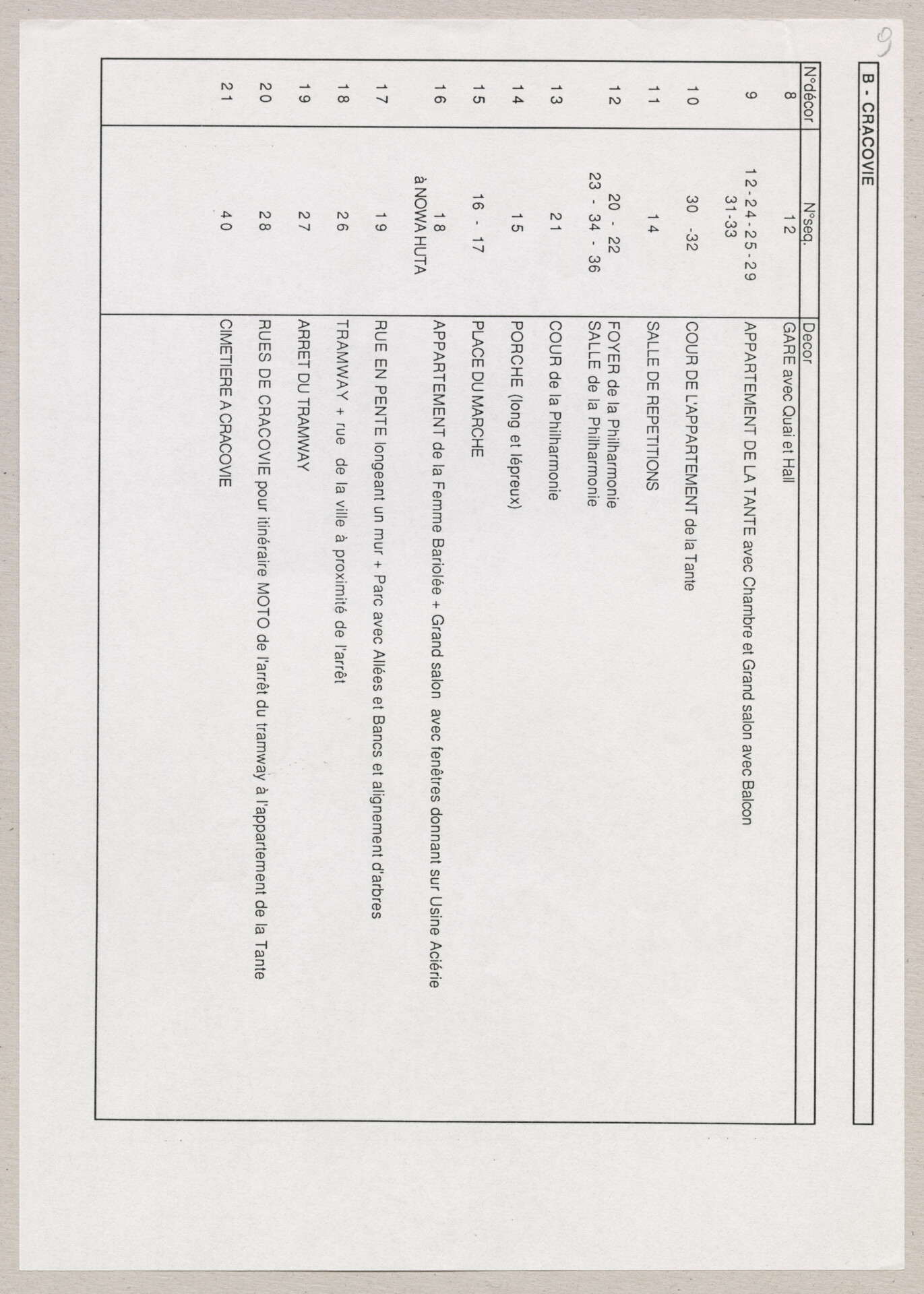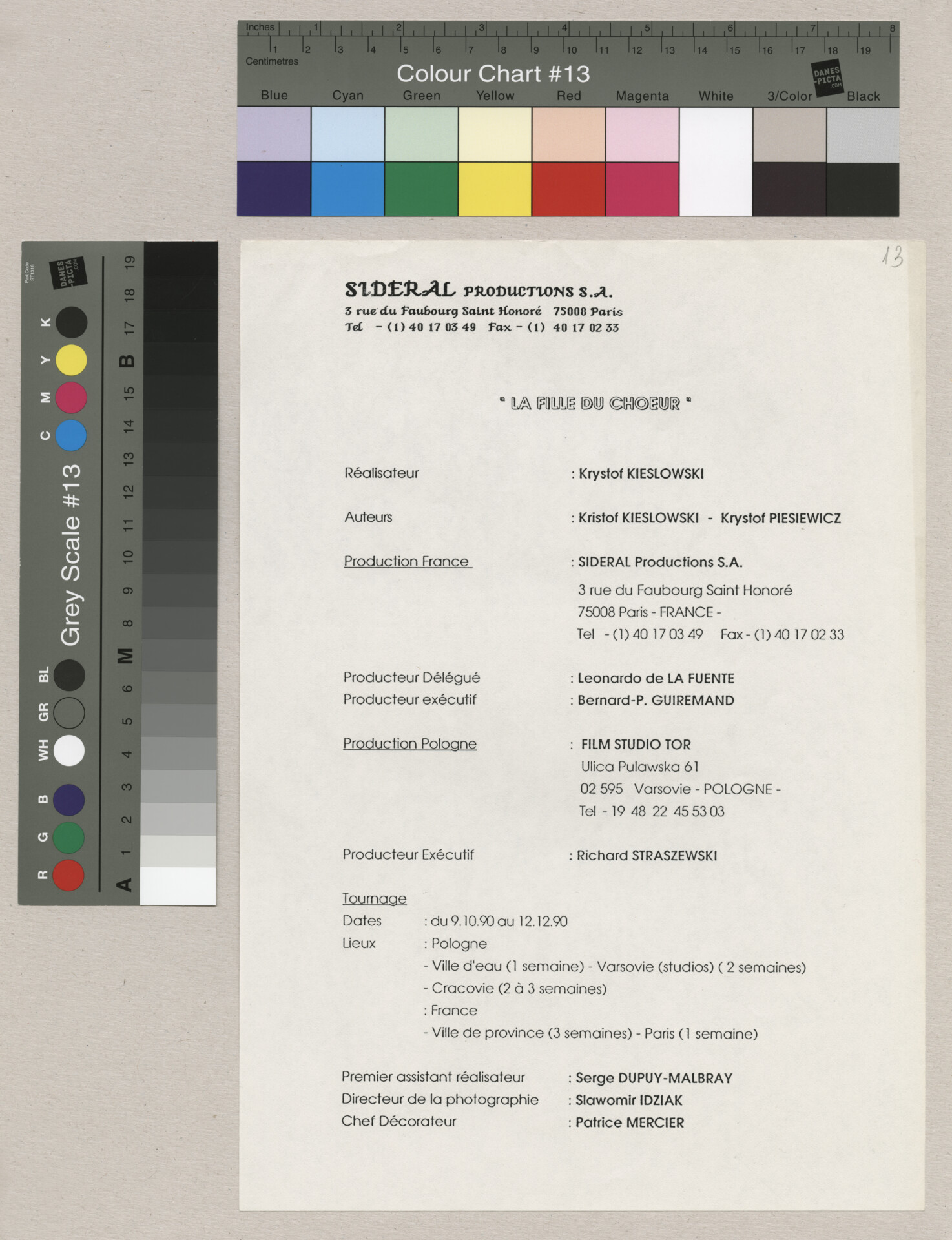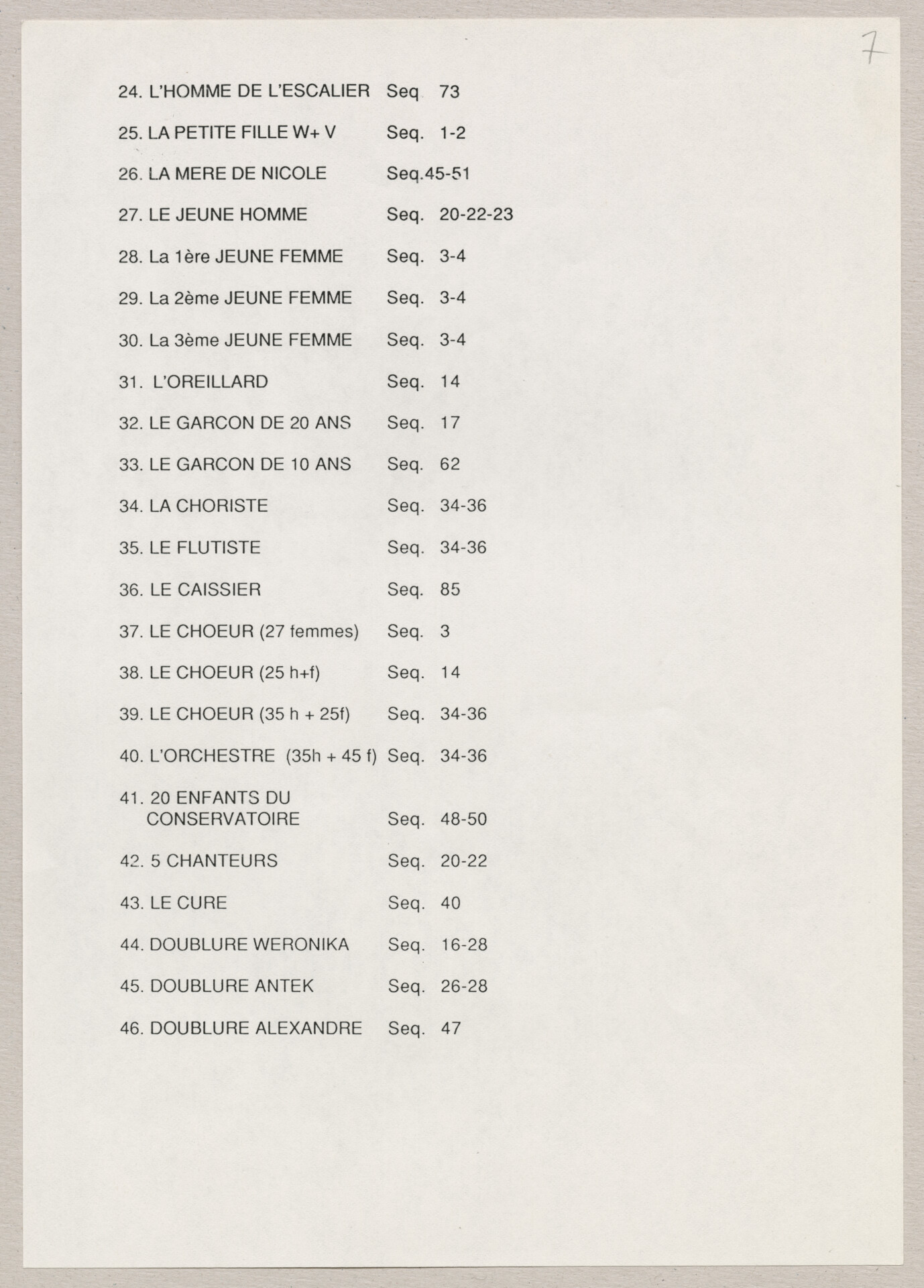 Wydruk komputerowy materiałów produkcyjnych do filmu Krzysztofa Kieślowskiego “Podwójne życie Weroniki” (1991) – pierwszego zagranicznego filmu reżysera. W momencie pracy nad filmem posługiwano się tytułem “Chórzystka”. Autorami scenariusza są Krzysztof Piesiewicz i Krzysztof Kieślowski, którzy przedstawiają opowieść o dwóch identycznych kobietach, Polce i Francuzce (obie role grane przez Irène Jacob), które w niewytłumaczalny sposób odczuwają swoją wzajemną obecność. Strona 1. to lista ról. Strona 2. to lista postaci. Strona 3. to lista pojazdów. Strona 4. to lista zwierząt. Strona 5. to lista bohaterów francuskich. Strony od 6. do 7. to lista ról i sekwencji. Strony od 8. do 12. to lista dekoracji. Dokument powiązany jest z dokumentami o sygnaturach: ATKK-POD-I-008, ATKK-POD-I-009, ATKK-POD-I-010, ATKK-POD-I-011, ATKK-POD-I-014.