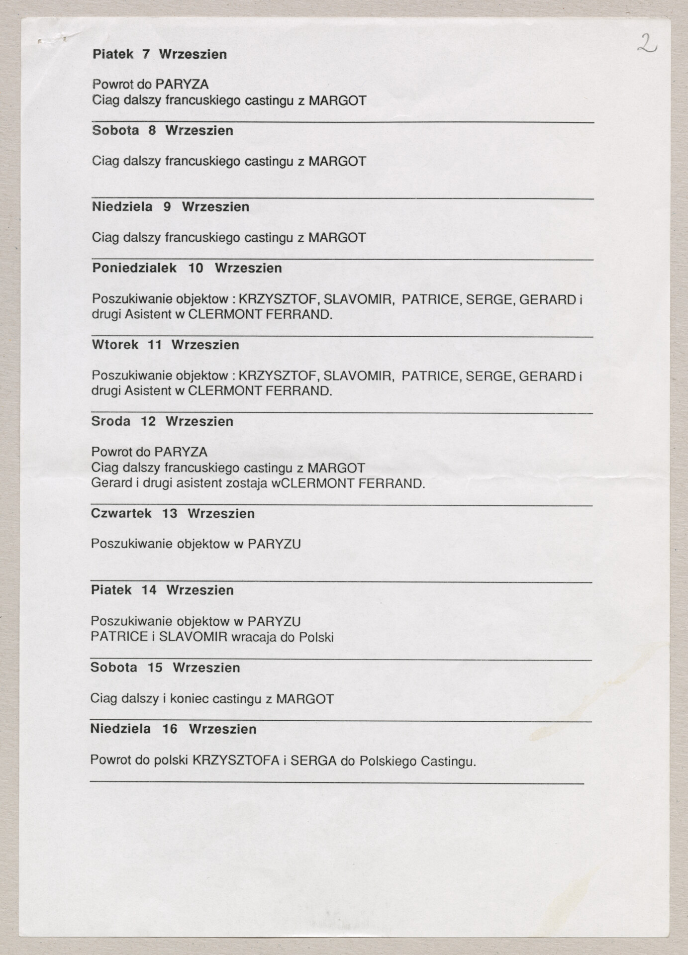 Wydruk komputerowy planu pobytu ekipy francuskiej do filmu Krzysztofa Kieślowskiego “Podwójne życie Weroniki” (1991) – pierwszego zagranicznego filmu reżysera. W momencie pracy nad filmem posługiwano się tytułem “Chórzystka”. Autorami scenariusza są Krzysztof Piesiewicz i Krzysztof Kieślowski, którzy przedstawiają opowieść o dwóch identycznych kobietach, Polce i Francuzce (obie role grane przez Irène Jacob), które w niewytłumaczalny sposób odczuwają swoją wzajemną obecność. Dokument zawiera plan pobytu ekipy francuskiej od 27 sierpnia do 16 września – castingi, spotkania, zwiedzanie obiektów w Krakowie, zwiedzanie obiektów zdrojowych 150 km od Krakowa, francuskie castingi, poszukiwanie obiektów w Paryżu.