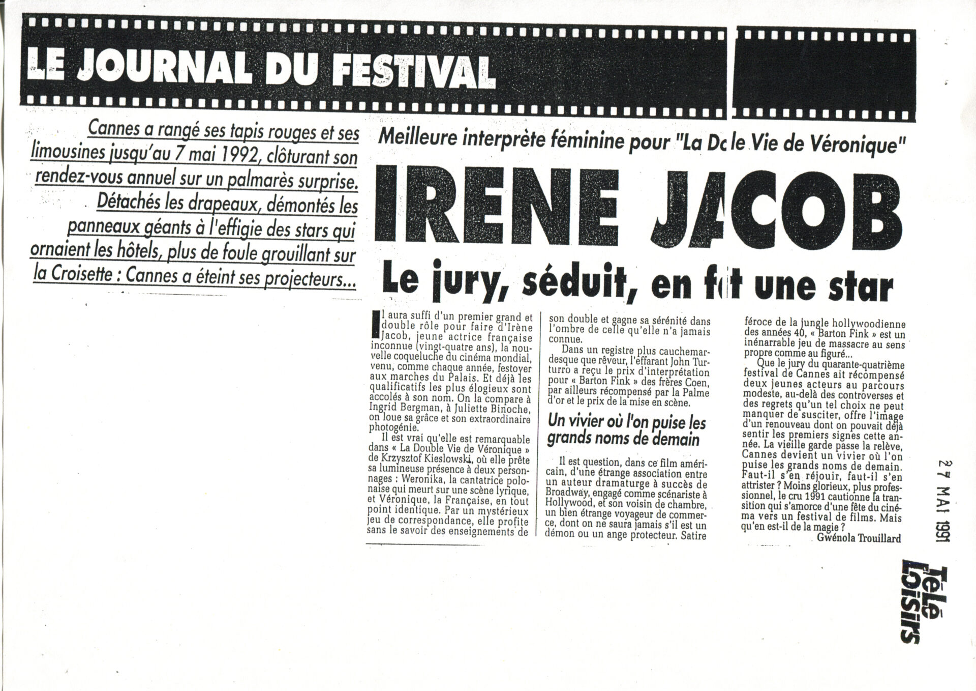 Wycinek prasowy z gazety francuskiej “Le Loisirs” zatytułowany “Irene Jacob. Le jury, seduit, en fait une star”.