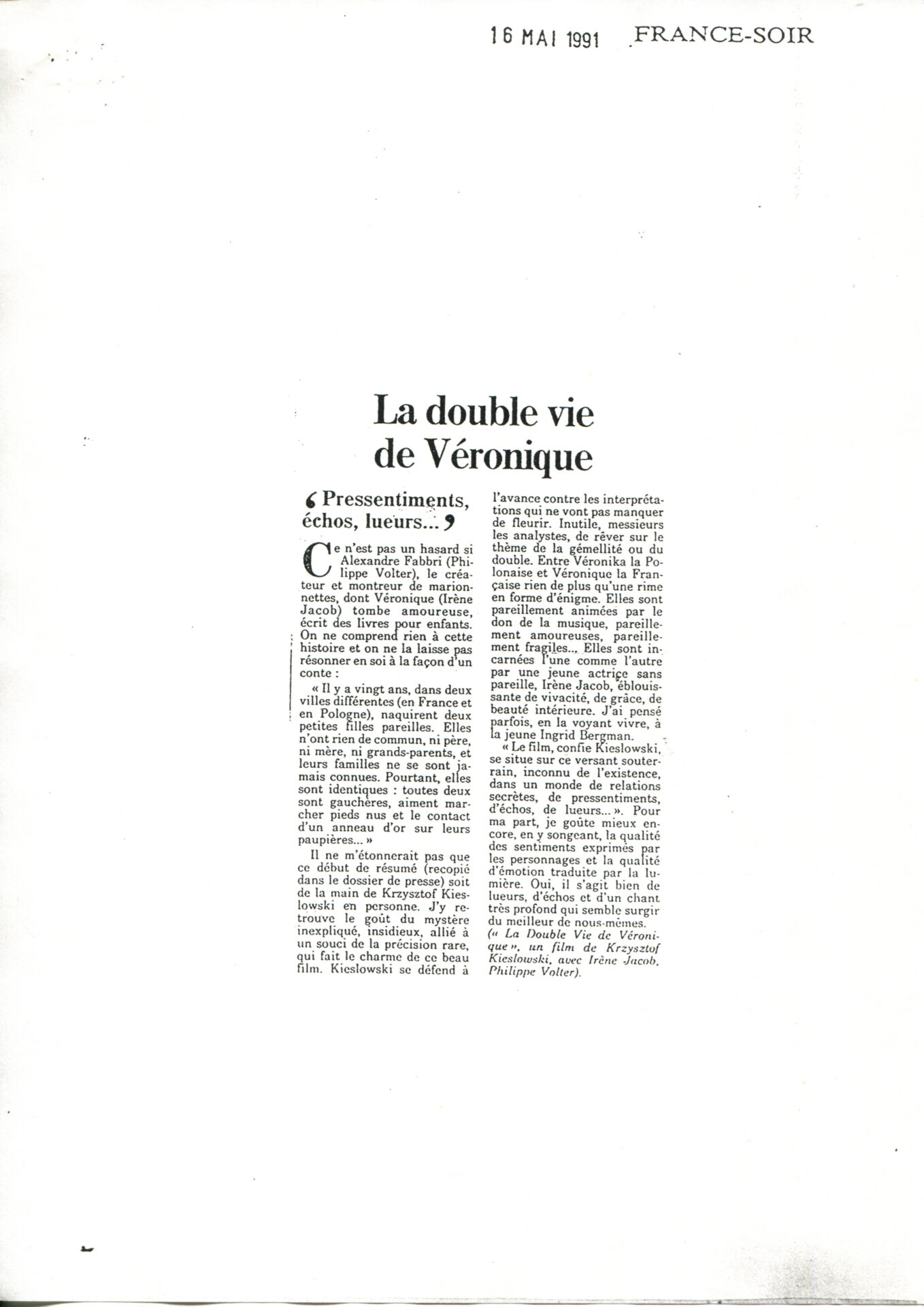 Wycinek prasowy z gazety “FRANCE-SOIR” zatytułowany “La double vie de Veronique”.
