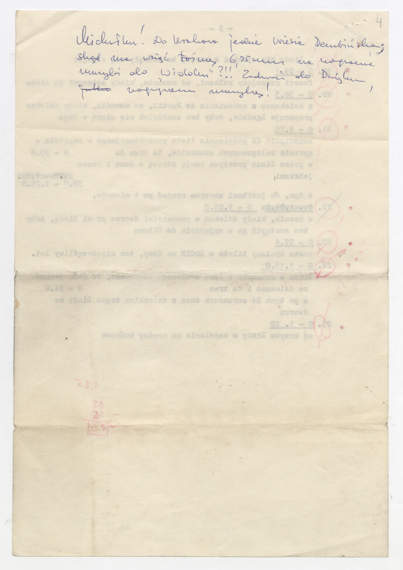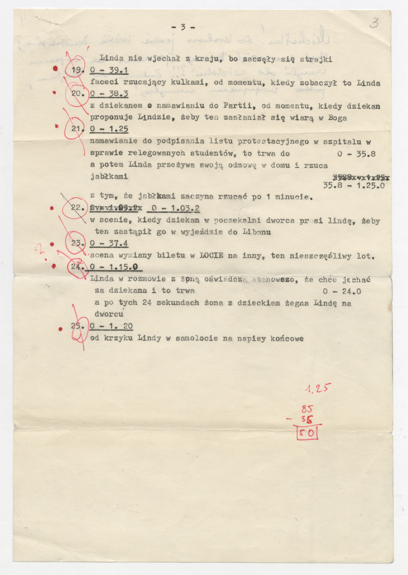 Maszynopis z dokumentacją zdjęć filmowych i muzyką do filmu Krzysztofa Kieślowskiego “Przypadek” (1981). Scenariusz napisał Krzysztof Kieślowski. Zdjęcia do tego filmu zrealizował Krzysztof Pakulski. Film został wyprodukowany przez Zespół Filmowy Tor. Dokument ma formę kilkustronicowej listy zawierającej oznaczenia czasowe trwania muzyki w minutach, sekundach i klatkach oraz opisy odpowiadających im scen filmowych. Opisane są m.in. sekwencje z udziałem głównego bohatera. Dokument ma charakter roboczej listy montażowo-muzycznej, służącej do precyzyjnego powiązania fragmentów muzyki z konkretnymi scenami filmu. Muzykę do filmu skomponował Wojciech Kilar. Dokument zawiera odręczne poprawki i notatki autora.