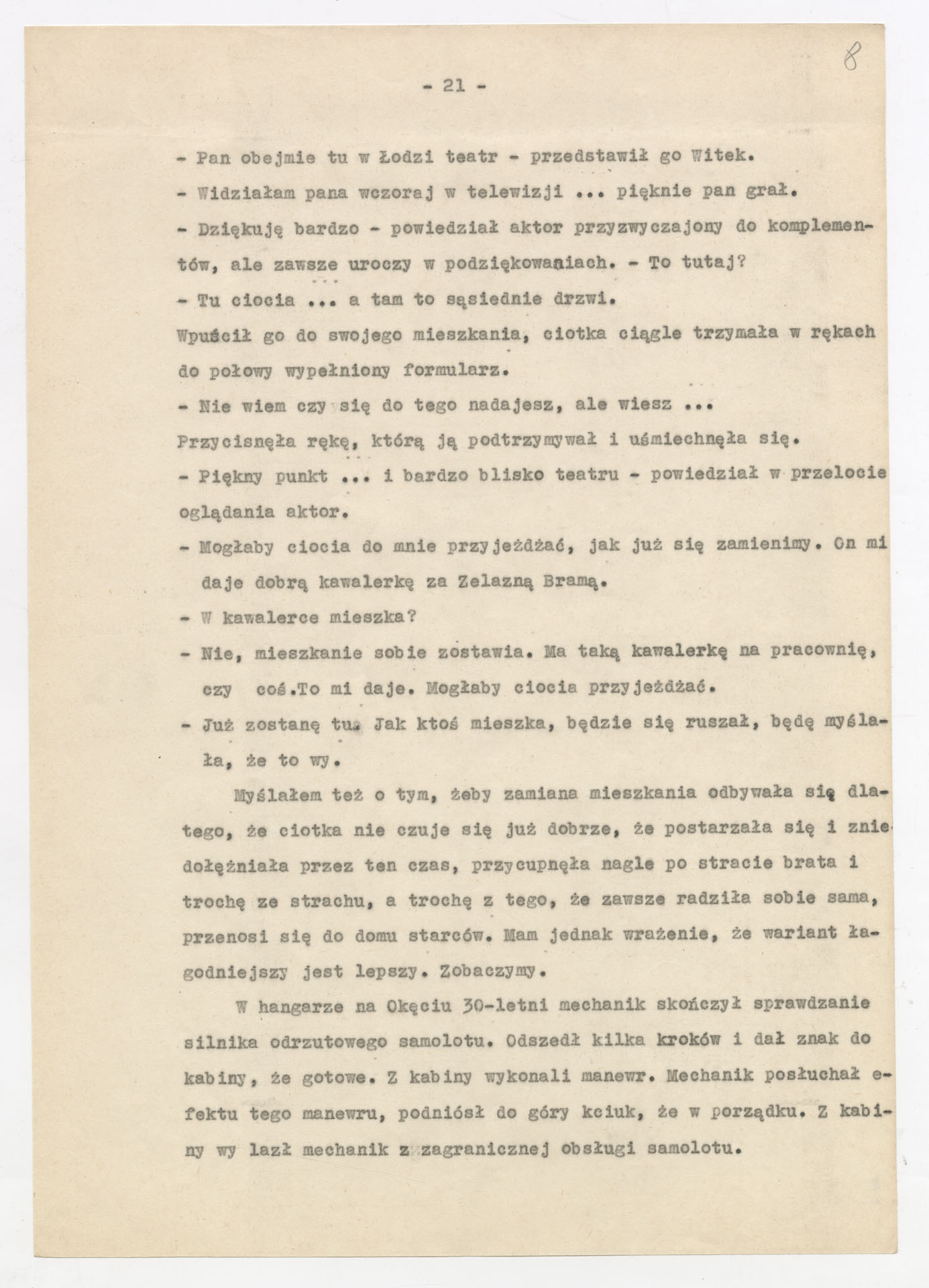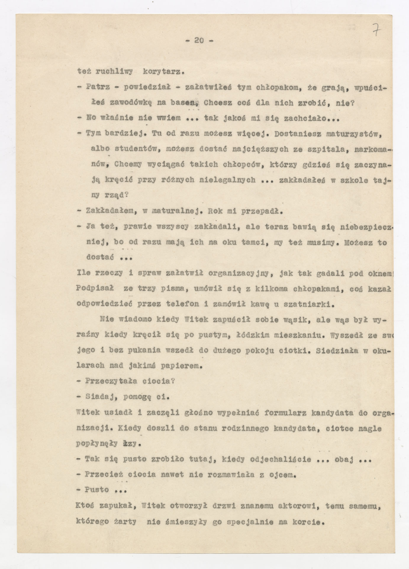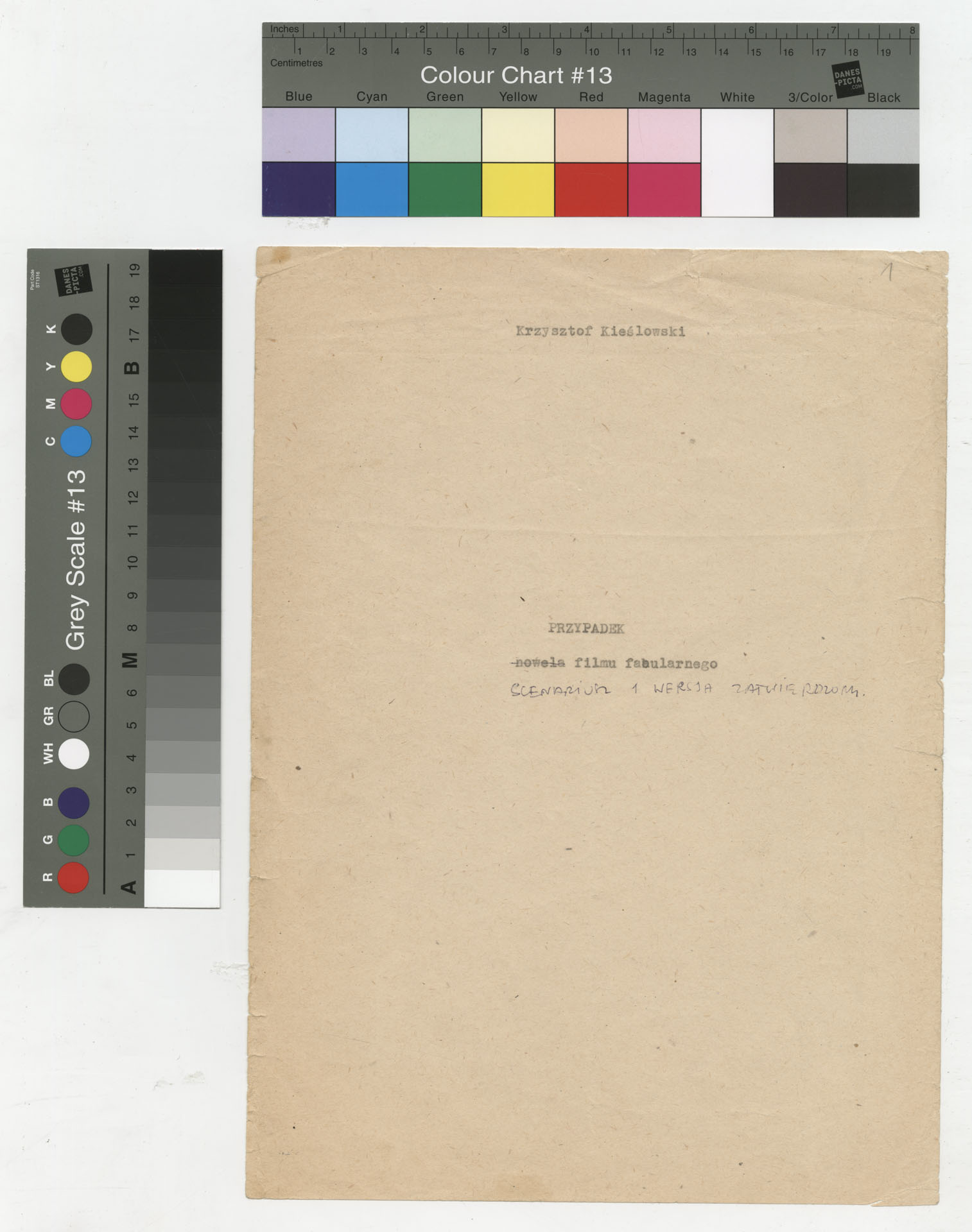 Kopia maszynopisu ze scenariuszem do filmu Krzysztofa Kieślowskiego “Przypadek” (1981). Scenariusz napisał Krzysztof Kieślowski. Zdjęcia do tego filmu zrealizował Krzysztof Pakulski. Film został wyprodukowany przez Zespół Filmowy Tor. Dokument nosi tytuł “Przypadek – nowela filmu fabularnego” poprawiony na “scenariusz, 1. wersja, zatwierdzony” i ma postać prozatorskiego opowiadania o losach głównego bohatera, Witka Długosza – od jego narodzin, przez dzieciństwo, lata szkolne, relacje rodzinne (m.in. z ojcem, ciotką, wujem), aż po dorosłe wybory życiowe i polityczne (działalność w organizacjach młodzieżowych, praca na kortach tenisowych, zaangażowanie społeczne). Tekst zawiera również rozbudowane charakterystyki postaci drugoplanowych, refleksje autora na temat kształtowania się osobowości bohatera oraz wariantowe pomysły na rozwinięcie wątków fabularnych, co nadaje dokumentowi charakter scenariusza filmu. Dokument zawiera odręczne poprawki i notatki autora.