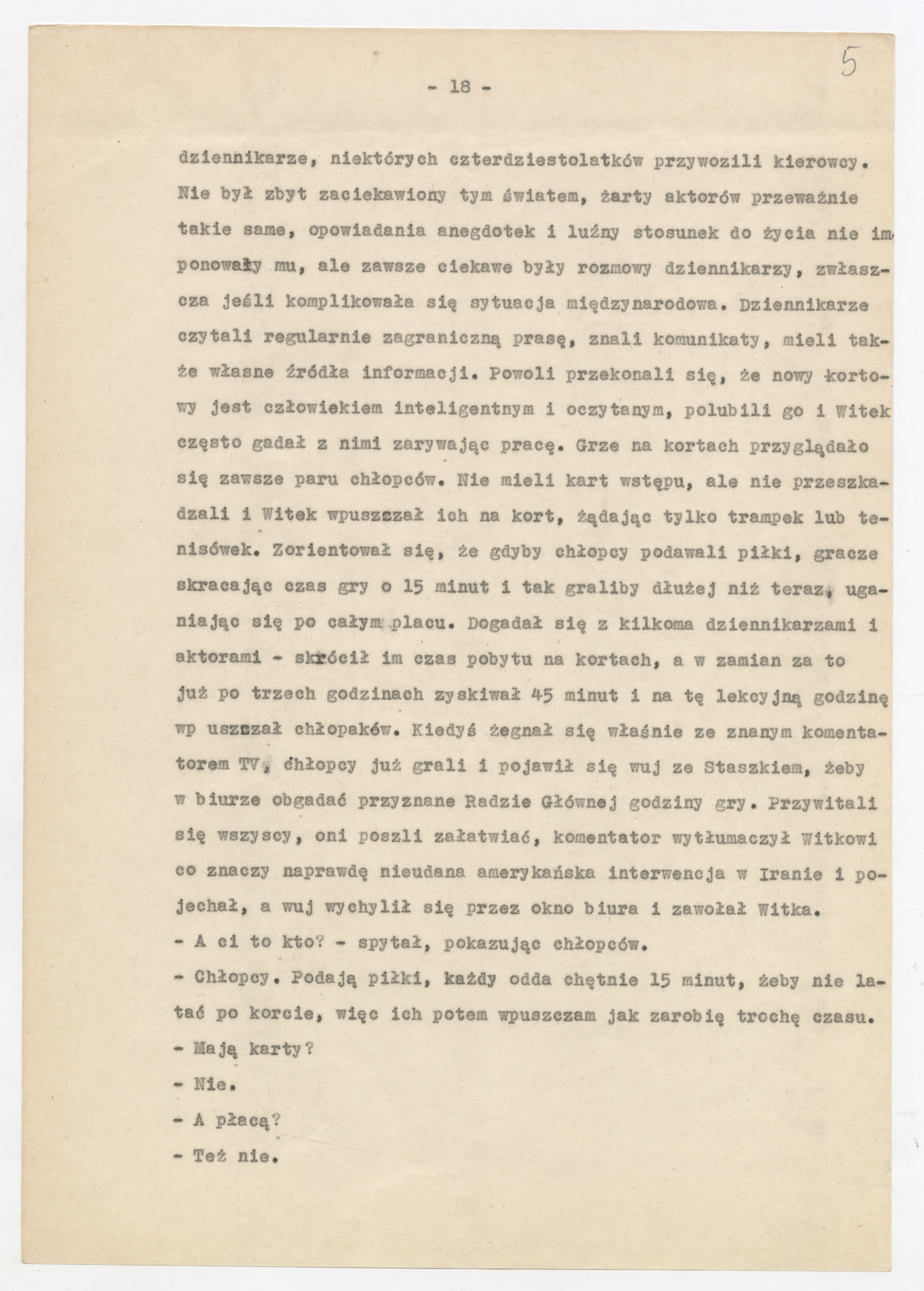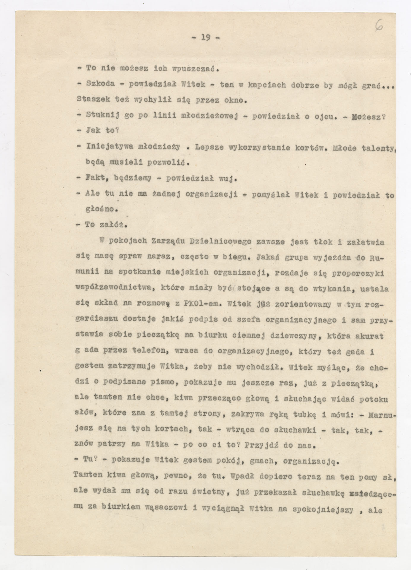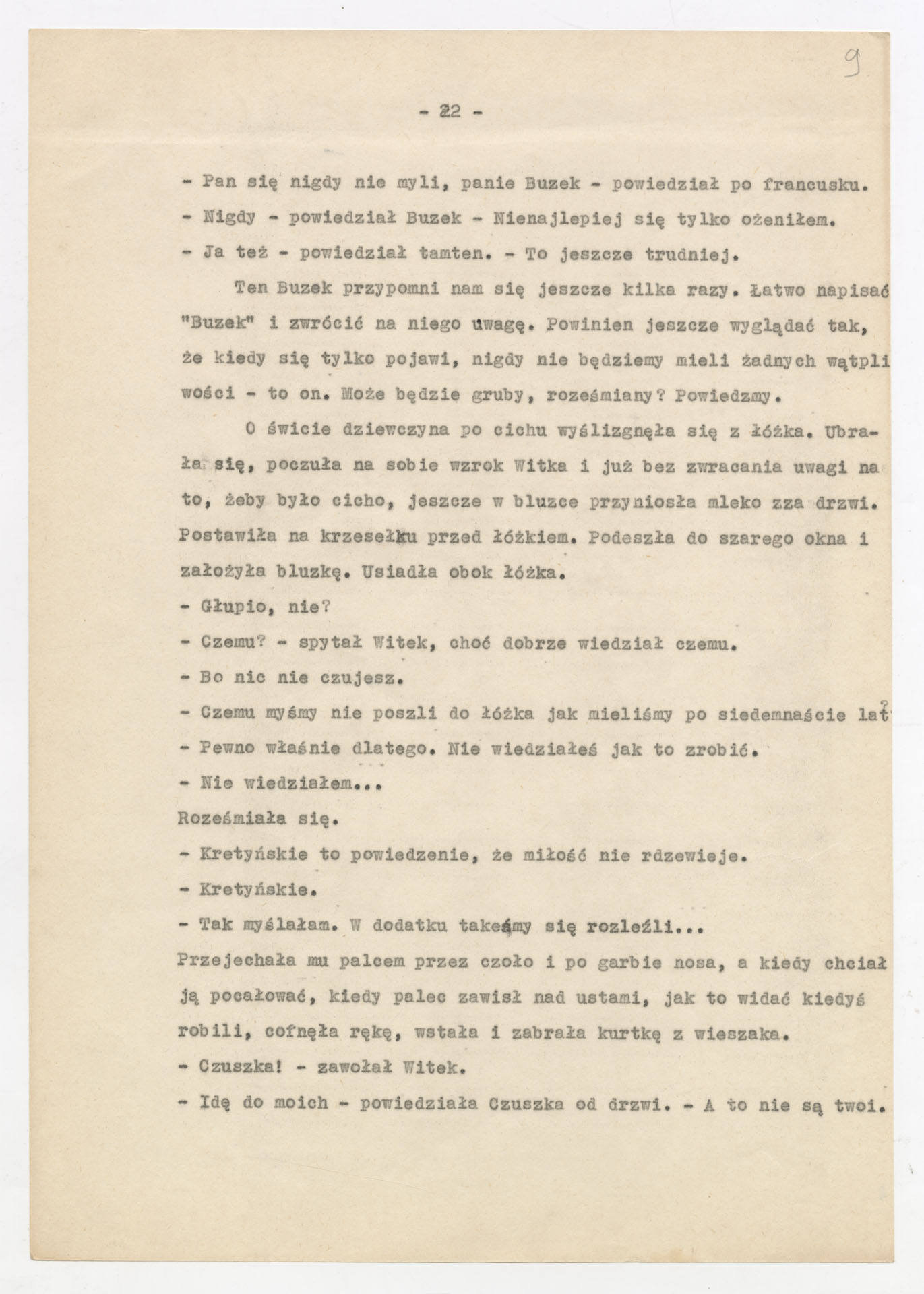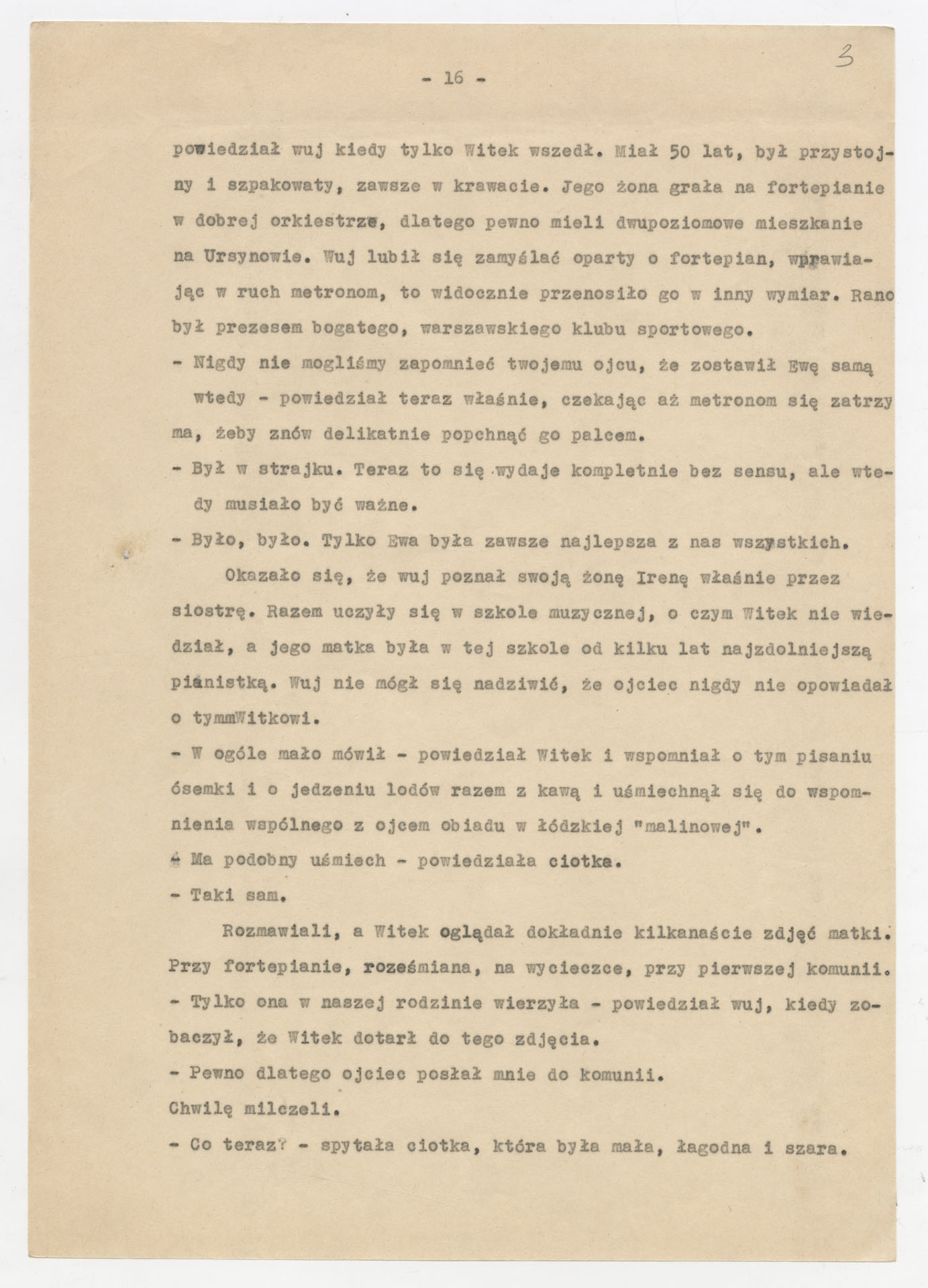 Kopia maszynopisu ze scenariuszem do filmu Krzysztofa Kieślowskiego “Przypadek” (1981). Scenariusz napisał Krzysztof Kieślowski. Zdjęcia do tego filmu zrealizował Krzysztof Pakulski. Film został wyprodukowany przez Zespół Filmowy Tor. Dokument nosi tytuł “Przypadek – nowela filmu fabularnego” poprawiony na “scenariusz, 1. wersja, zatwierdzony” i ma postać prozatorskiego opowiadania o losach głównego bohatera, Witka Długosza – od jego narodzin, przez dzieciństwo, lata szkolne, relacje rodzinne (m.in. z ojcem, ciotką, wujem), aż po dorosłe wybory życiowe i polityczne (działalność w organizacjach młodzieżowych, praca na kortach tenisowych, zaangażowanie społeczne). Tekst zawiera również rozbudowane charakterystyki postaci drugoplanowych, refleksje autora na temat kształtowania się osobowości bohatera oraz wariantowe pomysły na rozwinięcie wątków fabularnych, co nadaje dokumentowi charakter scenariusza filmu. Dokument zawiera odręczne poprawki i notatki autora.