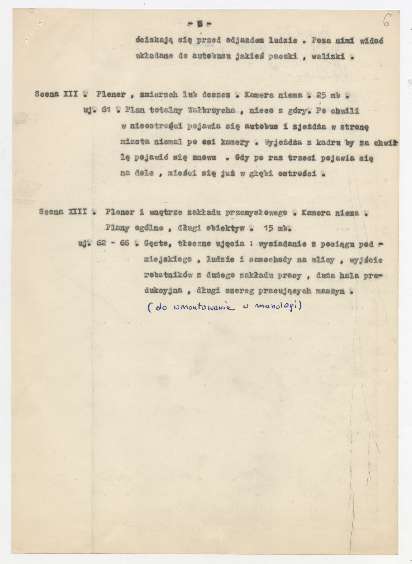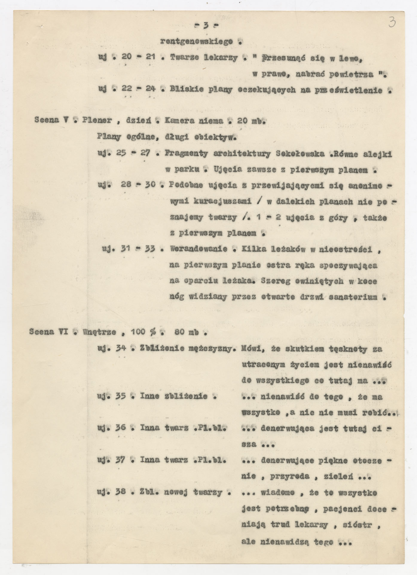 Maszynopis ze scecnopisem filmu Krzysztofa Kieślowskiego “Prześwietlenie” (1974) wyprodukowanego przez Wytwórnię Filmów Dokumentalnych. Zanim film nosił ten tytuł, praca nad nim trwała pod roboczym tytułem “Wrócić jak najprędzej”. Dokument jest poświęcony chorym na gruźlicę przebywającym w sanatorium. Scenopis zawiera ogólne wyliczenie metrażu (520 m), dane techniczne (taśma barwna, rodzaje kamer, obiektywów i oświetlenia) oraz szczegółowy podział na ponumerowane sceny i ujęcia z określeniem metrażu, rodzaju planu i procentu dźwięku. Opisane są m.in. badania lekarskie, zdjęcia rentgenowskie, operacja, werandowanie, klub kuracjuszy, wyjazd autobusu i powrót pacjentów do pracy w dużym zakładzie przemysłowym. Maszynopis ma charakter scenopisu technicznego, bez widocznych odręcznych poprawek.