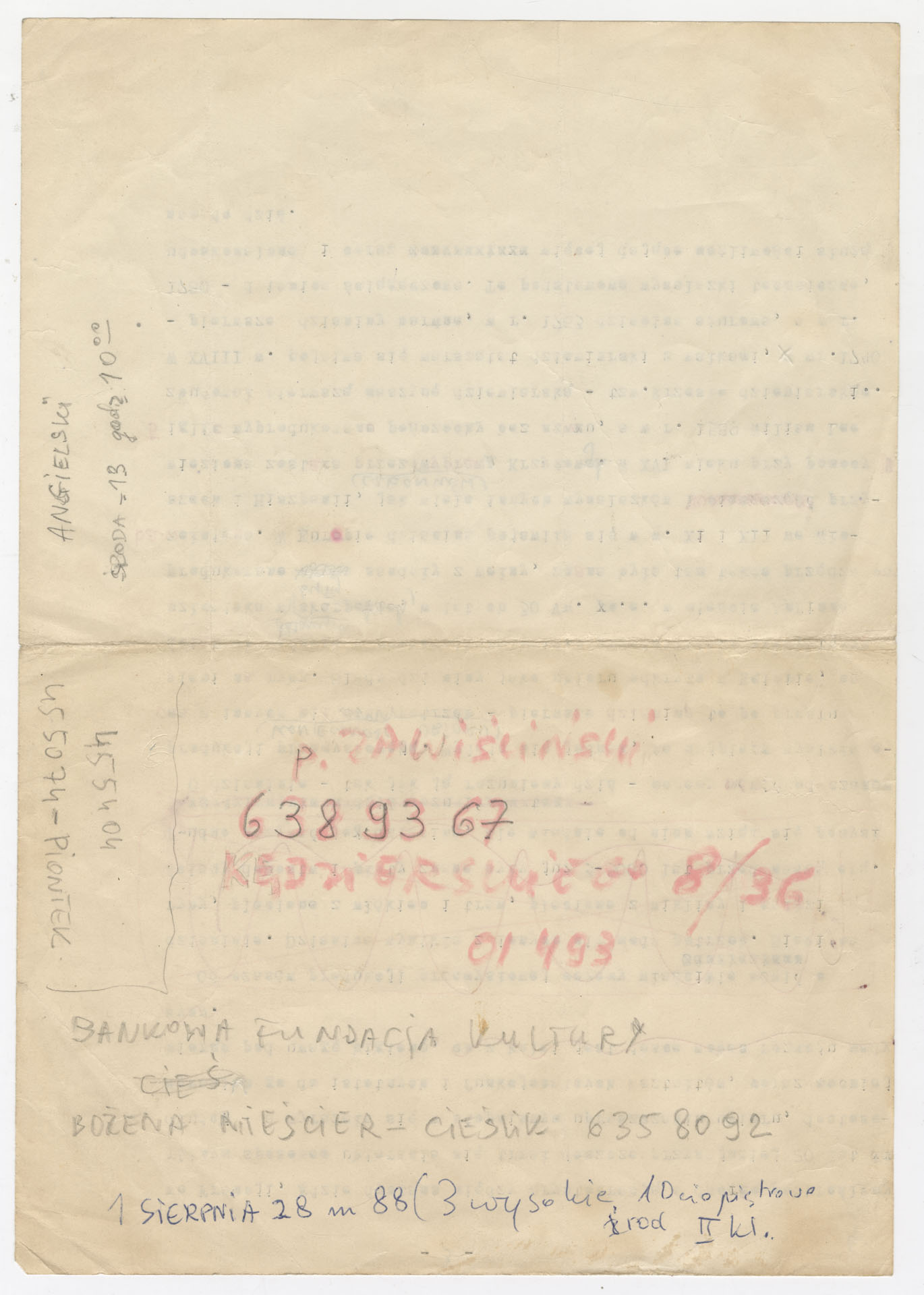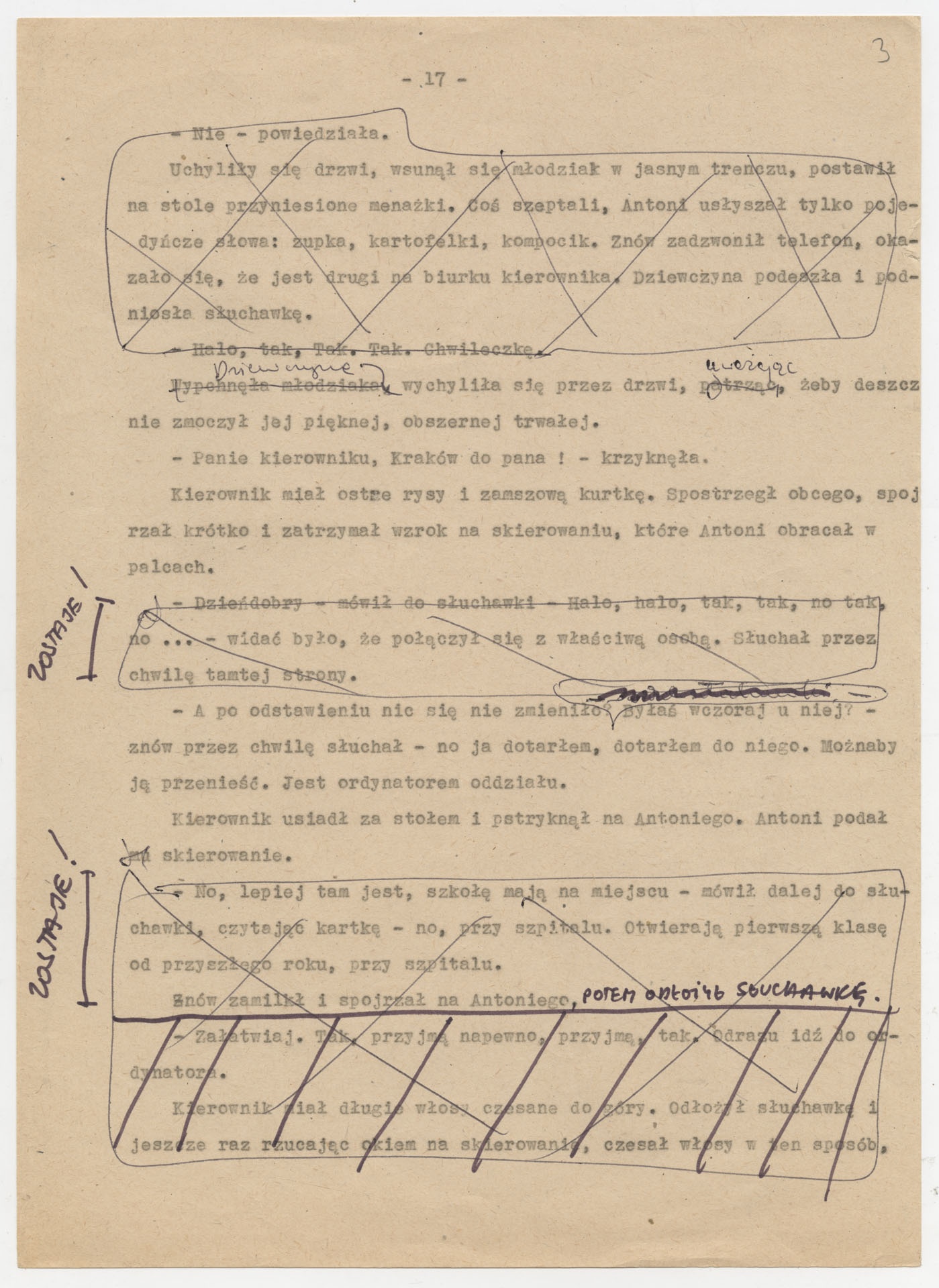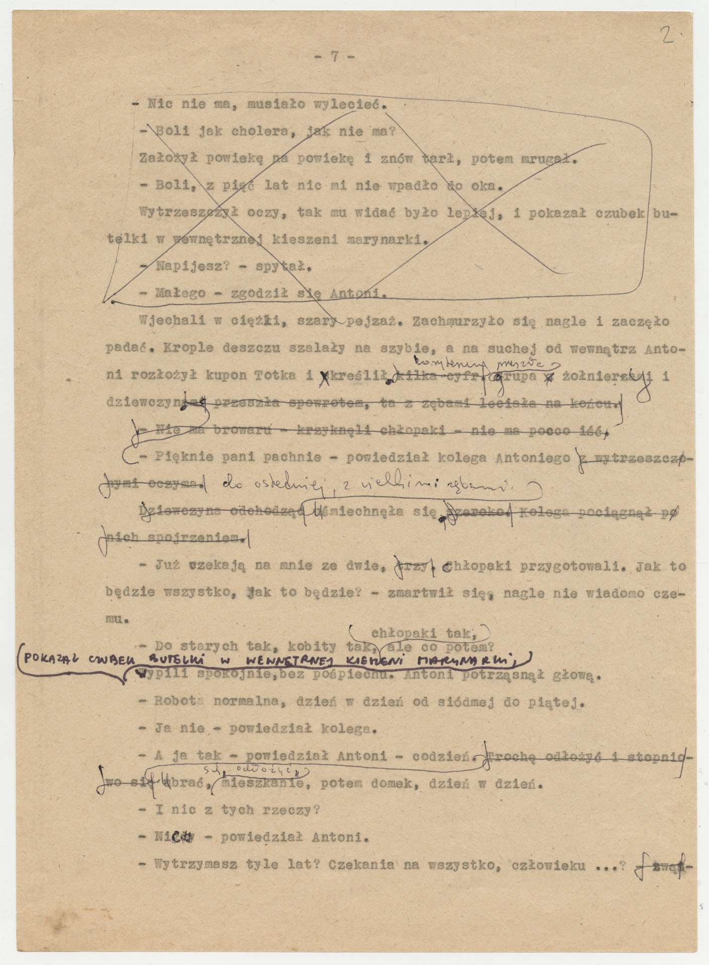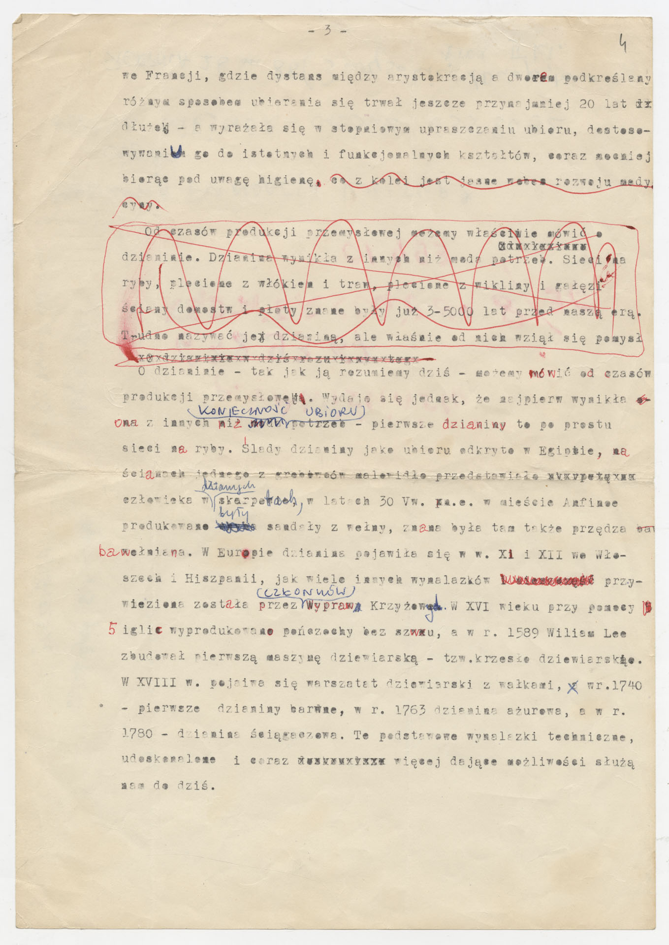 Maszynopis oraz rękopis z tekstem Krzysztofa Kieślowskiego zawierający kilka różnych tekstów o charakterze prozatorskim, publicystycznym i eseistycznym. Pierwsza część to fragment realistycznego opowiadania osadzonego w celi więziennej, z bohaterem Antonim – opis wspólnej wigilii, śpiewanych kolęd, wspomnień ciężkiej pracy przy wyładowywaniu cementu oraz rozmów o marzeniach i odkładaniu “na domek”. Kolejny fragment ma formę szkicu popularnonaukowego o historii dzianiny i dziewiarstwa – od starożytności po rozwój maszyn dziewiarskich w Europie. Ostatnia część to projekt listu – stanowiska łódzkiego środowiska akademickiego, polemizującego z wystąpieniem ministra J. Spychalskiego i odwołującego się do deklaracji W. Gomułki na temat sposobu traktowania studentów. Całość to wielostronicowy maszynopis, bez wyraźnych odręcznych poprawek.