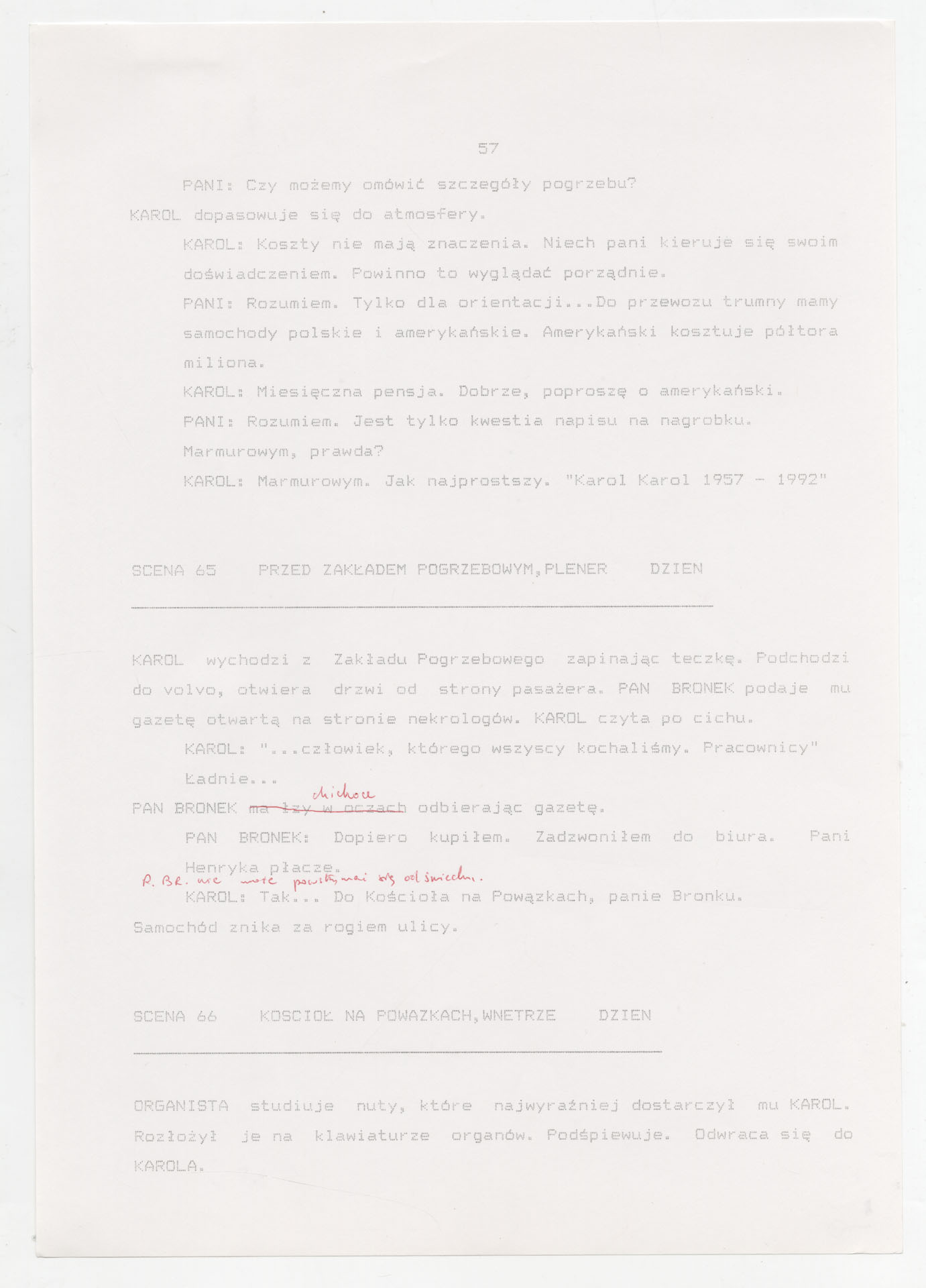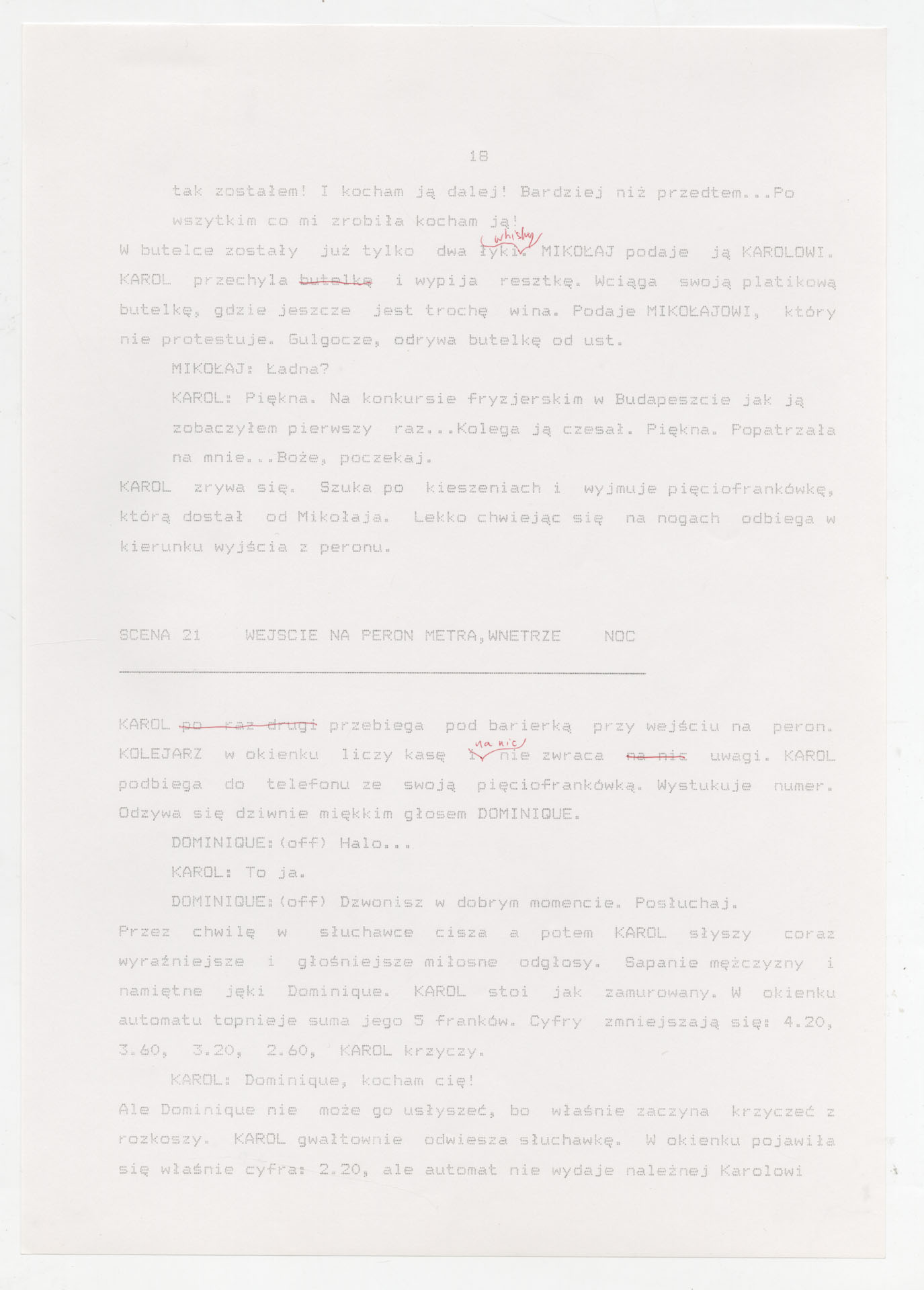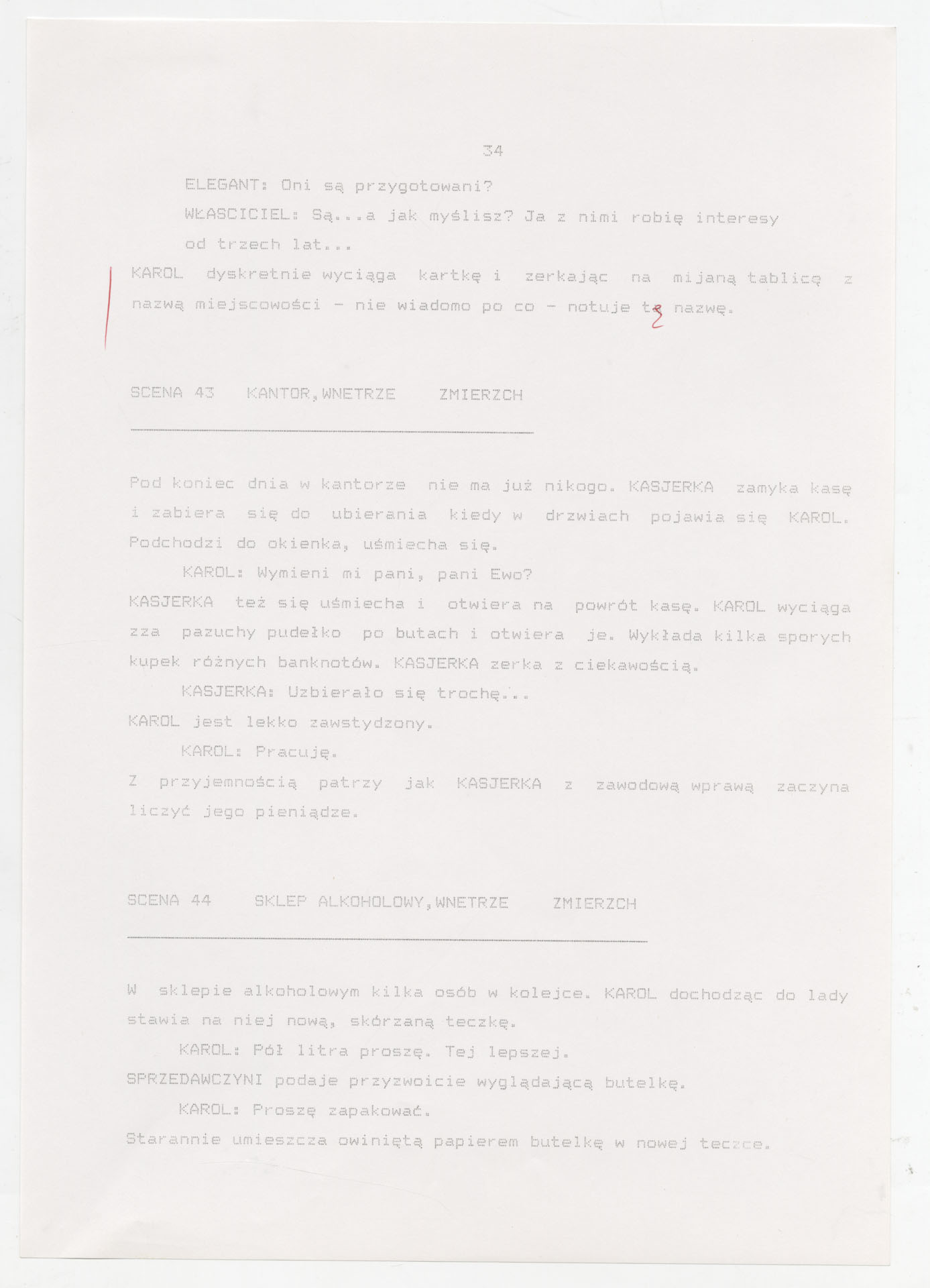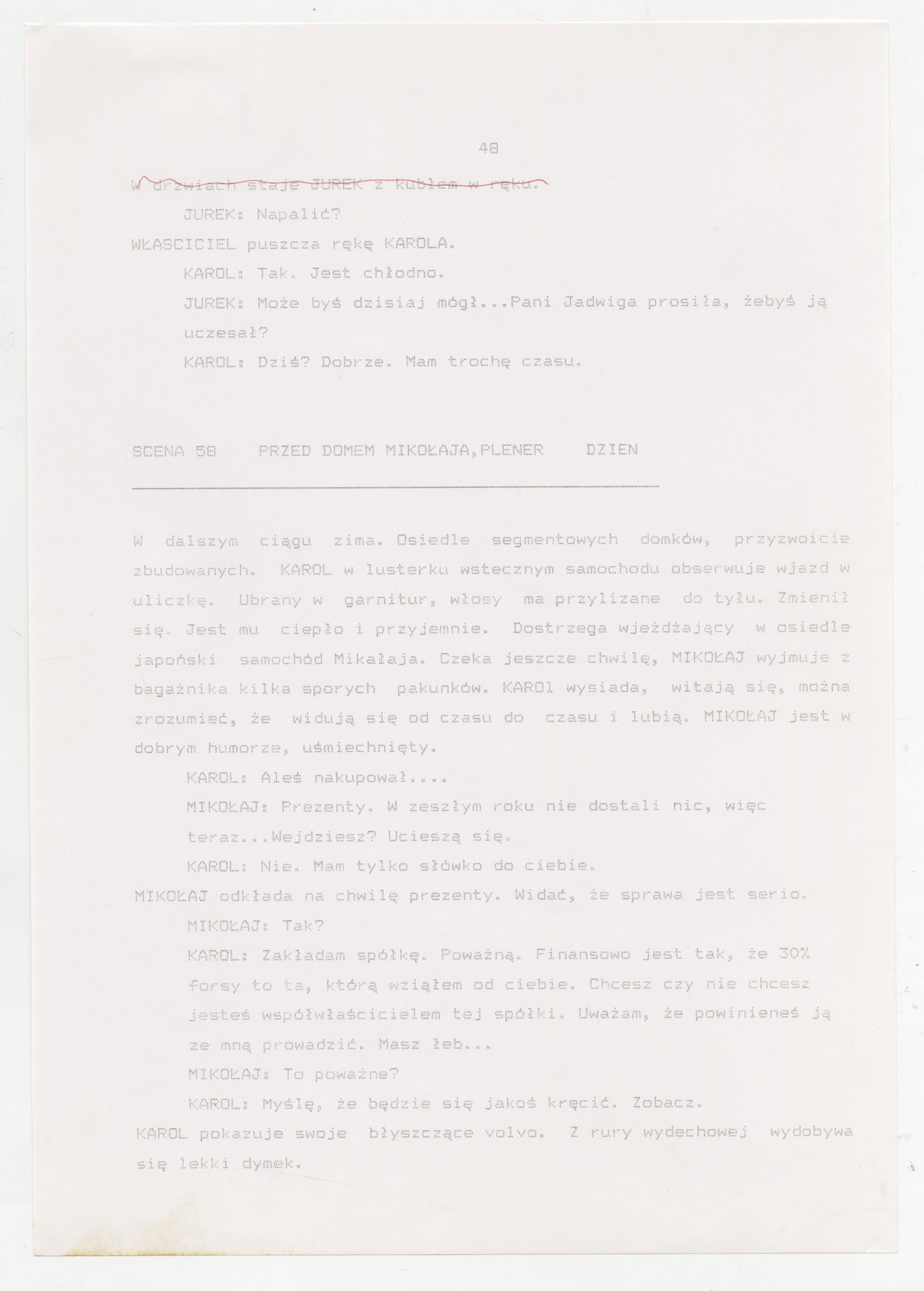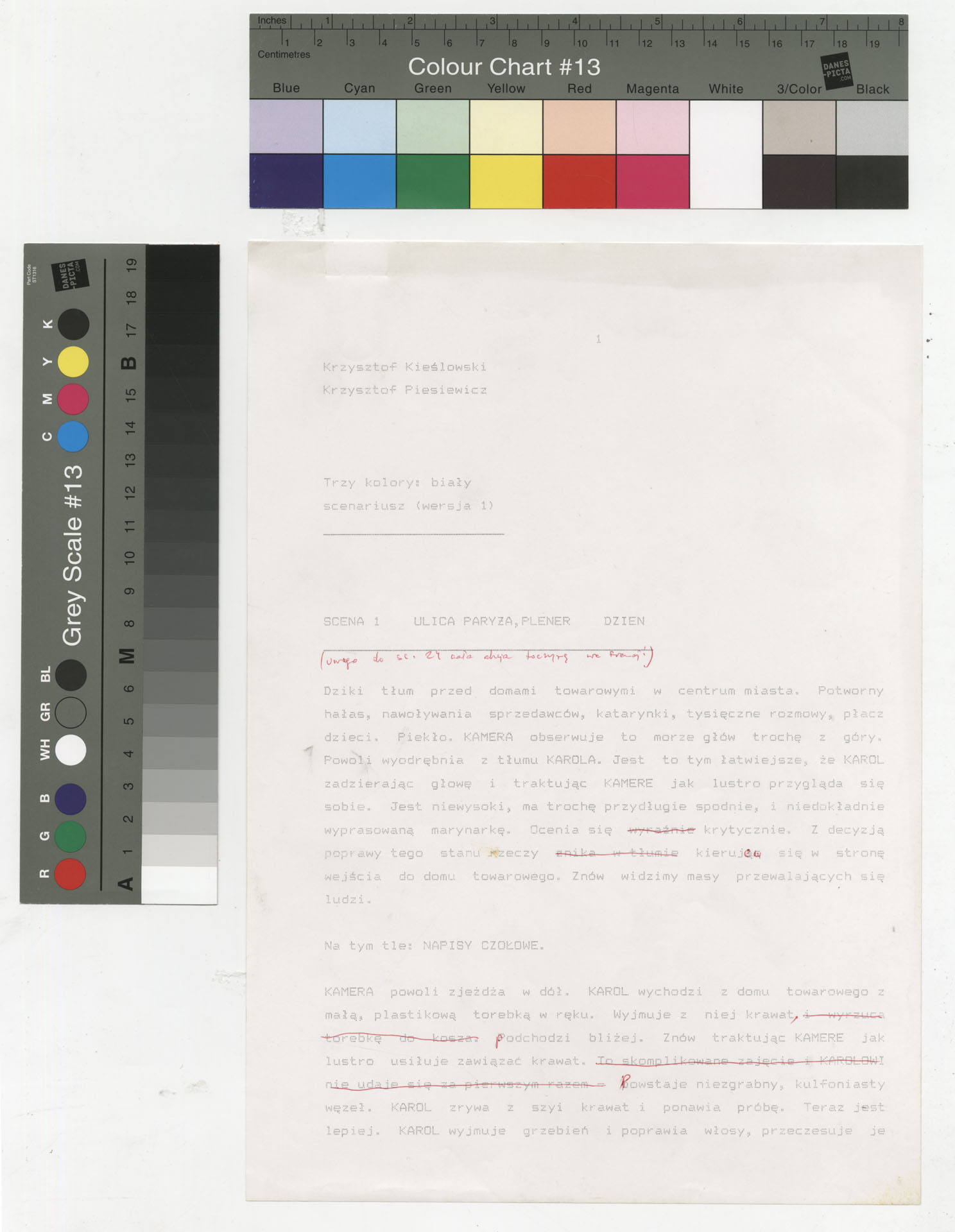 Wydruk komputerowy ze scenariuszem do filmu Krzysztofa Kieślowskiego “Trzy kolory. Biały” (1994) wyprodukowanego m.in. przez Studio Filmowe Tor i MK2 Productions. Zdjęcia do tego filmu zrealizował Edward Kłosiński. Film powstał według scenariusza napisanego wspólnie przez Krzysztofa Kieślowskiego i Krzysztofa Piesiewicza w ramach trylogii “Trzy kolory”. Dokument stanowi pełny scenariusz z podziałem na numerowane sceny, z nagłówkami określającymi miejsce i czas akcji oraz opisami bohaterów i sytuacji. Zawiera komplet dialogów głównego bohatera, Karola, i innych postaci, prowadzących akcję od paryskiego tłumu, przez powrót bohatera do Polski, aż po finał związany z Dominique.