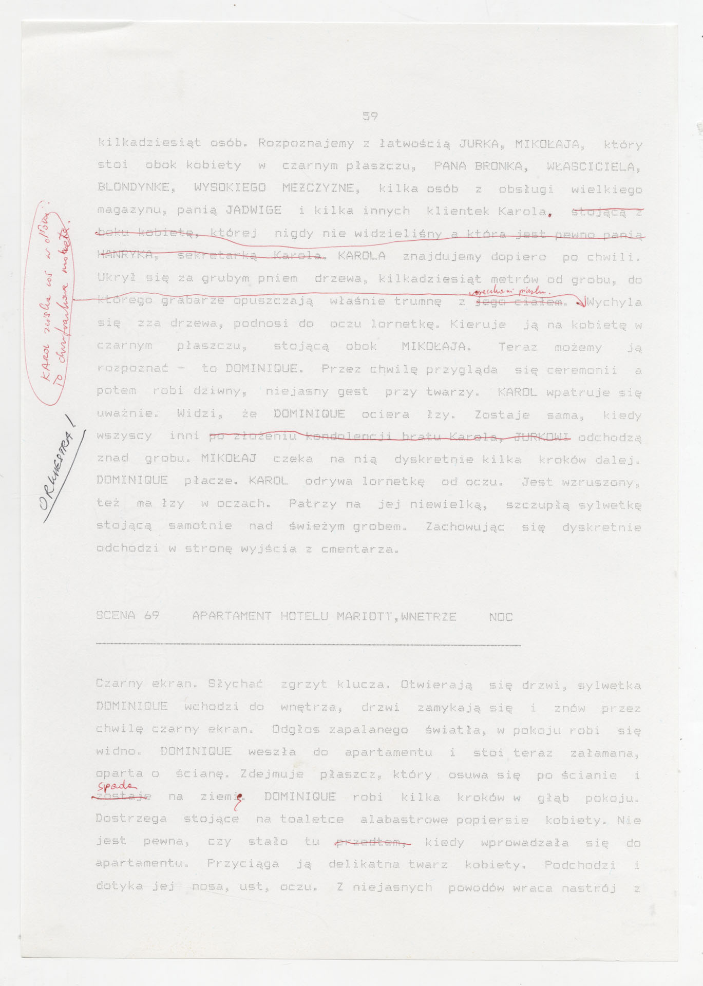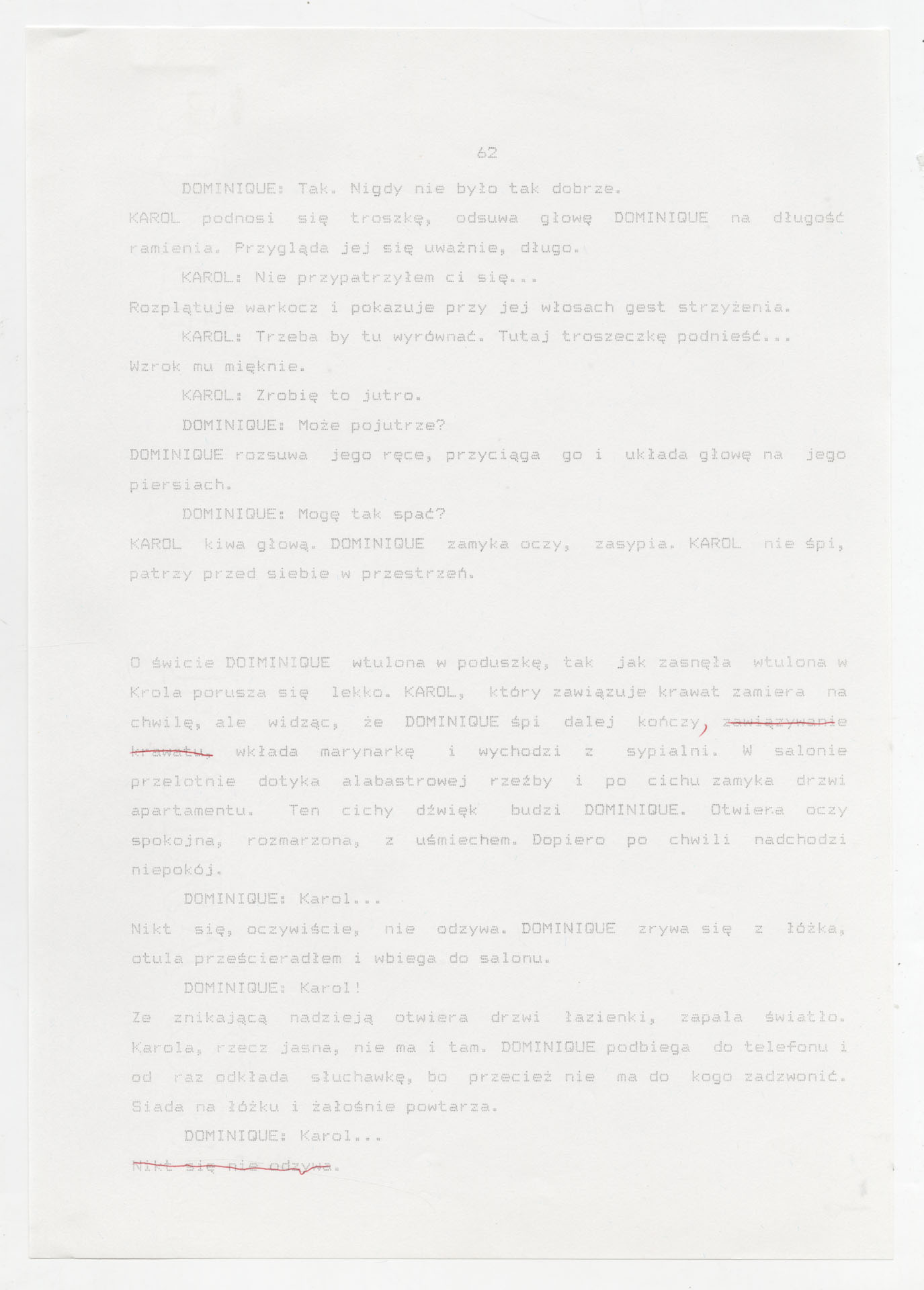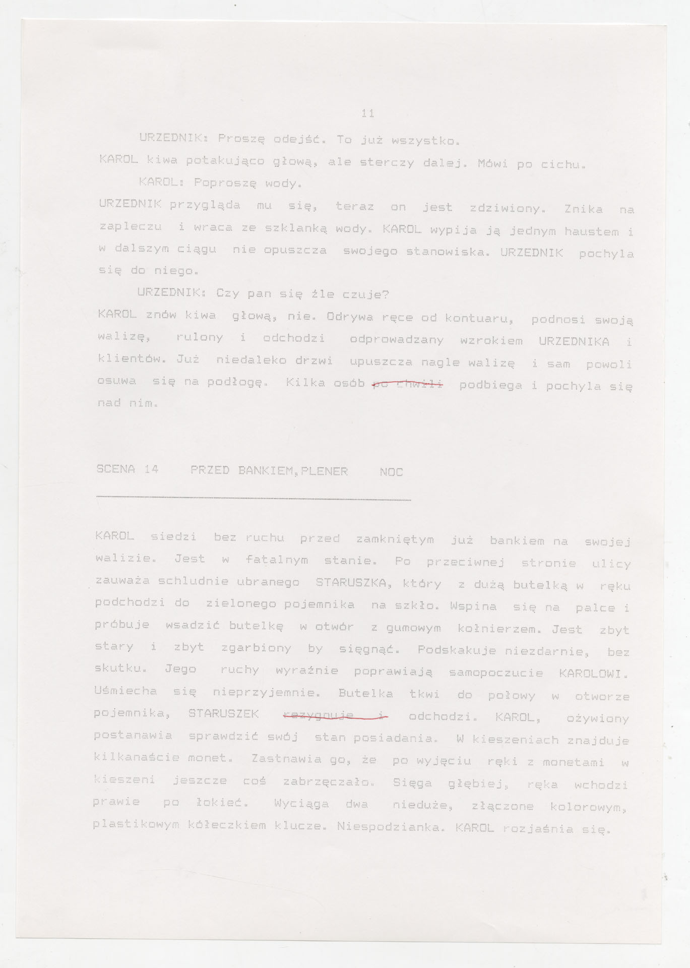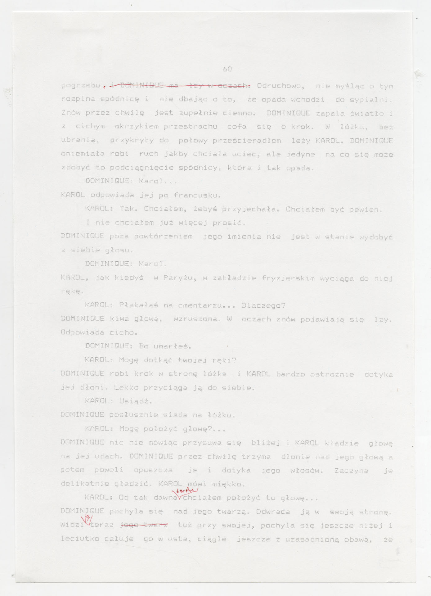 Wydruk komputerowy ze scenariuszem do filmu Krzysztofa Kieślowskiego “Trzy kolory. Biały” (1994) wyprodukowanego m.in. przez Studio Filmowe Tor i MK2 Productions. Zdjęcia do tego filmu zrealizował Edward Kłosiński. Film powstał według scenariusza napisanego wspólnie przez Krzysztofa Kieślowskiego i Krzysztofa Piesiewicza w ramach trylogii “Trzy kolory”. Dokument stanowi pełny scenariusz z podziałem na numerowane sceny, z nagłówkami określającymi miejsce i czas akcji oraz opisami bohaterów i sytuacji. Zawiera komplet dialogów głównego bohatera, Karola, i innych postaci, prowadzących akcję od paryskiego tłumu, przez powrót bohatera do Polski, aż po finał związany z Dominique.