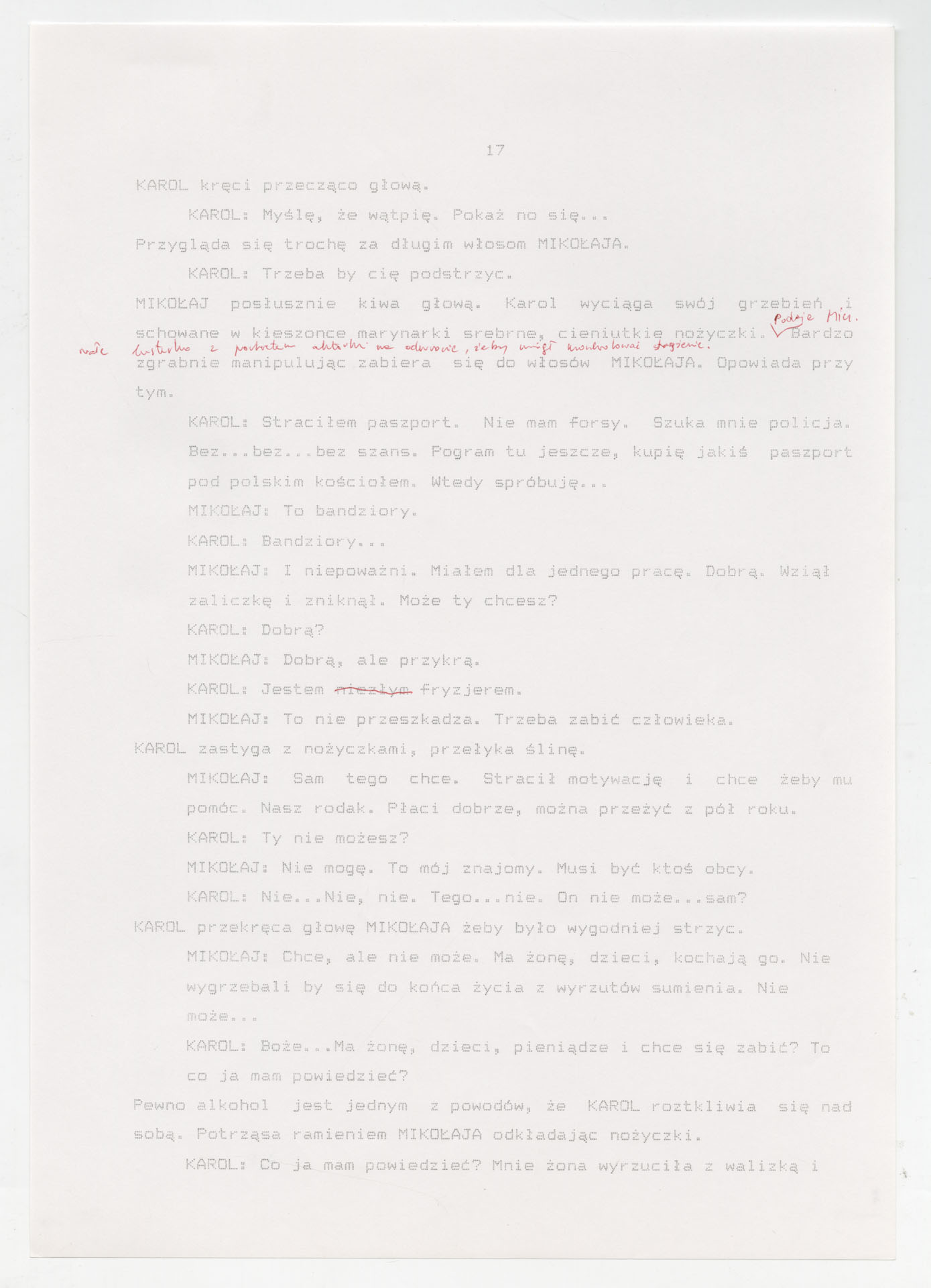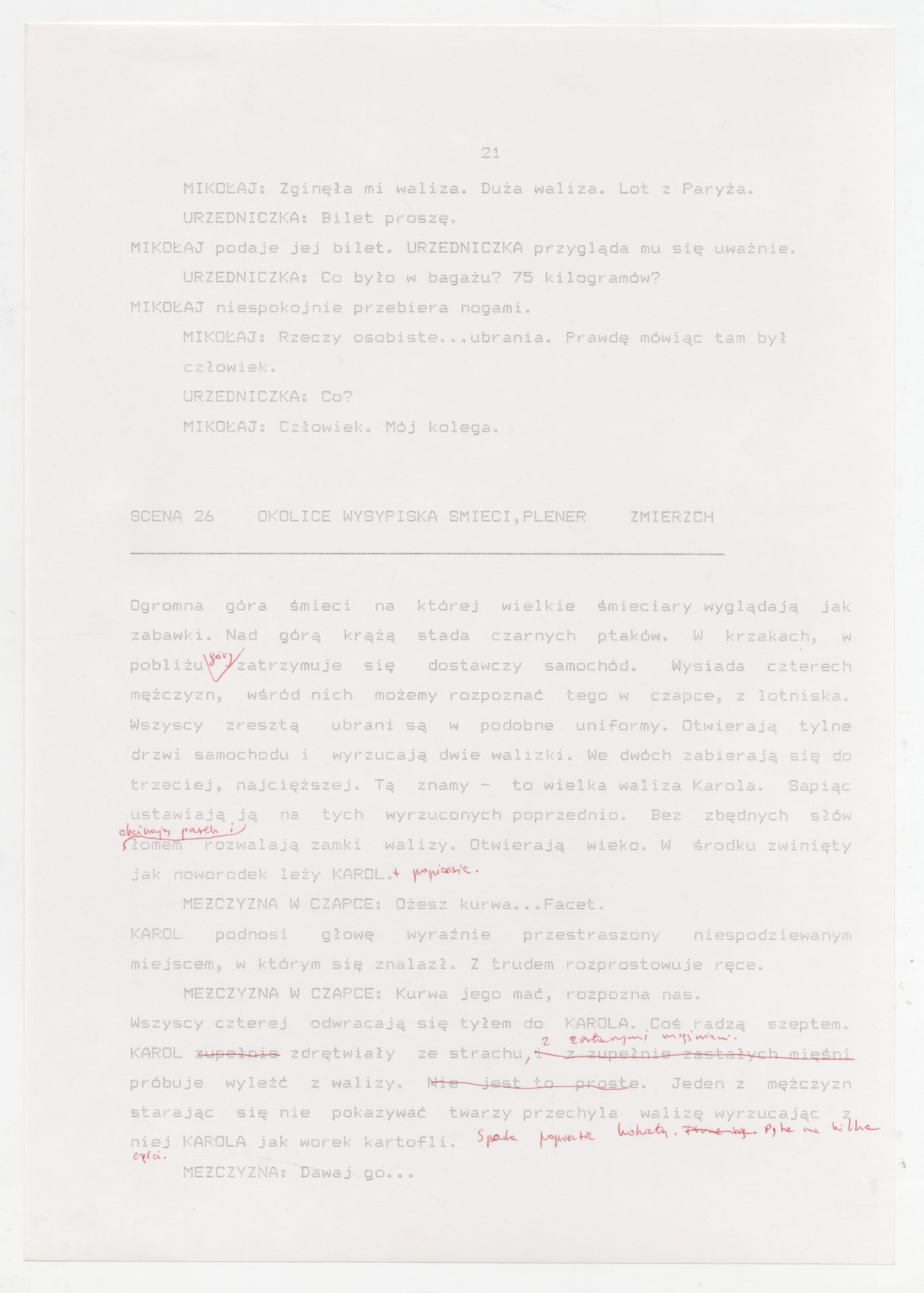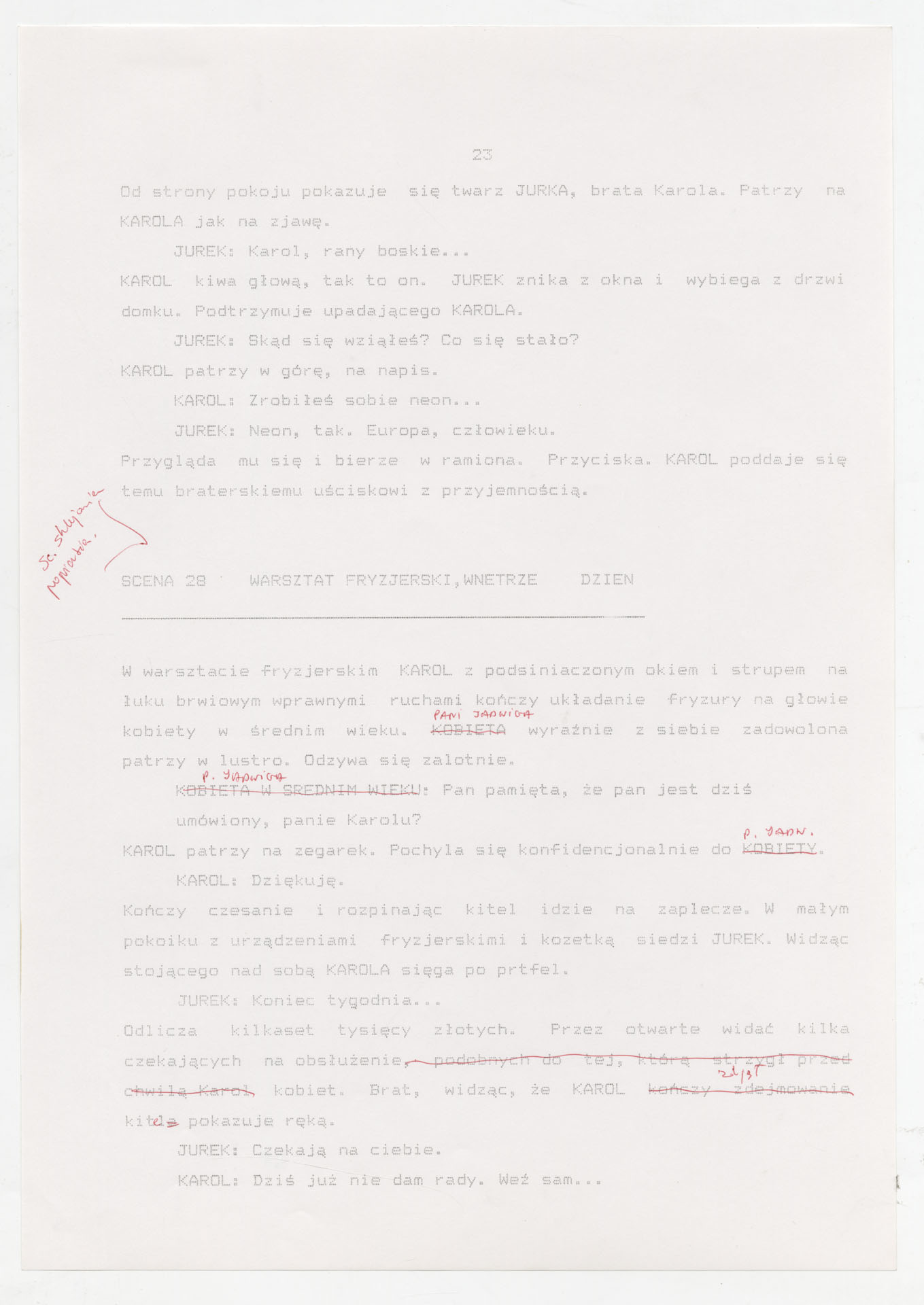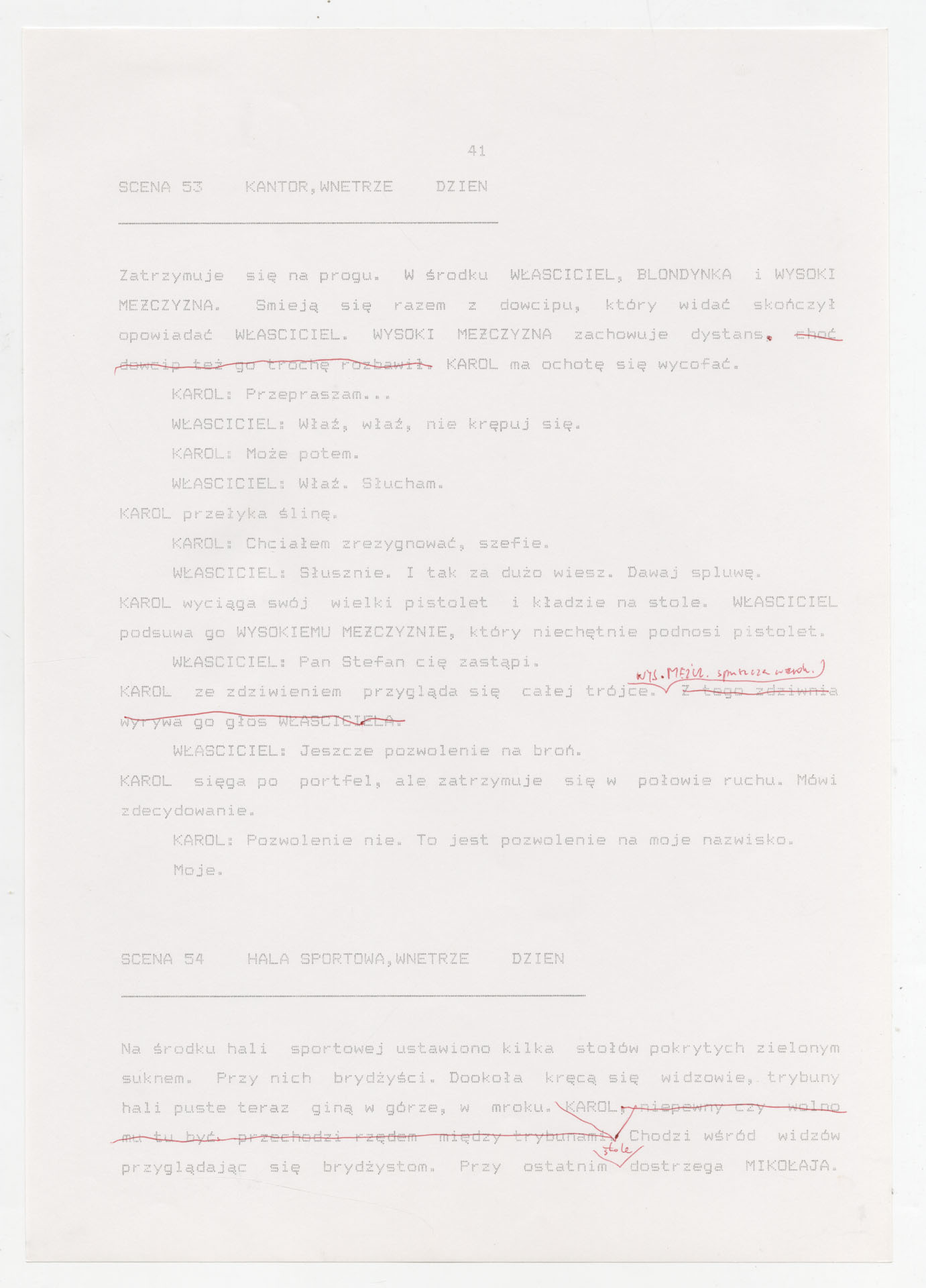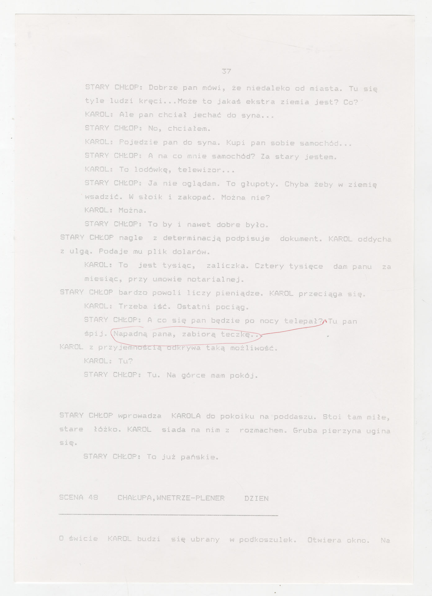 Wydruk komputerowy ze scenariuszem do filmu Krzysztofa Kieślowskiego “Trzy kolory. Biały” (1994) wyprodukowanego m.in. przez Studio Filmowe Tor i MK2 Productions. Zdjęcia do tego filmu zrealizował Edward Kłosiński. Film powstał według scenariusza napisanego wspólnie przez Krzysztofa Kieślowskiego i Krzysztofa Piesiewicza w ramach trylogii “Trzy kolory”. Dokument stanowi pełny scenariusz z podziałem na numerowane sceny, z nagłówkami określającymi miejsce i czas akcji oraz opisami bohaterów i sytuacji. Zawiera komplet dialogów głównego bohatera, Karola, i innych postaci, prowadzących akcję od paryskiego tłumu, przez powrót bohatera do Polski, aż po finał związany z Dominique.