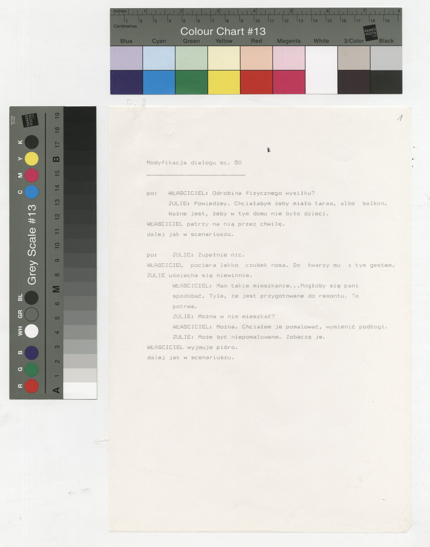 Wydruk komputerowy z listą dialogową do filmu Krzysztofa Kieślowskiego “Trzy kolory. Biały” (1994) wyprodukowanego m.in. przez Studio Filmowe Tor i MK2 Productions. Zdjęcia do tego filmu zrealizował Edward Kłosiński. Film powstał według scenariusza napisanego wspólnie przez Krzysztofa Kieślowskiego i Krzysztofa Piesiewicza w ramach trylogii “Trzy kolory”. Dokument zawiera polskojęzyczne poprawki do scenariusza. Maszynopis ma charakter suplementu do głównej wersji scenariusza.