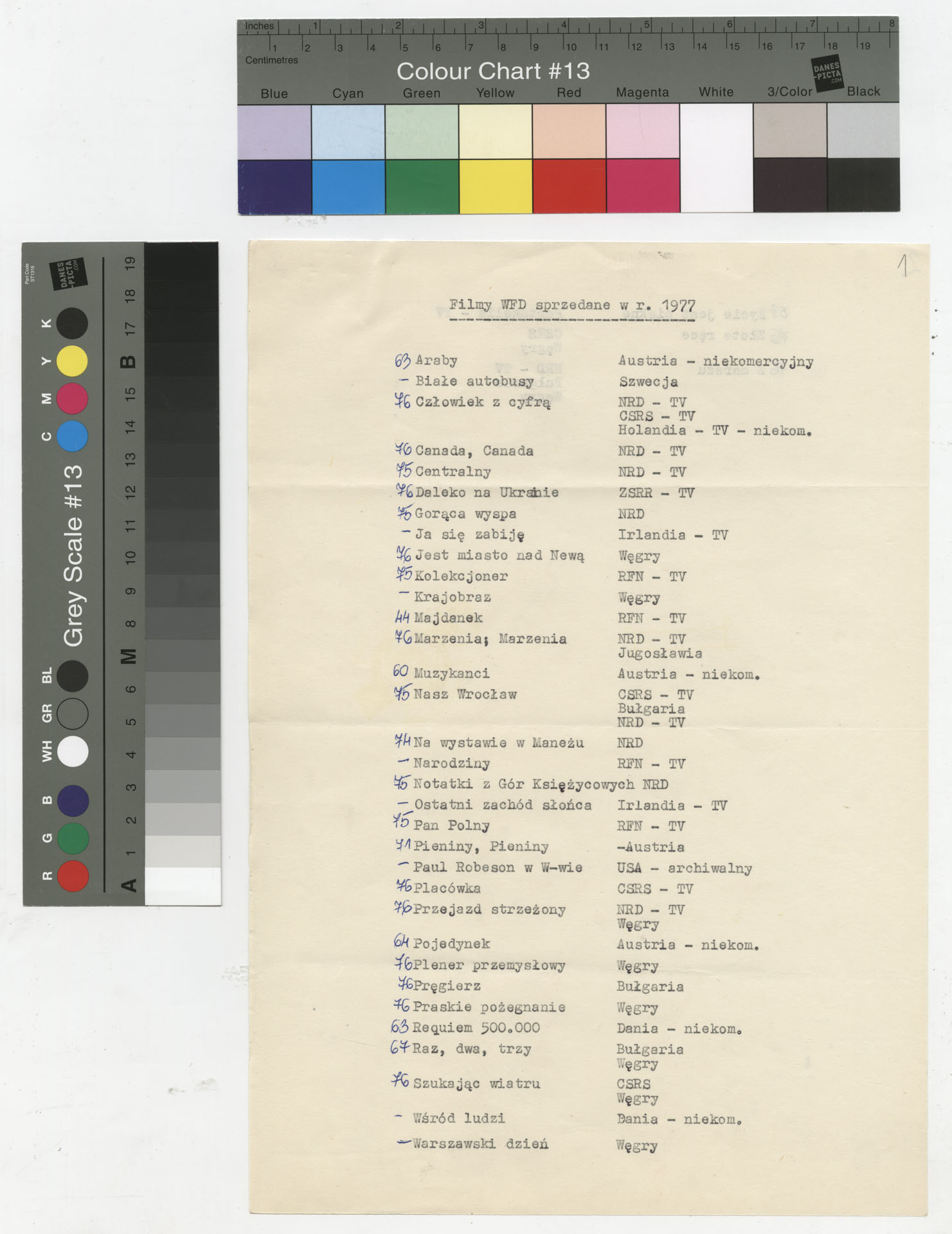 Maszynopis z wykazem “Filmy WFD sprzedane w r. 1977”. Dokument powstał w Wytwórni Filmów Dokumentalnych i zawiera listę tytułów sprzedanych za granicę, wraz z krajem nabywcy oraz oznaczeniem, czy film kupiła telewizja czy inna instytucja. Zestawienie ma formę jednego arkusza z kolumnami: tytuł, kraj (w postaci skrótów) i typ odbiorcy, z drobnymi znakami graficznymi przy części pozycji. Maszynopis pełni funkcję roboczego dokumentu ewidencyjno-eksportowego, bez wyraźnych odręcznych dopisków.