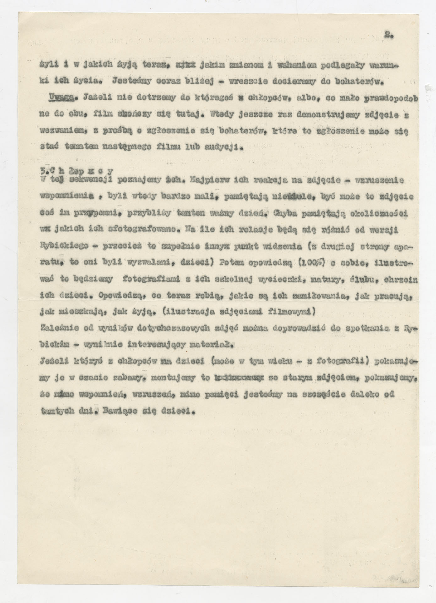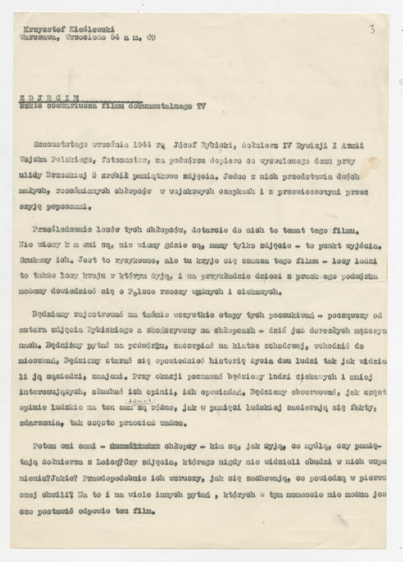 Maszynopis ze scenariuszem filmu Krzysztofa Kieślowskiego “Zdjęcie” (1968) zrealizowanego dla Telewizji Polskiej wyprodukowanego przez Zakład Produkcji Filmów Telewizyjnych. Dokument opisuje kolejne etapy filmu: opowieść żołnierza Józefa Rybickiego o okolicznościach wykonania zdjęcia dwóch chłopców z pepeszami na podwórku przy ul. Brzeskiej w 1944 roku, następnie poszukiwanie bohaterów fotografii na praskim podwórku, klatkach schodowych i w mieszkaniach oraz, jeśli to się uda, spotkanie z nimi jako dorosłymi mężczyznami. Notatki przewidują rejestrację całej drogi poszukiwań, zestawienie relacji sąsiadów z własnymi wspomnieniami bohaterów oraz montaż starej fotografii z ich współczesnym życiem i dziećmi. Maszynopis ma charakter roboczy, z wariantami ujęć i fragmentów komentarza.