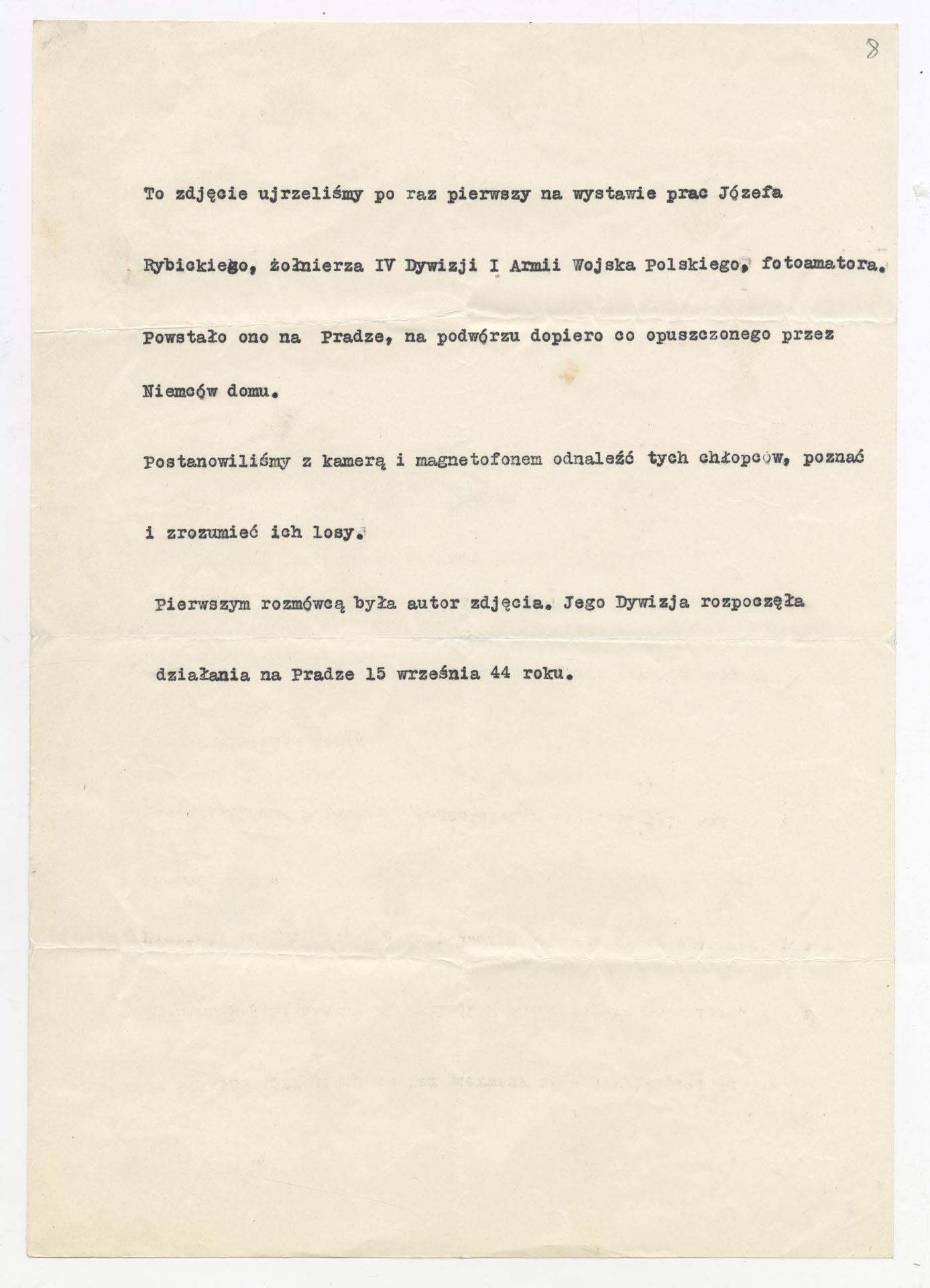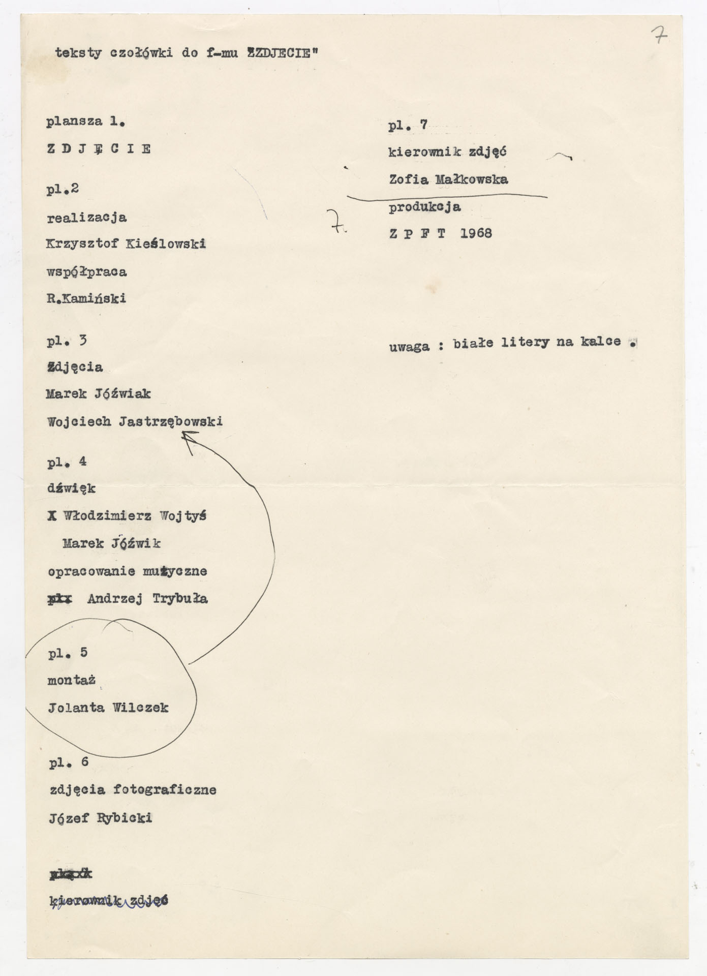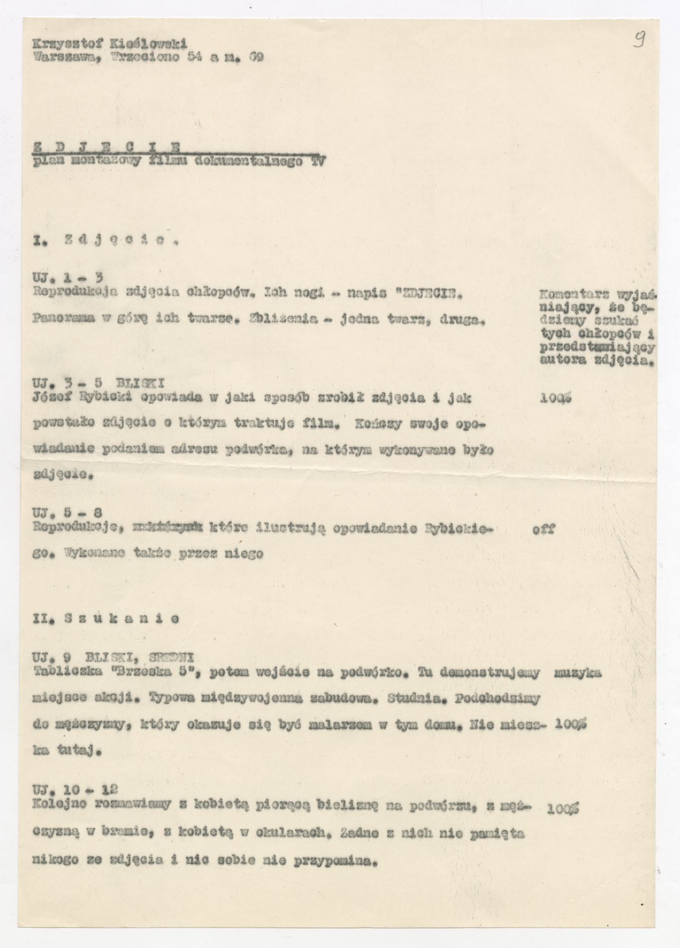 Maszynopis z planem montażowym do filmu Krzysztofa Kieślowskiego “Zdjęcie” (1968) zrealizowanego dla Telewizji Polskiej wyprodukowanego przez Zakład Produkcji Filmów Telewizyjnych. Dokument ma postać szczegółowego rozpisania kolejnych ujęć z podziałem na części. Opisuje przebieg filmu od reprodukcji fotografii dwóch chłopców i opowieści autora zdjęcia, Józefa Rybickiego, przez wędrówkę ekipy po podwórku przy ul. Brzeskiej 5, rozmowy z mieszkańcami, kwerendę w biurze meldunkowym, aż po odnalezienie braci Janczewskich i ich współczesne życie. Przy każdym ujęciu zaznaczono rodzaj planu, obecność komentarza lub dźwięku “100%”, muzykę oraz funkcję dramaturgiczną. W końcowej części zapisano również projekty plansz czołówkowych i napisów końcowych.
