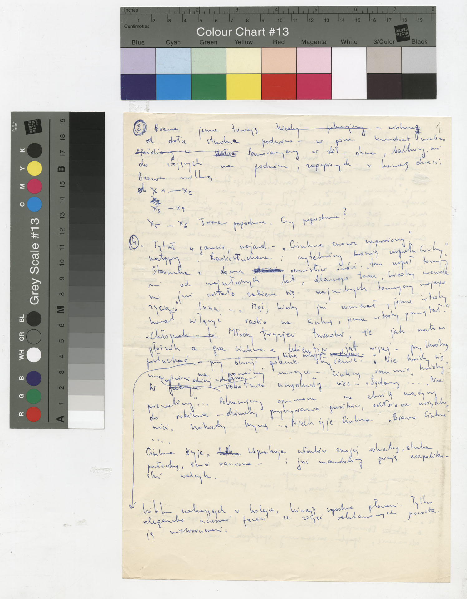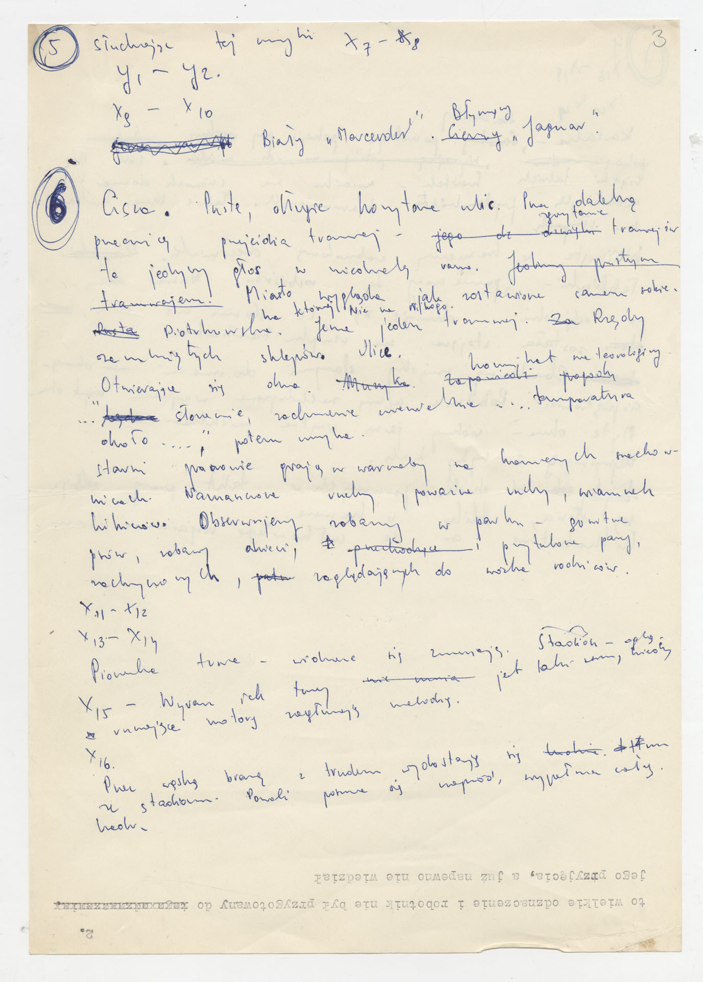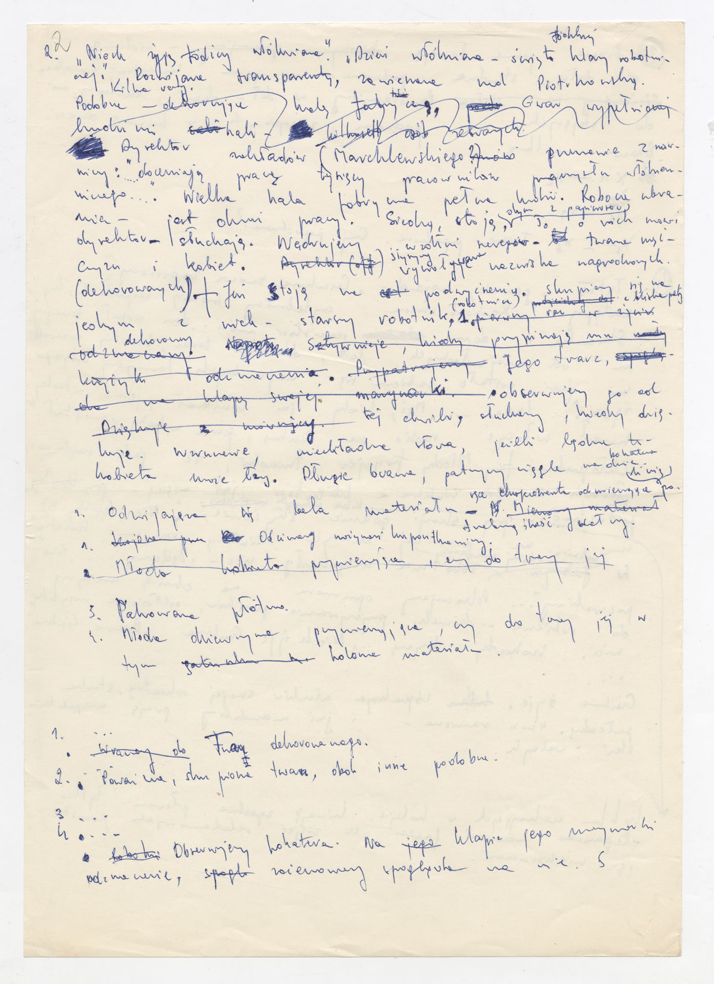 Rękopis z notatkami autora do filmu Krzysztofa Kieślowskiego “Z miasta Łodzi” (1969). Film przedstawia impresyjny obraz Łodzi – miasta przemysłu włókienniczego, kontrastów społecznych i architektonicznych – zrealizowany ze zdjęciami Janusza Kreczmańskiego, Piotra Kwiatkowskiego, Stanisława Niedbalskiego. Zanim film nosił ten tytuł, praca nad nim trwała pod roboczymi tytułami “Łodzianie” i “Miasto Łódź”. Dokument obejmuje cztery strony odręcznie zapisanych notatek roboczych, sporządzonych na własny użytek autora w toku pracy nad filmem. Karty mają charakter zapisków bez wyraźnie wyodrębnionych nagłówków czy numeracji scen. Rękopis stanowi materiał pomocniczy do porządkowania obserwacji i pomysłów związanych z tematyką filmu.