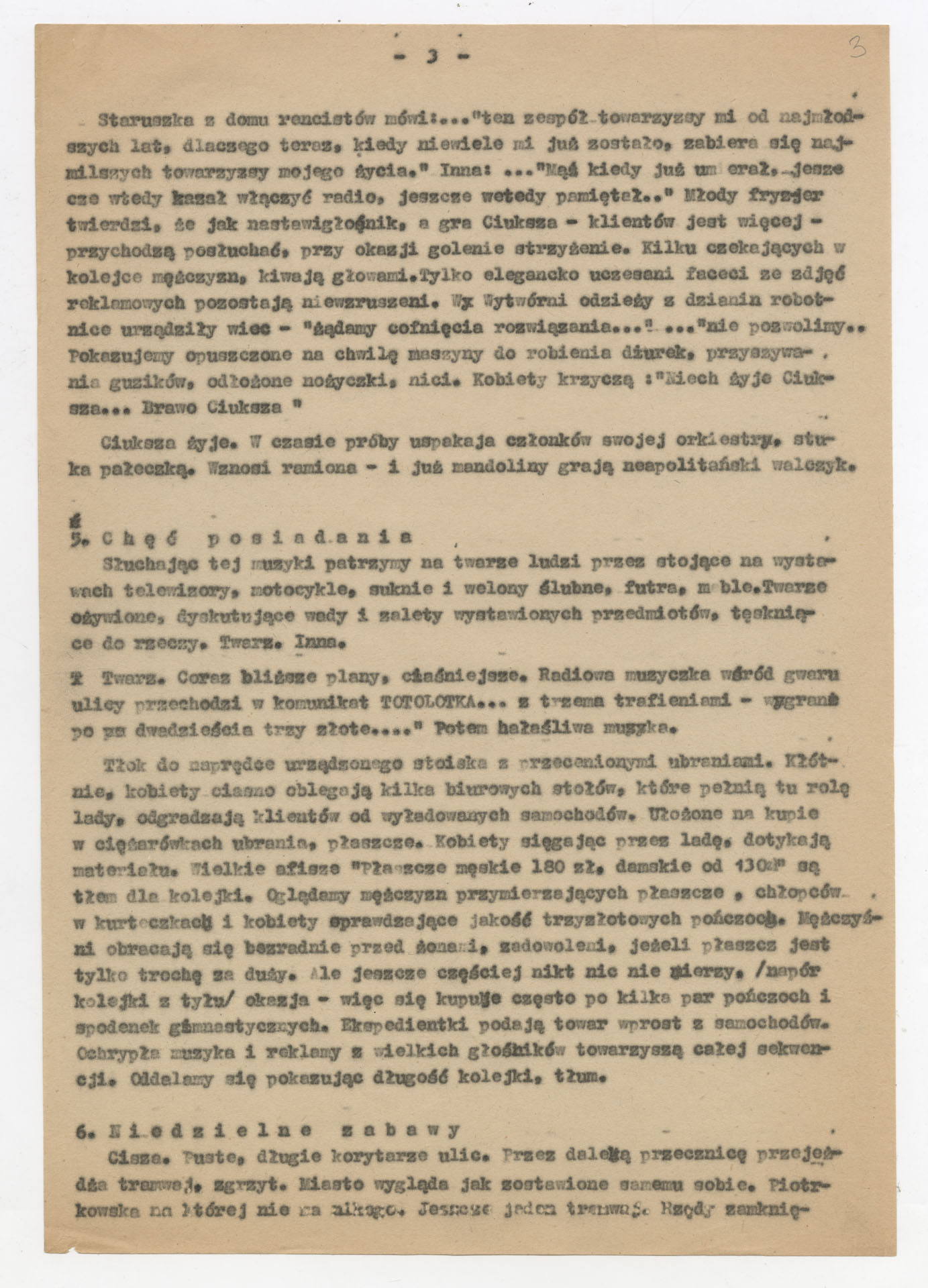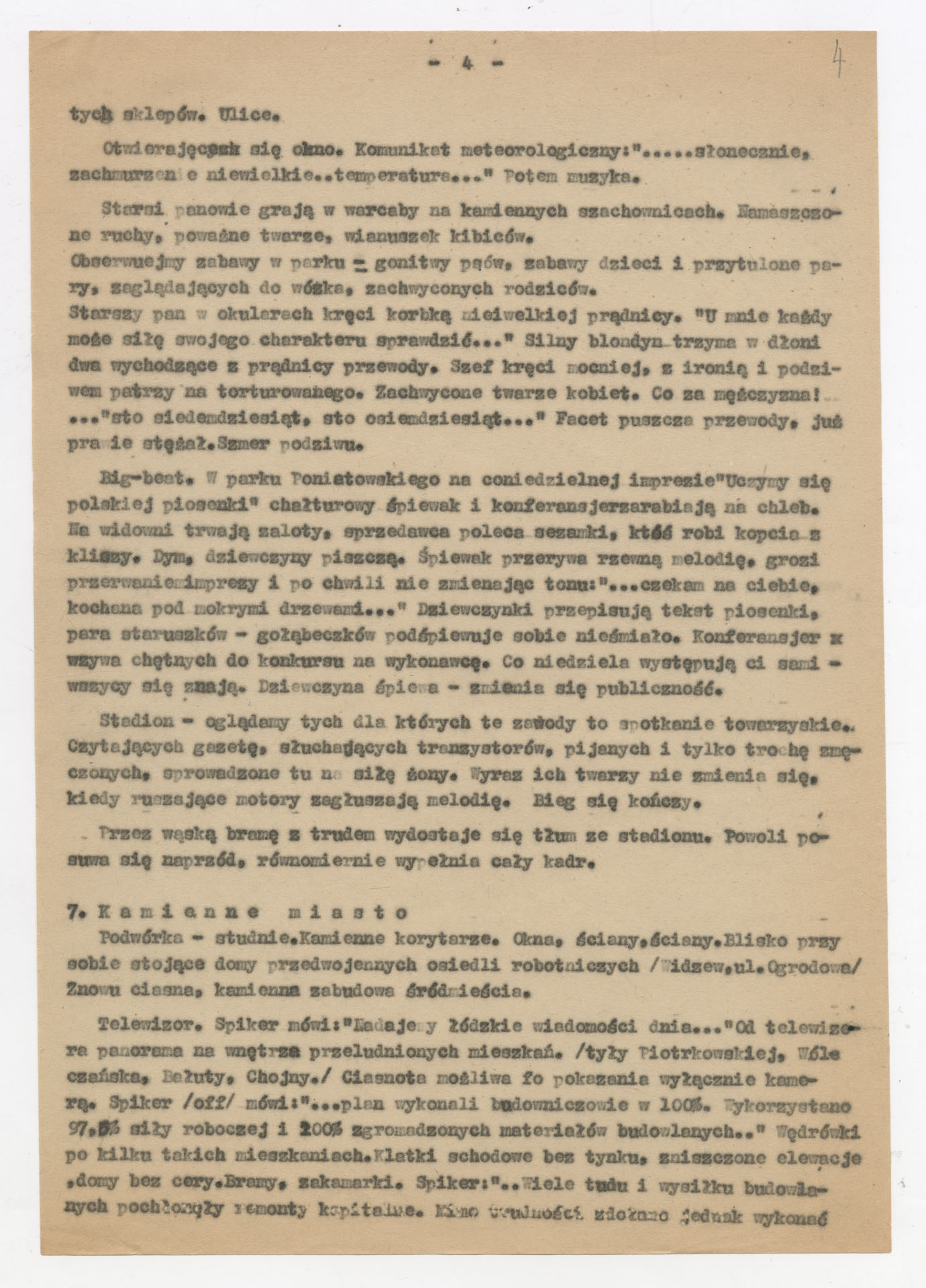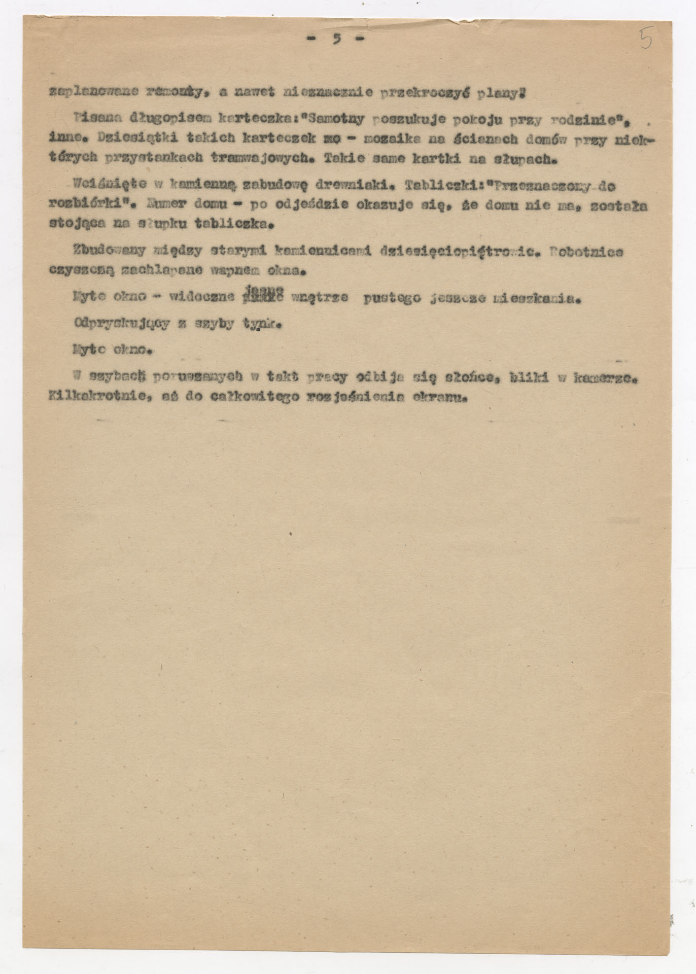Kopia maszynopisu ze scenariuszem do filmu Krzysztofa Kieślowskiego “Z miasta Łodzi” (1969). Film przedstawia impresyjny obraz Łodzi – miasta przemysłu włókienniczego, kontrastów społecznych i architektonicznych – zrealizowany ze zdjęciami Janusza Kreczmańskiego, Piotra Kwiatkowskiego, Stanisława Niedbalskiego. Zanim film nosił ten tytuł, praca nad nim trwała pod roboczymi tytułami “Łodzianie” i “Miasto Łódź”. Dokument jest podzielony na bloki tematyczne (m.in. “Praca”, “Obyczaje”, “Ciuksza”, “Wystawy”). Opisują one planowane sekwencje obserwacyjne: wnętrza fabryki, podwórka i bramy z dziećmi i młodzieżą, obchody Święta Włókniarza, obronę zespołu Ciuksza, wyprzedaże i kiermasze, niedzielną “spółdzielnię zabawy” w parku, stadion żużlowy oraz przeludnione mieszkania i stare osiedla robotnicze. Notatki mają charakter szkicu struktury filmu, zapisanego krótkimi opisami sytuacji bez dialogów. Inna wersja tego dokumentu ma sygnaturę ATKK-ZMŁ-I-047.