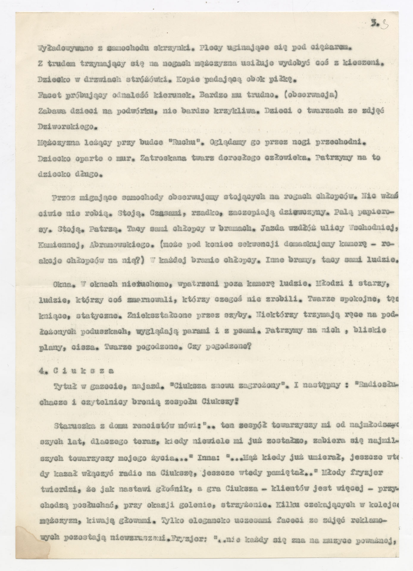 Kopia maszynopisu ze scenariuszem do filmu Krzysztofa Kieślowskiego “Z miasta Łodzi” (1969). Film przedstawia impresyjny obraz Łodzi – miasta przemysłu włókienniczego, kontrastów społecznych i architektonicznych – zrealizowany ze zdjęciami Janusza Kreczmańskiego, Piotra Kwiatkowskiego, Stanisława Niedbalskiego. Zanim film nosił ten tytuł, praca nad nim trwała pod roboczymi tytułami “Łodzianie” i “Miasto Łódź”. Dokument jest podzielony na ponumerowane bloki tematyczne – m.in. “Praca”, “Uroczystość”, “Obyczaje”, “Ciuksza”, “Chęć posiadania”, “Niedzielne zabawy”, “Kamienne miasto”. Opis dotyczy różnych scen z życia miasta przemysłowego: ciężkiej pracy w fabryce, święta włókniarzy, codziennych rozrywek i nałogów, zabaw dzieci, niedzielnych spacerów i miejskich imprez. Zestawia obrazy pracy, konsumpcji i rozrywki z problemami mieszkaniowymi oraz przeludnioną, starą zabudową, domkniętą symbolem nowego bloku. Inna wersja tego dokumentu ma sygnaturę ATKK-ZMŁ-I-037.