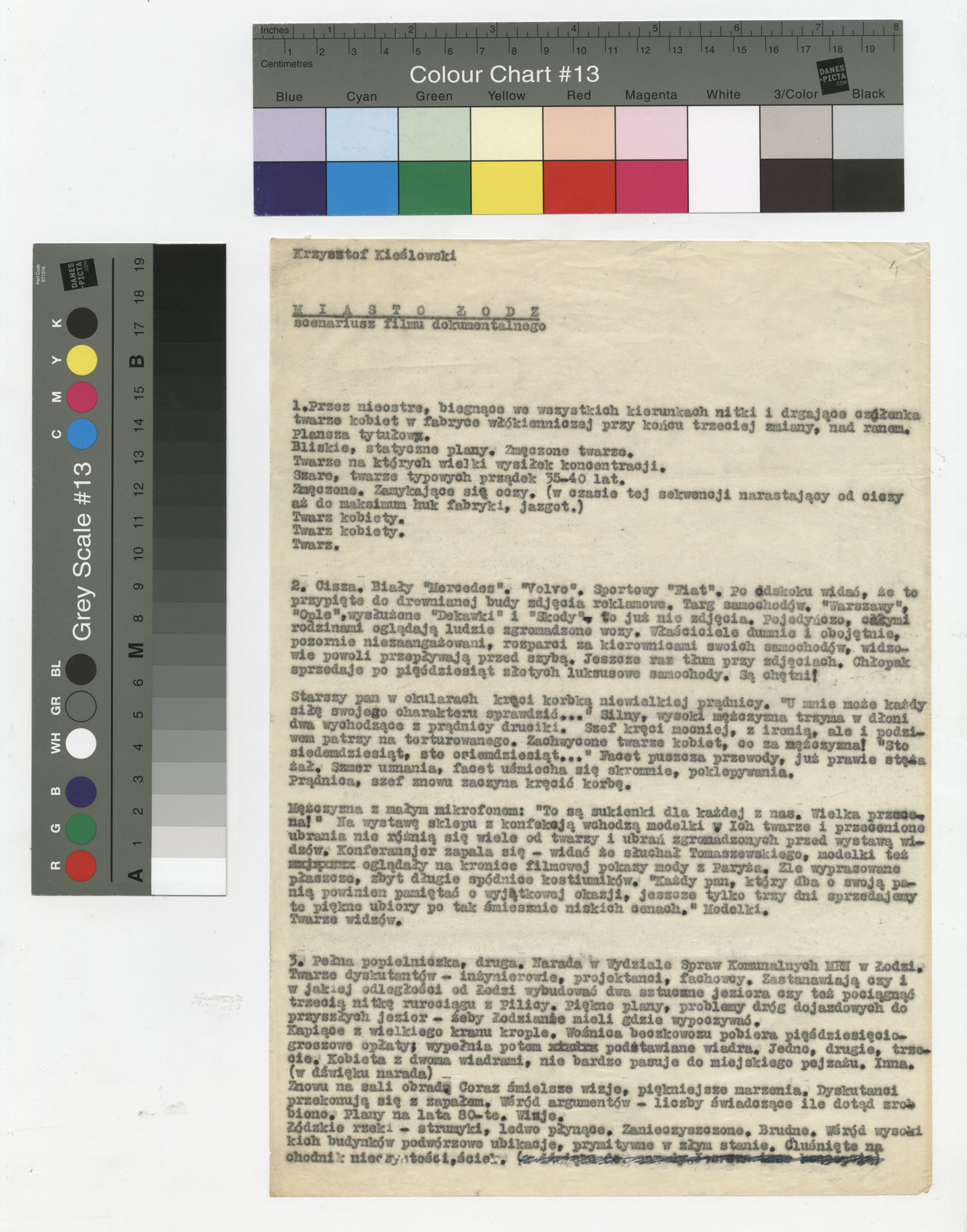 Kopia maszynopisu ze scenariuszem do filmu Krzysztofa Kieślowskiego “Z miasta Łodzi” (1969). Film przedstawia impresyjny obraz Łodzi – miasta przemysłu włókienniczego, kontrastów społecznych i architektonicznych – zrealizowany ze zdjęciami Janusza Kreczmańskiego, Piotra Kwiatkowskiego, Stanisława Niedbalskiego. Zanim film nosił ten tytuł, praca nad nim trwała pod roboczymi tytułami “Łodzianie” i “Miasto Łódź”. Dokument ma postać wielostronicowego maszynopisu z ciągłym, prozatorskim opisem planowanych sekwencji, bez wyraźnej numeracji scen. Opisuje m.in. twarze robotnic po nocnej zmianie w fabryce włókienniczej, targ samochodowy, pokaz “sprawdzania siły charakteru” na prądnicy, propagandowy pokaz mody z przecenioną konfekcją, naradę w Wydziale Spraw Komunalnych o wodociągach i sztucznych jeziorach, a także beczkowozy, studnie uliczne i zanieczyszczone rzeki. Ważnym motywem są kolejki na postoju taksówek, postać “babci z chorągiewką” kierującej tramwajami, przejazd karetki pogotowia przez zakorkowane ulice, punkt krwiodawstwa, marzenia o wysokiej wygranej w totalizatorze, sceny z tanim winem oraz dzieci bawiące się na podwórkach i stojące w oknach. Finałowe partie poświęcone są kolejce w ewidencji ludności, problemom meldunkowym i mieszkaniowym, obrazom przeludnionych i zniszczonych mieszkań, słupom oblepionym ogłoszeniami “szukam pokoju”, a także przygotowaniom do pierwszomajowego pochodu, skontrastowanym z majówką nad stawem w Arturówku przy radiowym sprawozdaniu z oficjalnych uroczystości.