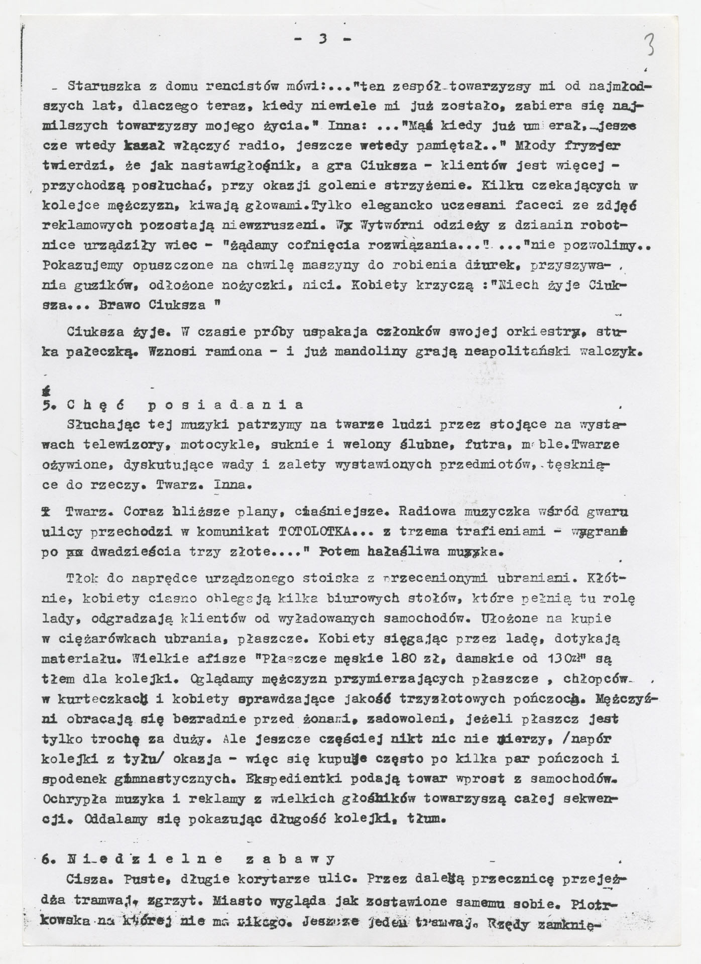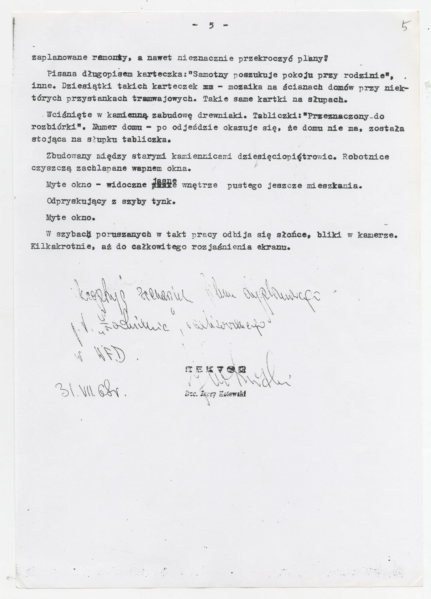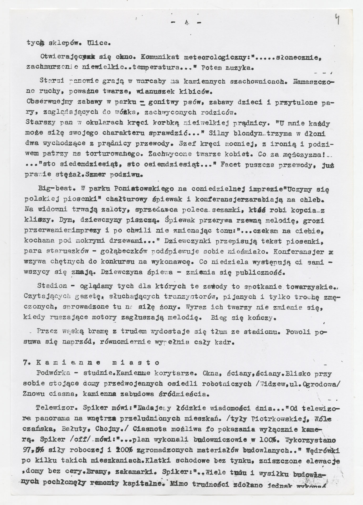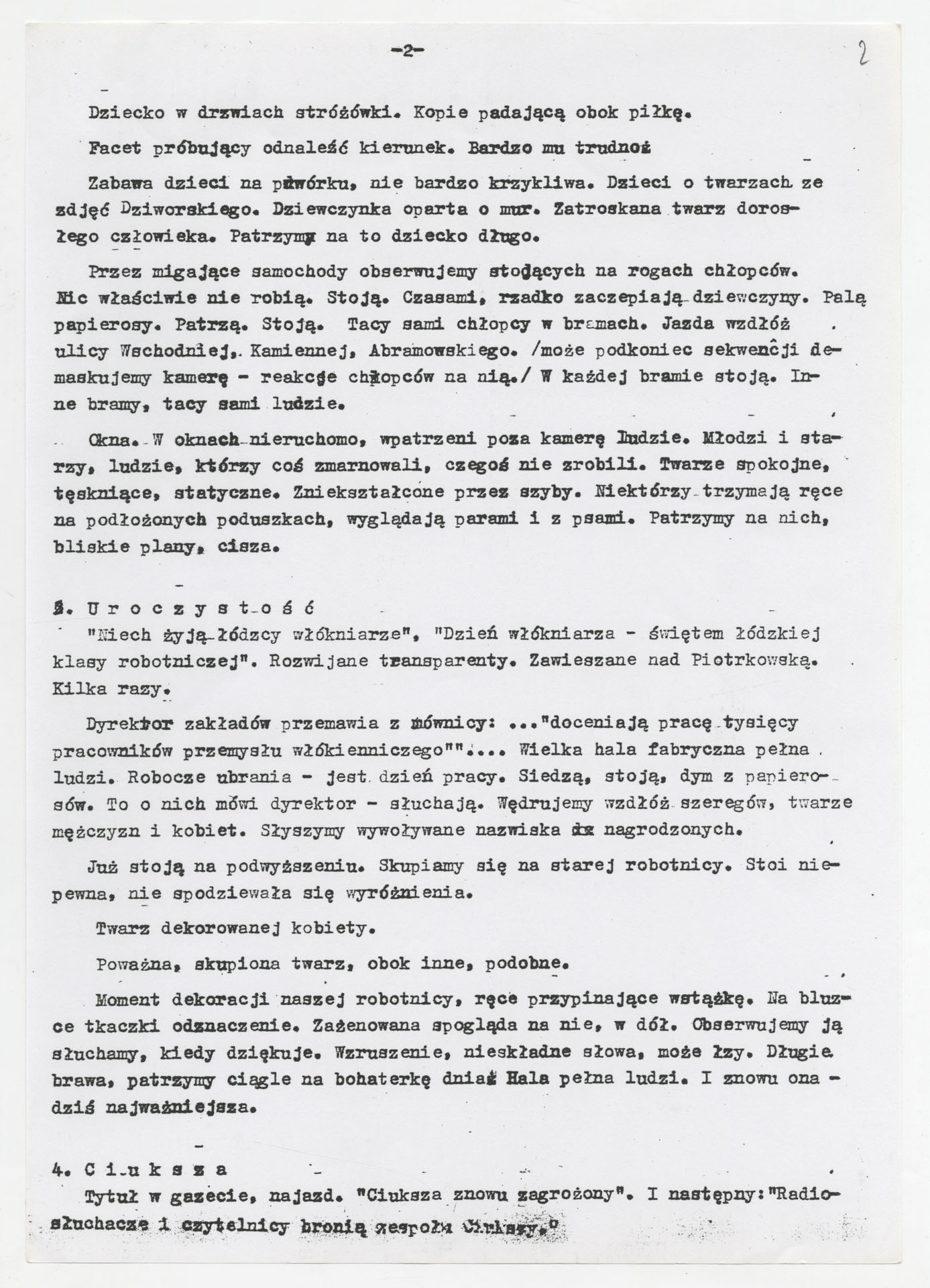 Kserokopia maszynopisu z suitą dokumentalną do filmu Krzysztofa Kieślowskiego “Z miasta Łodzi” (1969). Film przedstawia impresyjny obraz Łodzi – miasta przemysłu włókienniczego, kontrastów społecznych i architektonicznych – zrealizowany ze zdjęciami Janusza Kreczmańskiego, Piotra Kwiatkowskiego, Stanisława Niedbalskiego. Zanim film nosił ten tytuł, praca nad nim trwała pod roboczymi tytułami “Łodzianie” i “Miasto Łódź”. Dokument jest podzielony na bloki tematyczne (m.in. “Praca”, “Obyczaje”, “Ciuksza”, “Wystawy”). Opisują one planowane sekwencje obserwacyjne: wnętrza fabryki, podwórka i bramy z dziećmi i młodzieżą, obchody Święta Włókniarza, obronę zespołu Ciuksza, wyprzedaże i kiermasze, niedzielną “spółdzielnię zabawy” w parku, stadion żużlowy oraz przeludnione mieszkania i stare osiedla robotnicze. Notatki mają charakter szkicu struktury filmu, zapisanego krótkimi opisami sytuacji bez dialogów. Inna wersja tego dokumentu ma sygnaturę ATKK-ZMŁ-I-030.