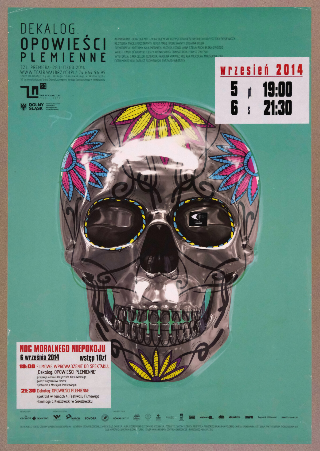 Plakat do spektaklu w Teatrze Dramatycznym im. Jerzego Szaniawskiego w Wałbrzychu o nazwie “Dekalog: Opowieści Plemienne” połączone z “Nocą Moralnego Niepokoju”, które odbyło się w wrzesniu 2014 roku. Przedstawienie powstało z inspiracji kultowym cyklem Krzysztofa Kieślowskiego i Krzysztofa Piesiewicza “Dekalog”.