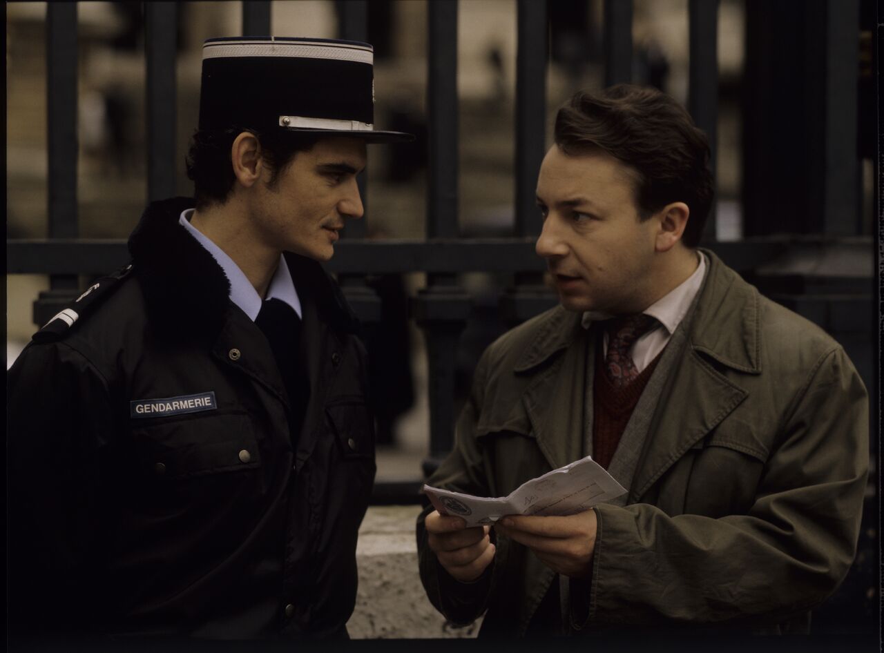 Karol (Zbigniew Zamachowski) pyta żandrama, dokąd ma się udać na rozprawe rozwodową.