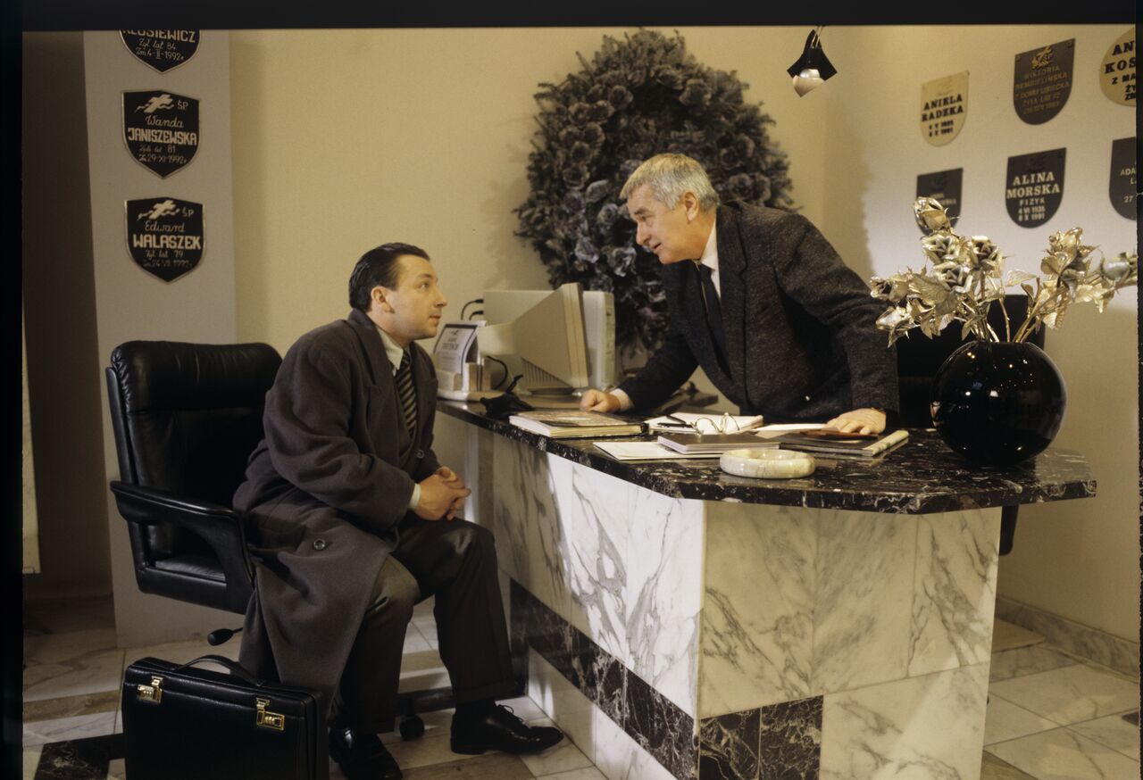 Karol (Zbigniew Zamachowski) w zakładzie pogrzebowym. Scena nie ukazała się w filmie.