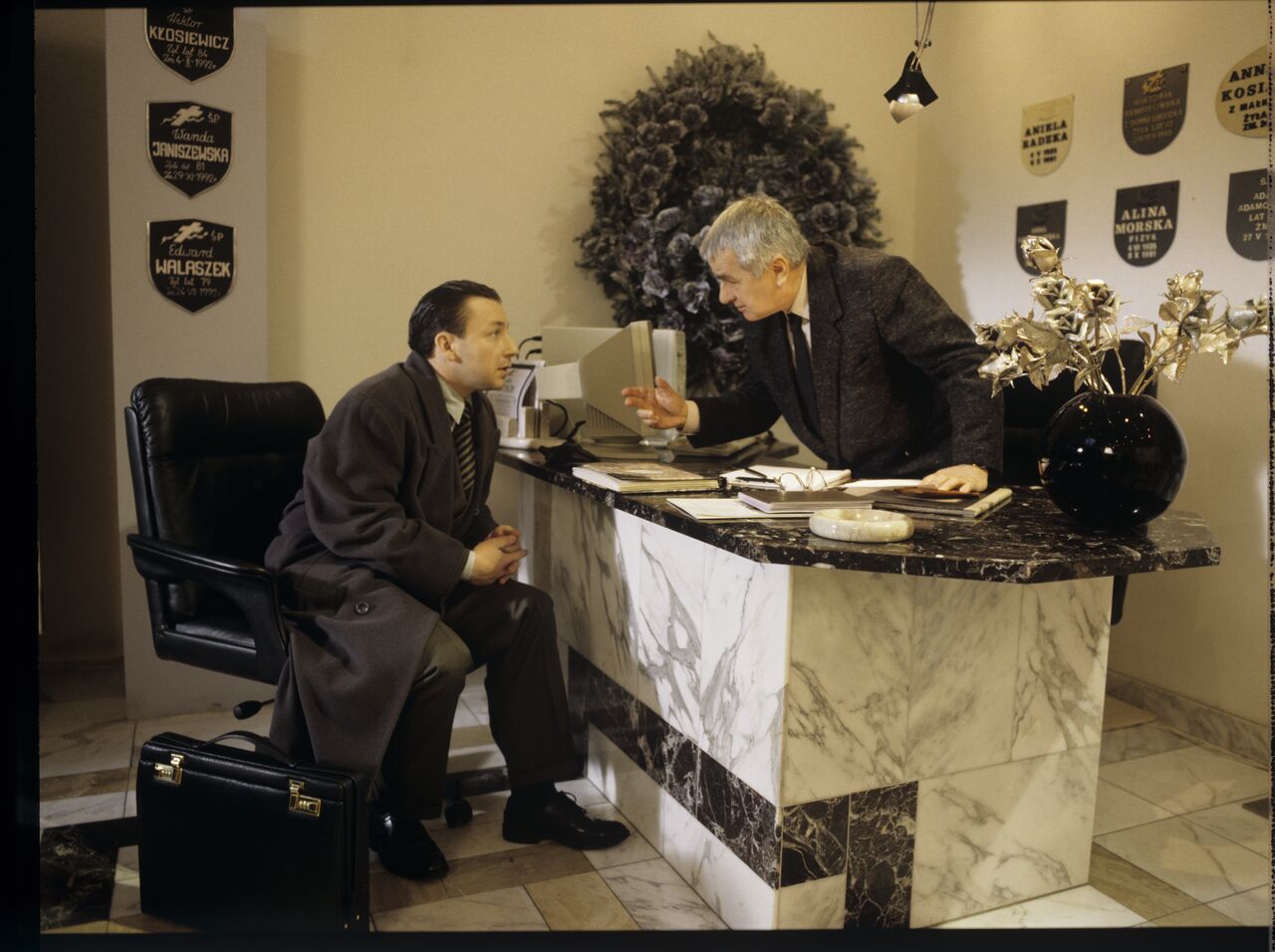 Karol (Zbigniew Zamachowski) w zakładzie pogrzebowym. Scena nie ukazała się w filmie.