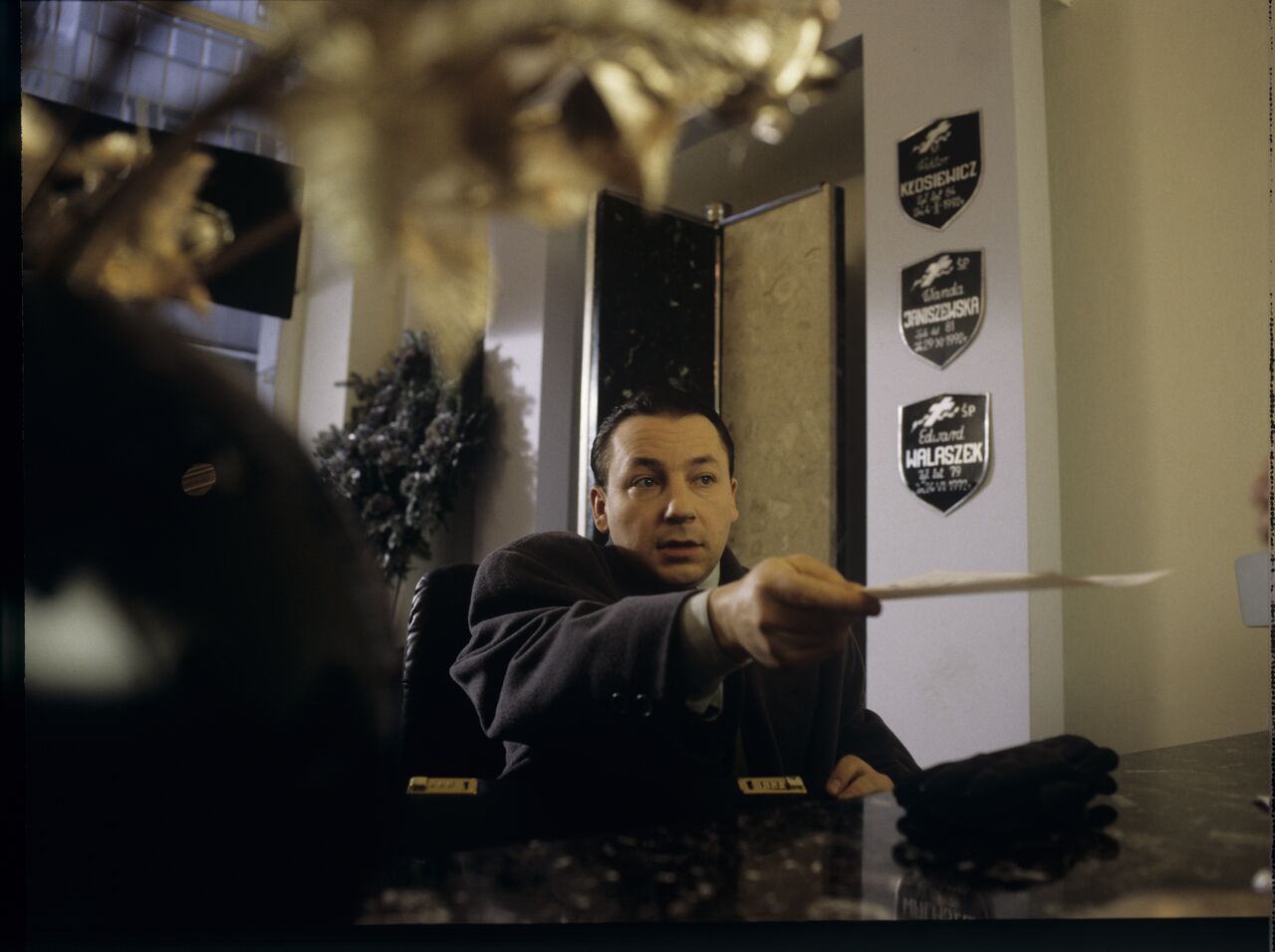 Karol (Zbigniew Zamachowski) w zakładzie pogrzebowym. Scena nie ukazała się w filmie.