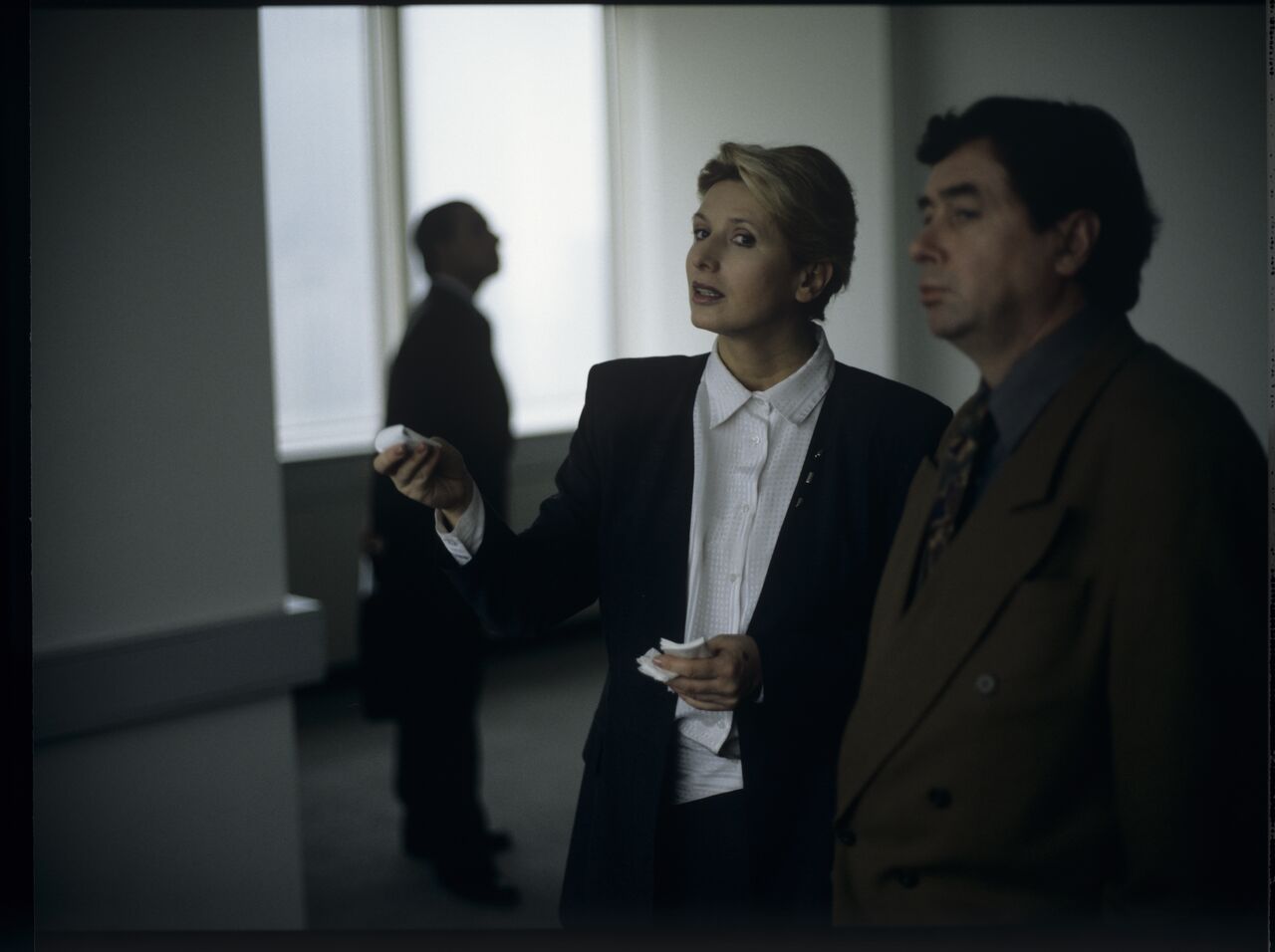 Pracownica hotelu “Mariott” (Marzena Trybała) rozmawia z Mikołajem (Janusz Gajos) w nowym biurze Karola w hotelu Mariott.