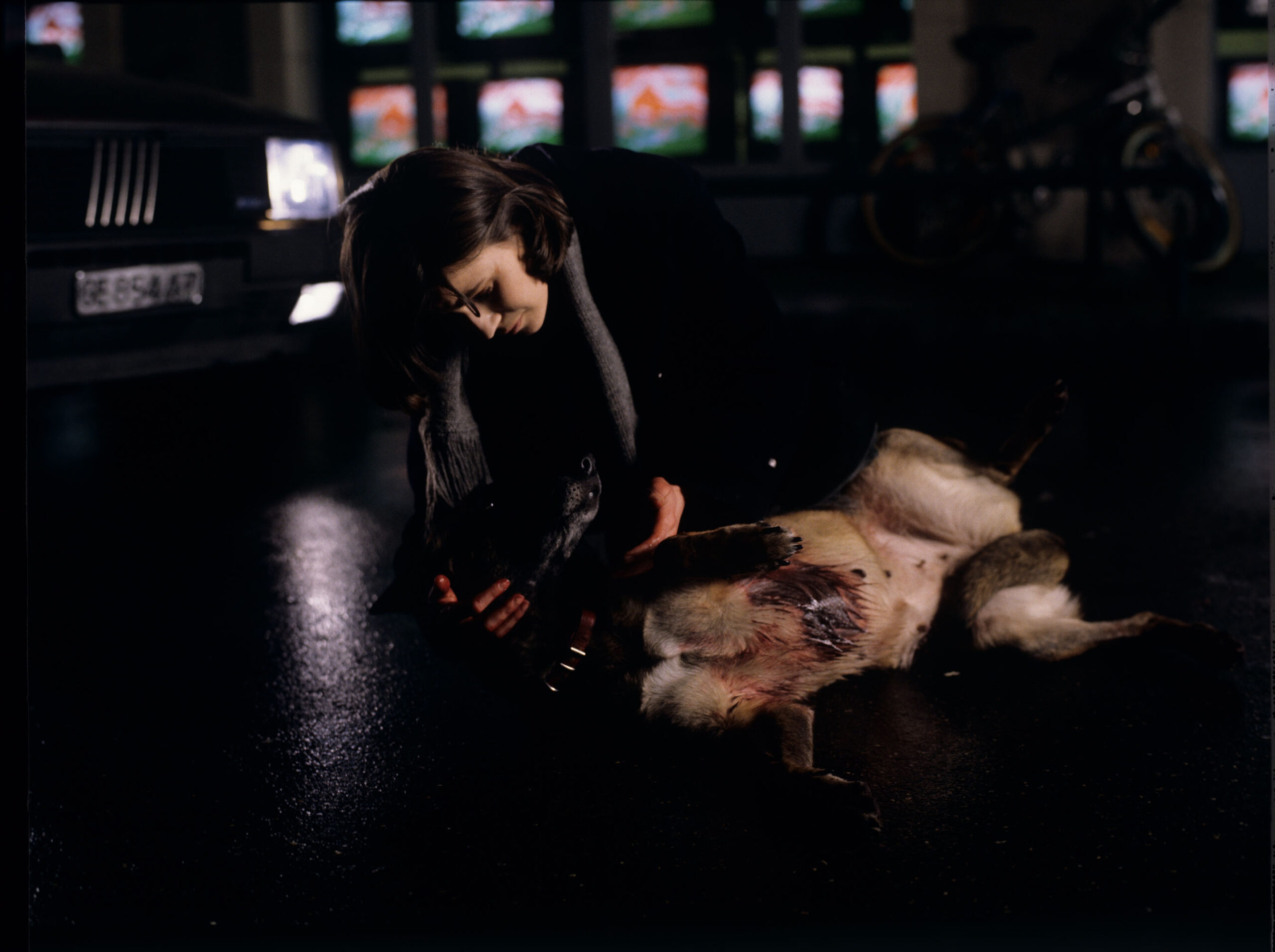 Valentine (Irene Jacob) pochyla się nad psem, którego przed chwilą potrąciła samochodem