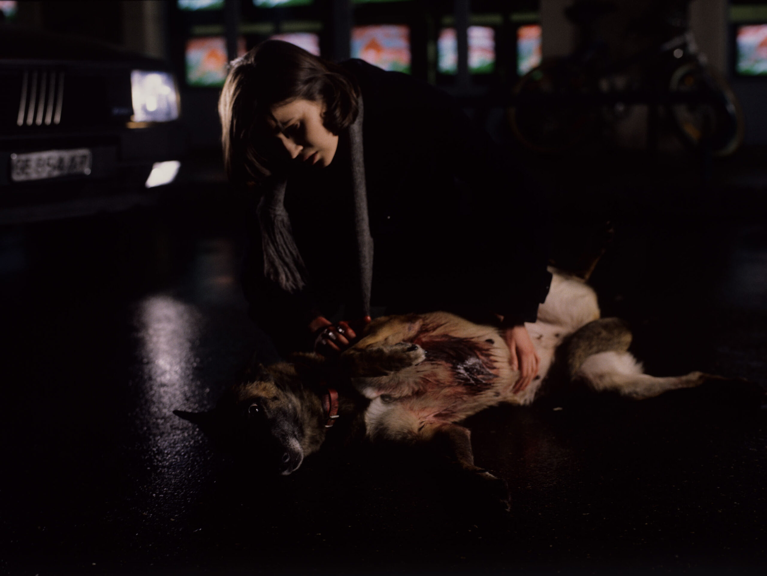 Valentine (Irene Jacob) pochyla się nad psem, którego przed chwilą potrąciła samochodem