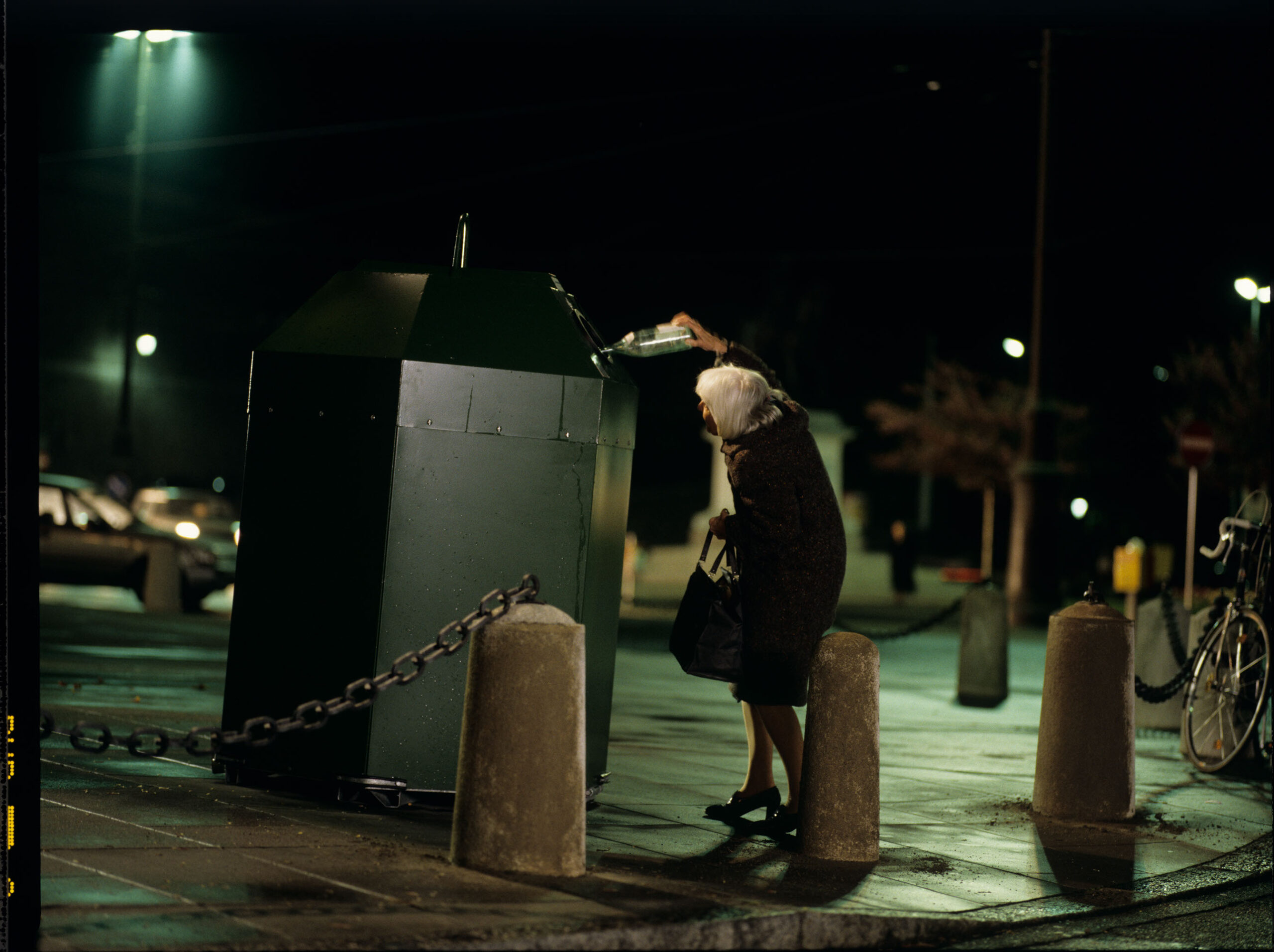 Staruszka z wielkim trudem usiłuje wrzucić do pojemnika na odpady szklaną butelkę. Jest to scena charakterystyczna dla każdej z części trylogii “Trzy kolory”