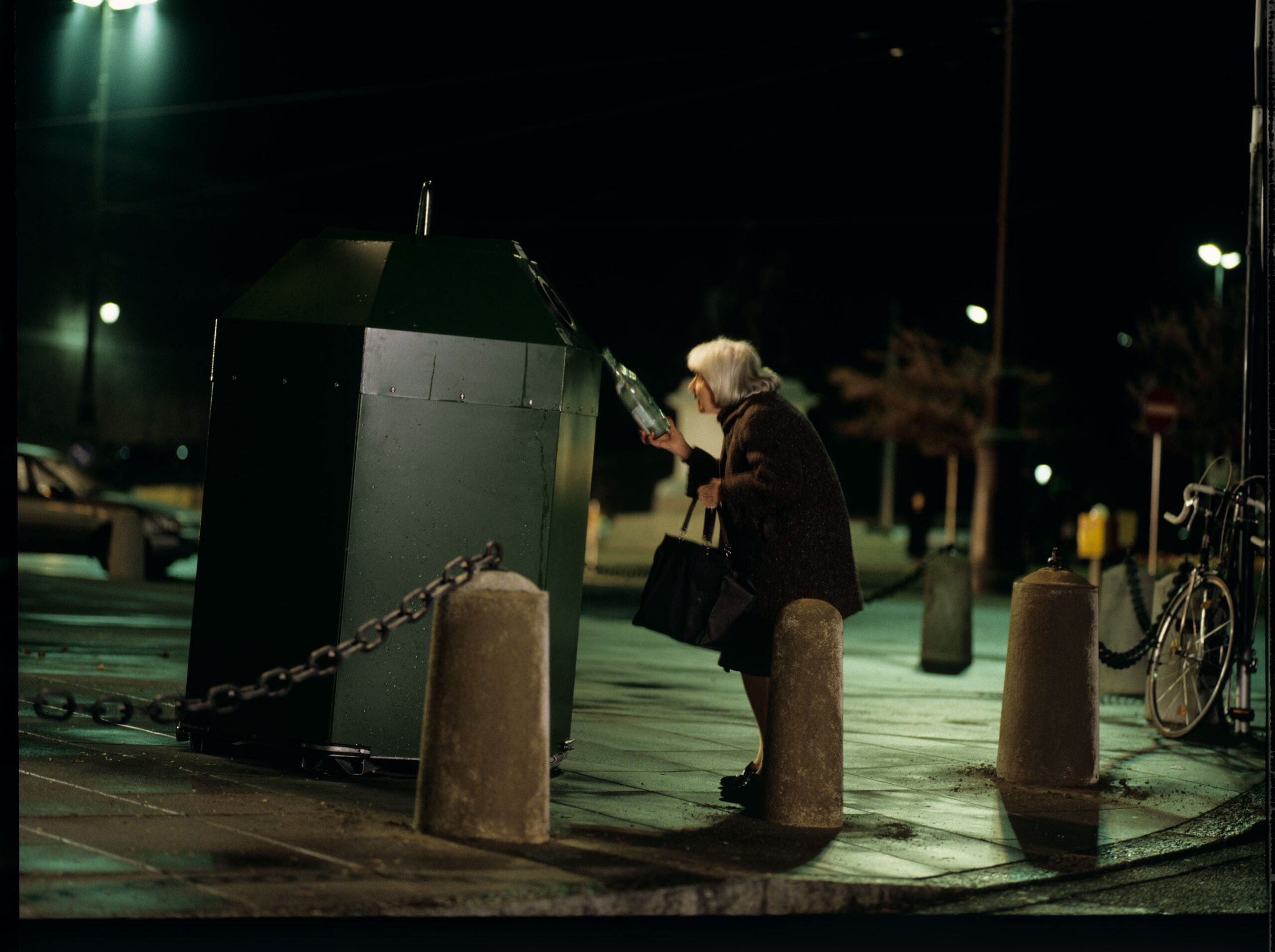 Staruszka z wielkim trudem usiłuje wrzucić do pojemnika na odpady szklaną butelkę. Jest to scena charakterystyczna dla każdej z części trylogii “Trzy kolory”