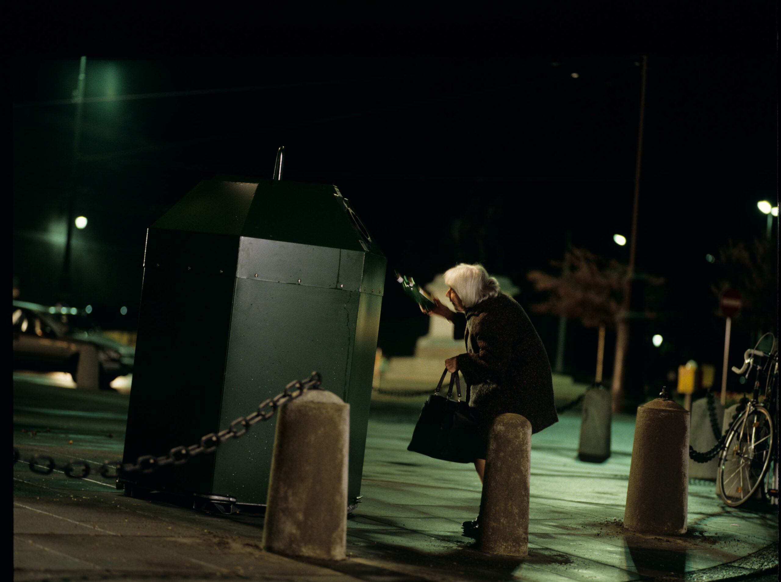 Staruszka z wielkim trudem usiłuje wrzucić do pojemnika na odpady szklaną butelkę. Jest to scena charakterystyczna dla każdej z części trylogii “Trzy kolory”