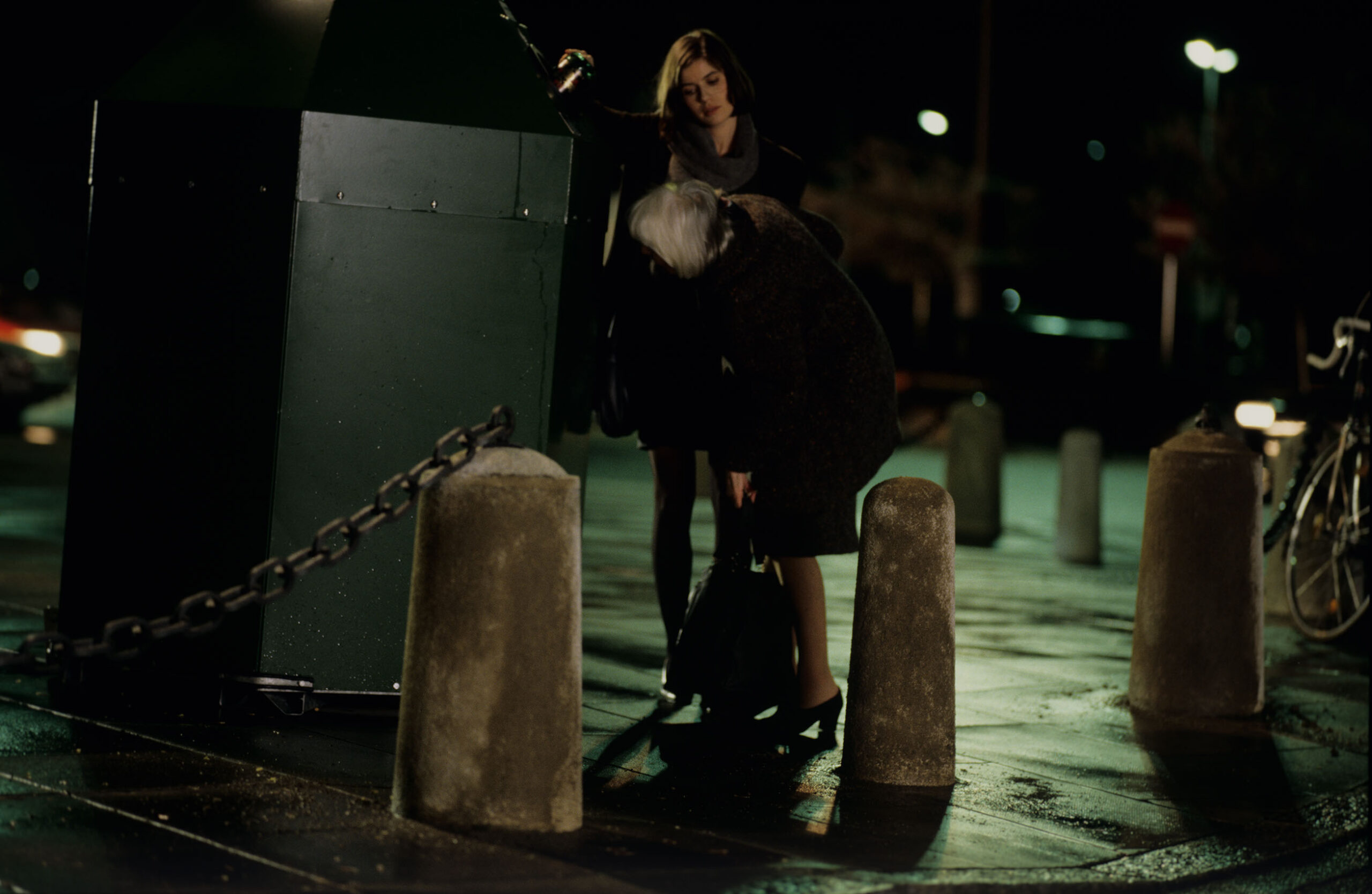 Valentaine (Irene Jacob) pomaga starszej kobiecie wrzucić butelke do pojemnika na surowce wtórne. Podobne sceny wystepują także w pozostałych częściach tryptyku, jednak tylko Valentine nie pozostaje obojętna wobec zmagań kobiety