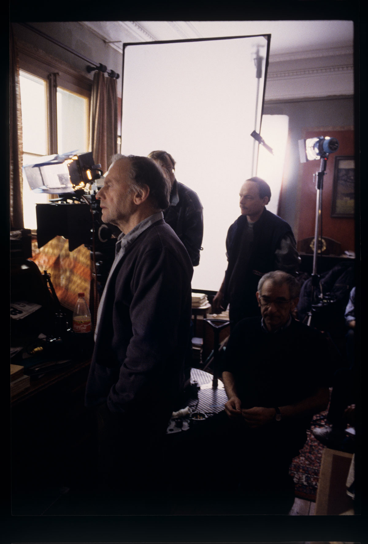 Plan zdjęciowy w mieszkaniu sędziego. Widoczni: Jean-Louis Trintignant jako emerytowany sędzia Joseph Kern, Krzysztof Kieślowski (reżyser), Henryk Jedynak (asystent operatora).