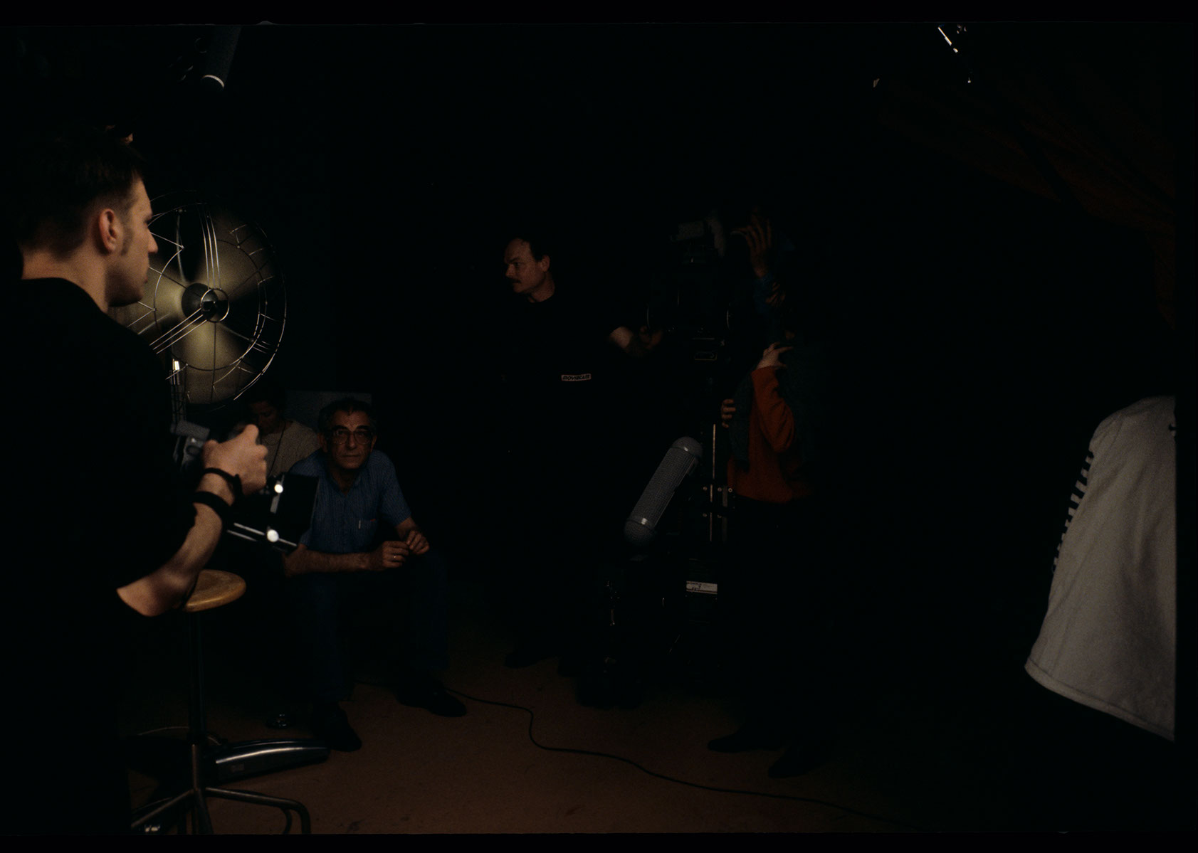 Plan zdjęciowy podczas kręcenia sceny sesji fotograficznej Valentine. Na zdjęciu widoczni: odtwarzający rolę fotografa Samuel Le Bihan, reżyser Krzysztof Kieślowski, asystent operatora Henryk Jedynak.