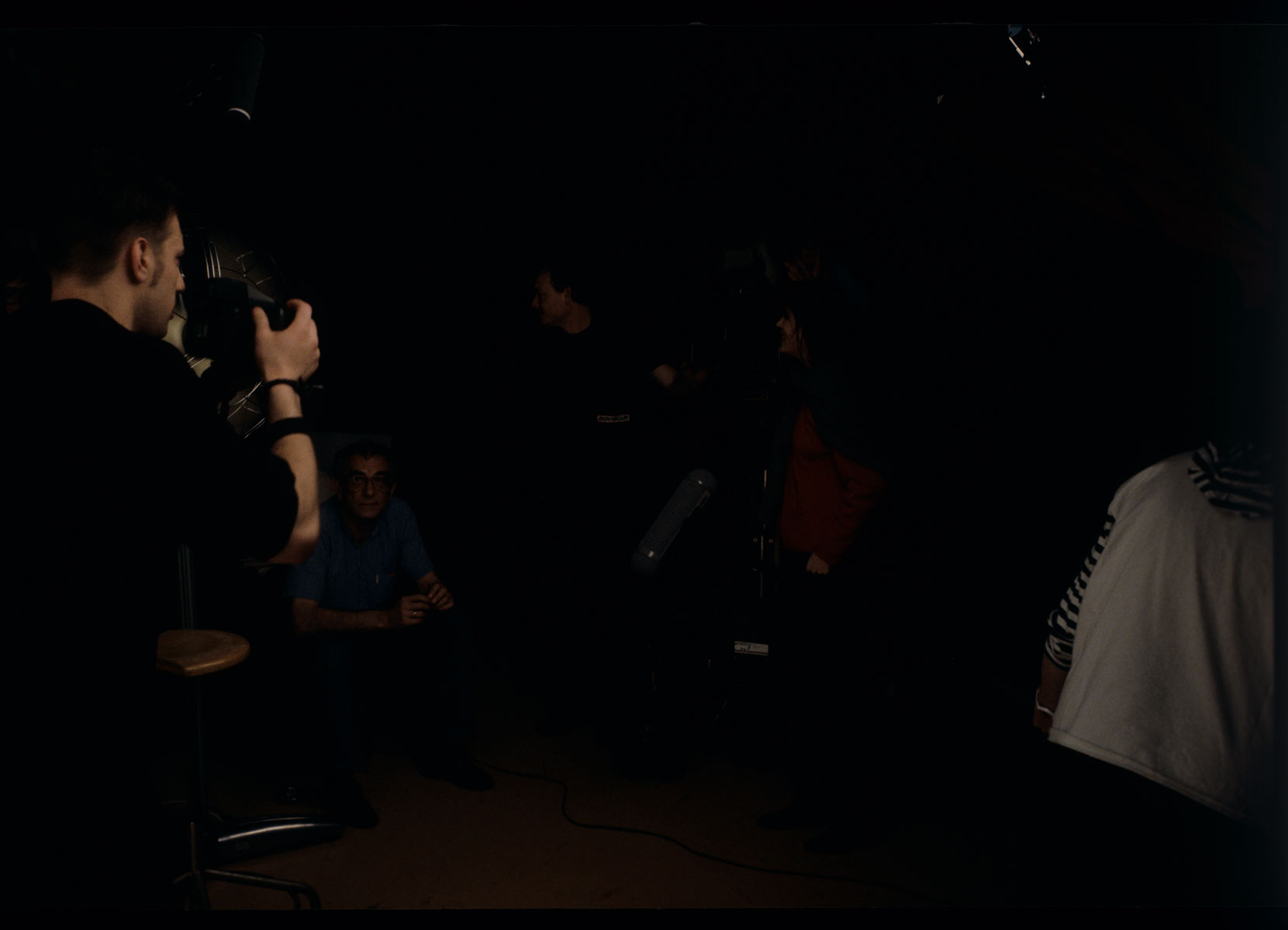 Plan zdjęciowy podczas kręcenia sceny sesji fotograficznej Valentine. Na zdjęciu widoczni: odtwarzający rolę fotografa Samuel Le Bihan, reżyser Krzysztof Kieślowski, asystent operatora Henryk Jedynak.